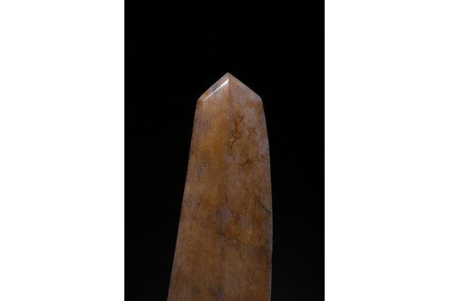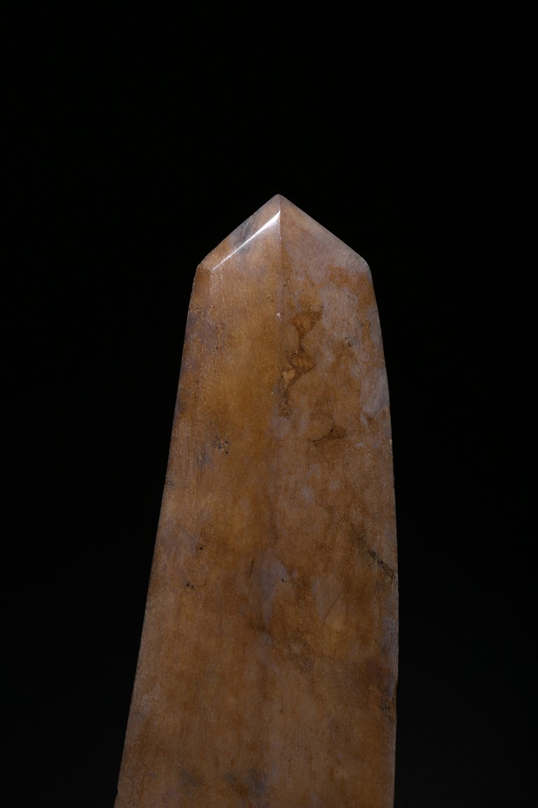 此玉戈沁成淺赭色及白色。稍彎曲,尖形鋒,雙面刃,交接處刻一圈菱格紋,其上鑽有一孔。 來源: 洛杉磯Laguna Beach陳氏家族收藏