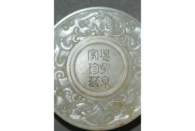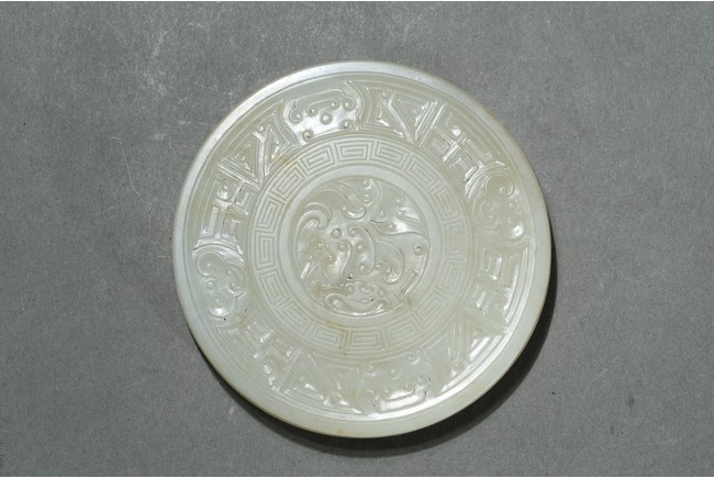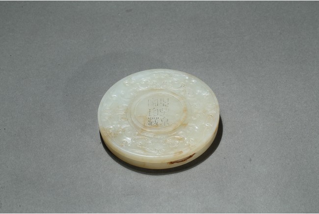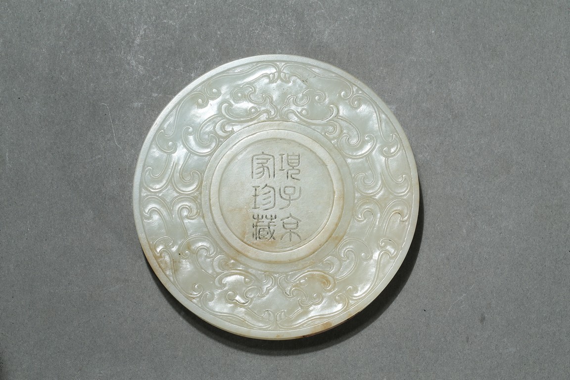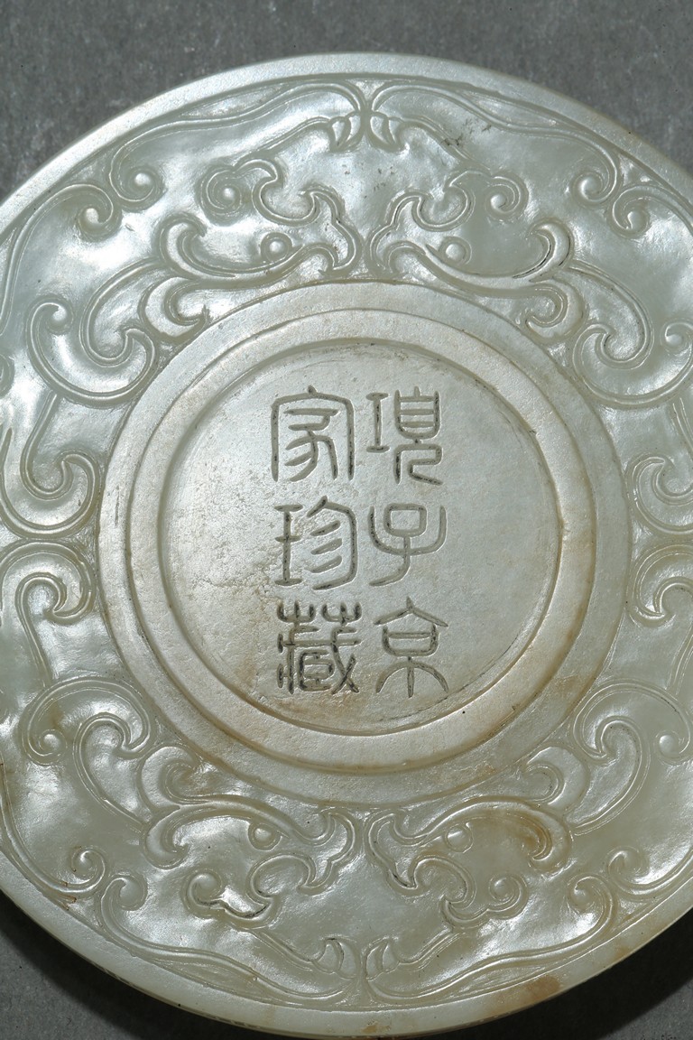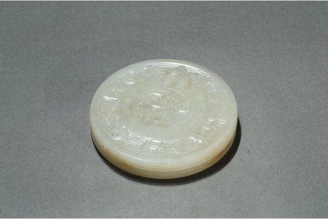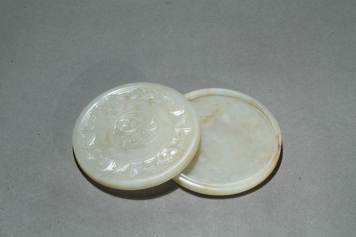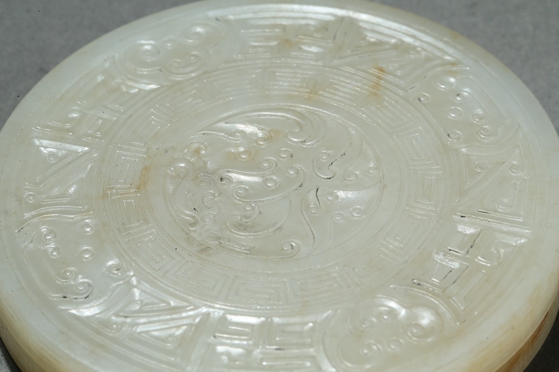 Of circular form, the cover carved to the center with a roundel enclosing archaistic pattern surrounded by key-fret pattern, the outer carved with alternating ruyi-head and scrolled geometric pattern, the stone is of even white tone, the base incised with six character mark surrounded by archaistic mythical beast pattern.
