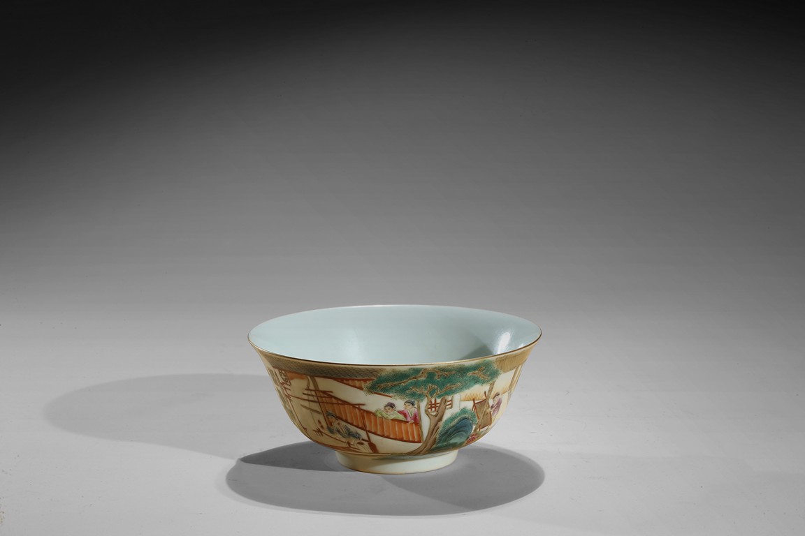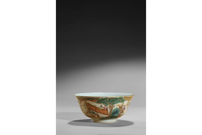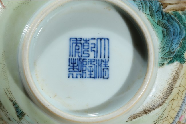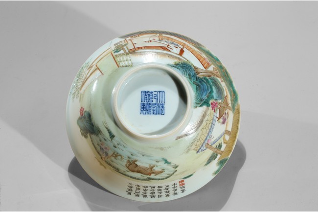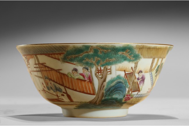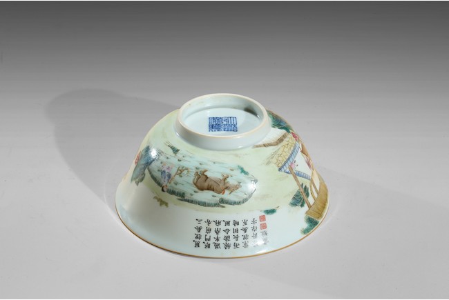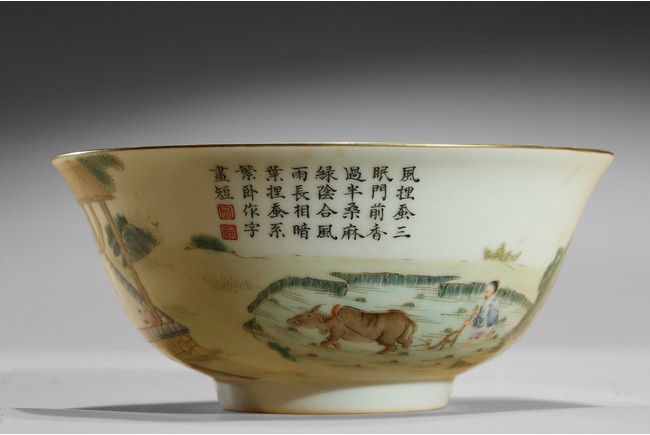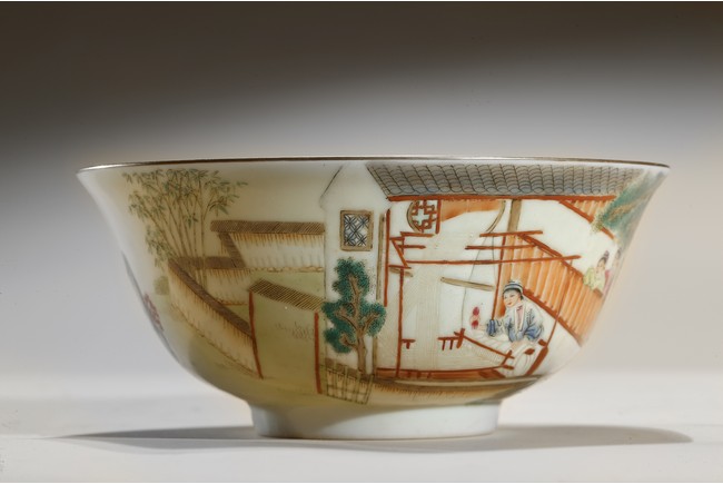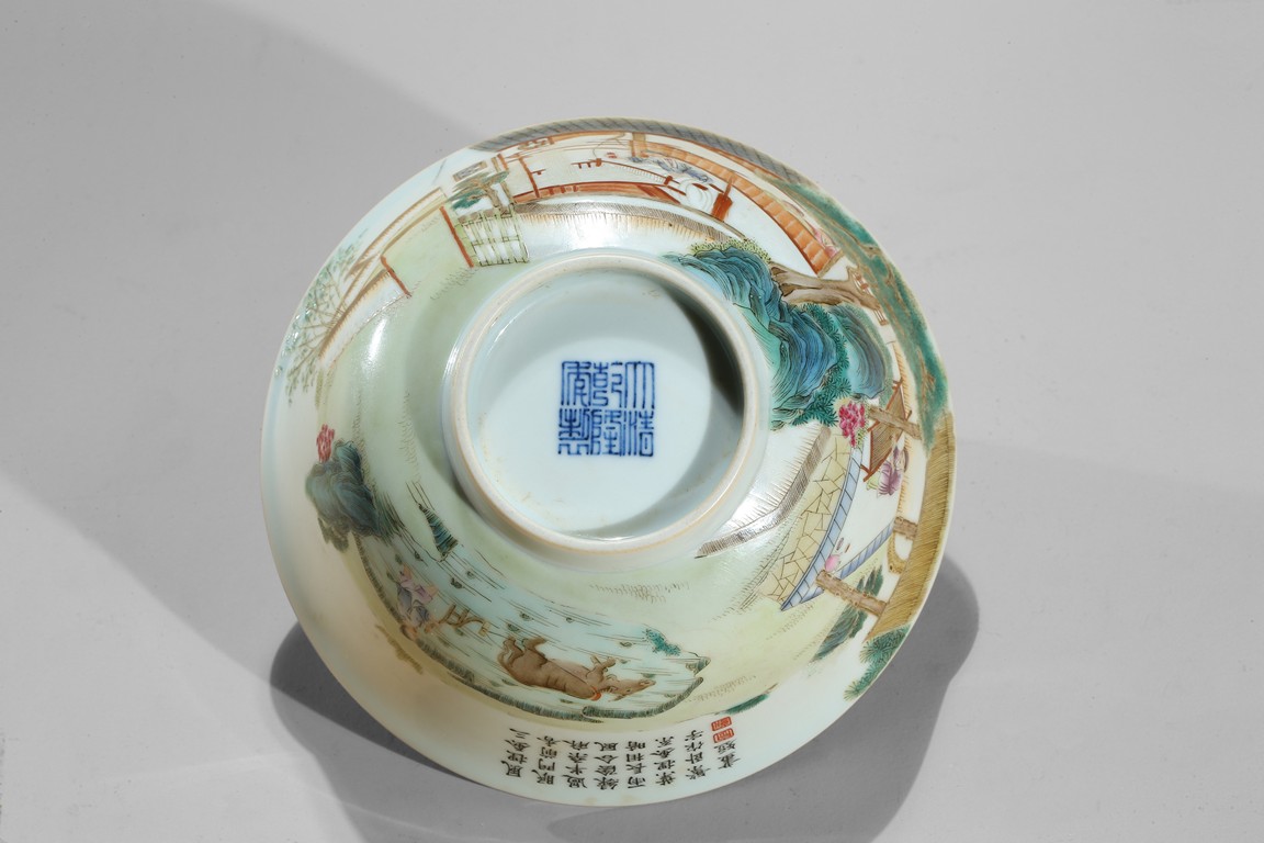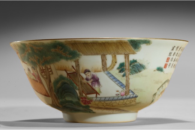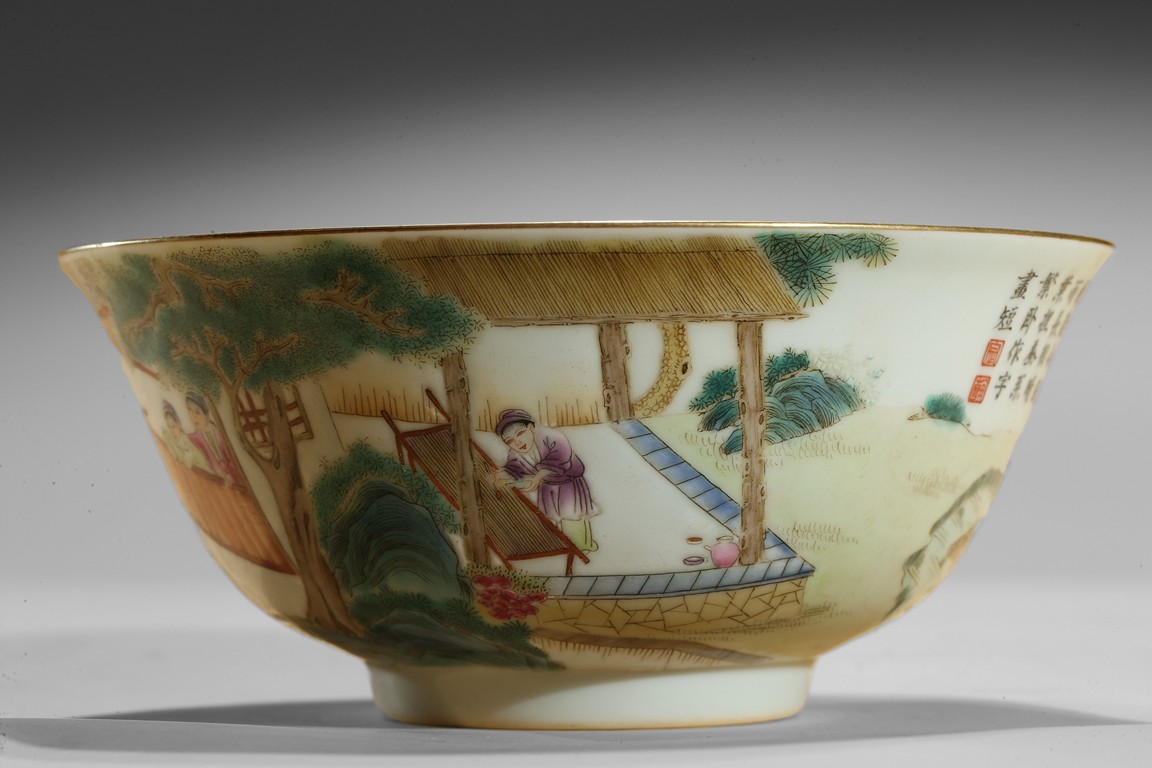 Supported on a short circular foot, the body rising to a slightly flared mouth rim, finely enamelled to the exterior with a continuous landscape of village scene depicting the different stages involved in tilling and weaving, with inscriptions and seal marks complementing the scenes depicted. The base with six character QIANLONG mark. Qing Dynasty period.