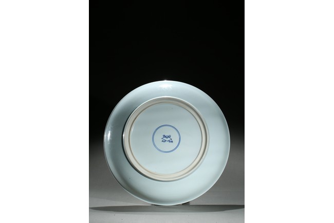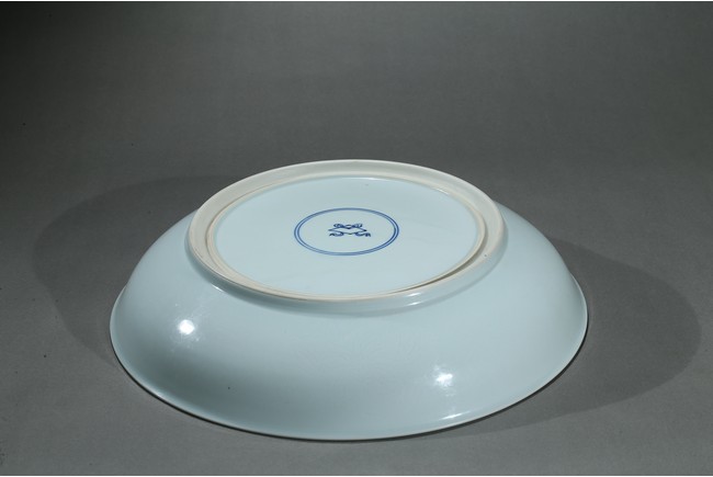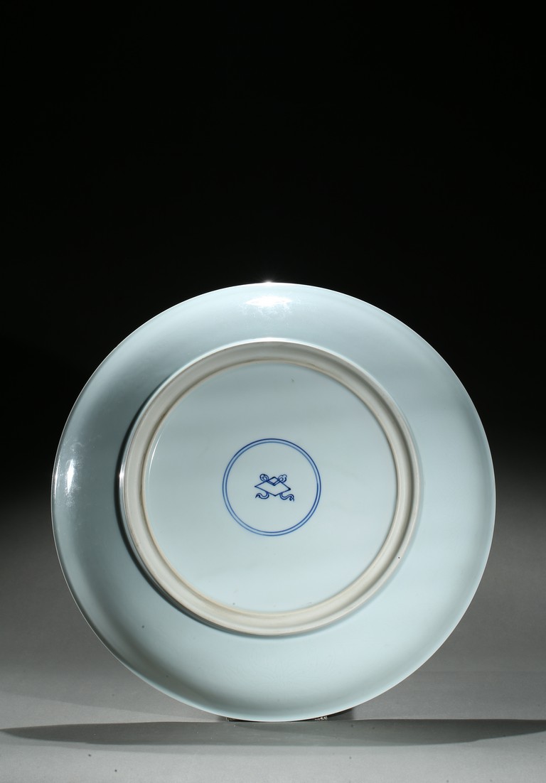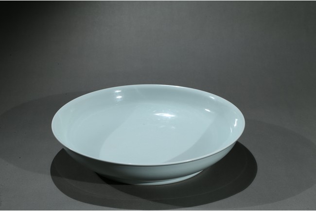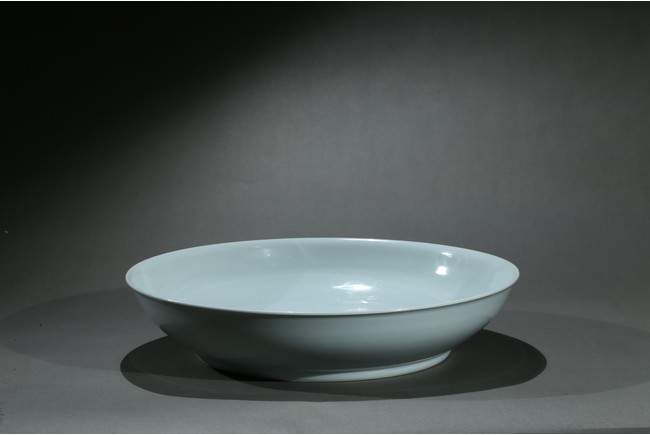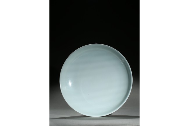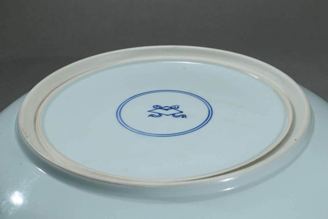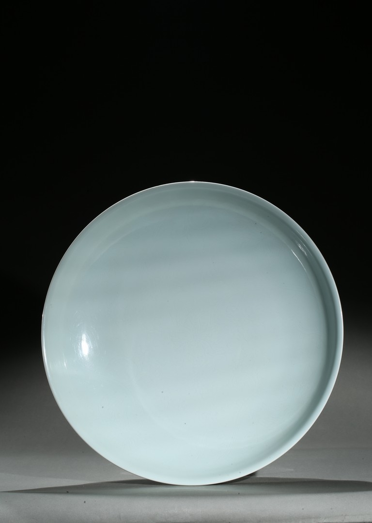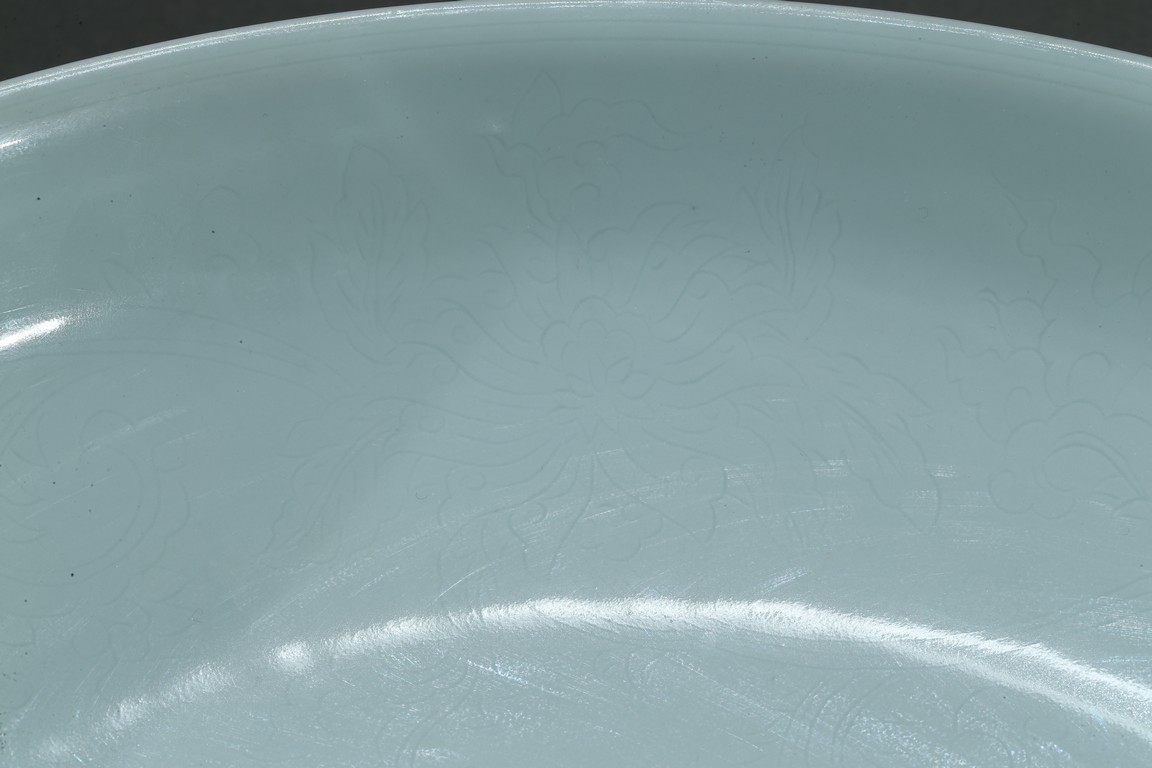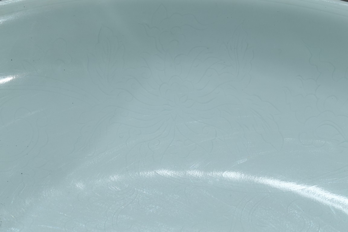 The dish covered applied with even and attractive 'tianbai' white glaze, the interior finely incised in anhua with foliate lotus scrolls, the underside with a pictogram mark. Qing Dynasty period.