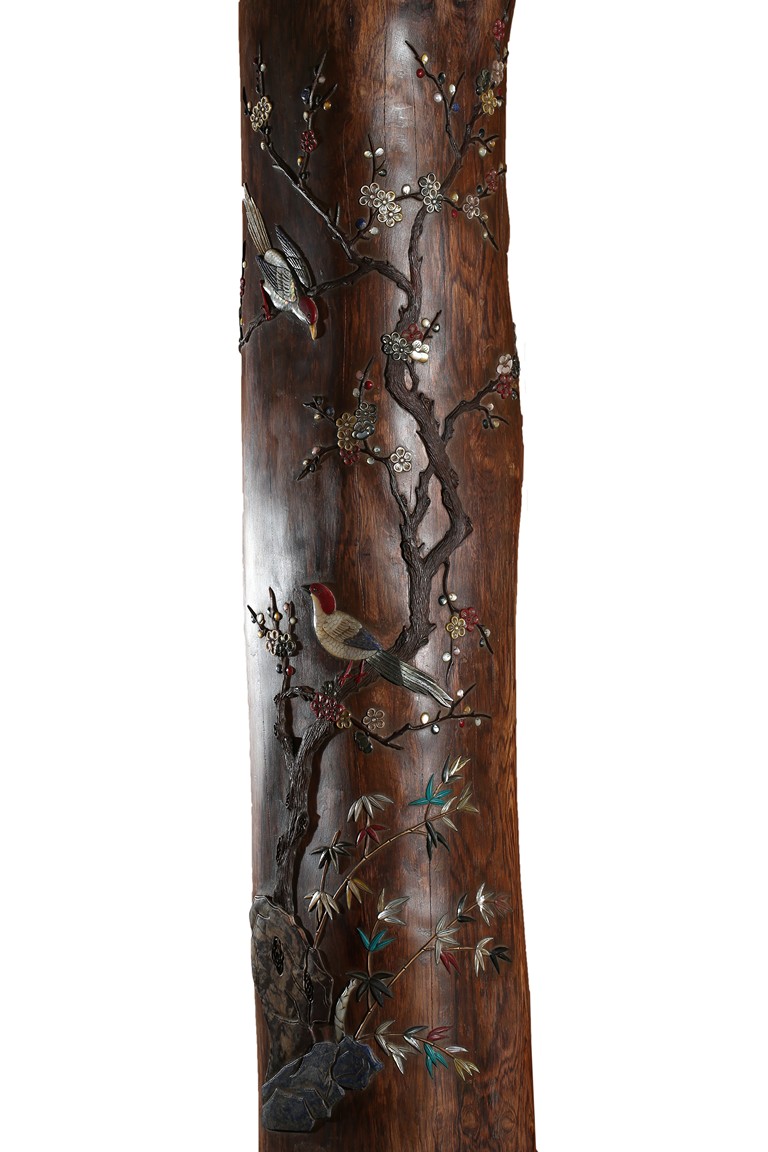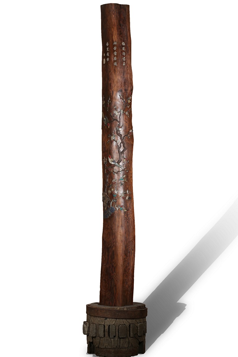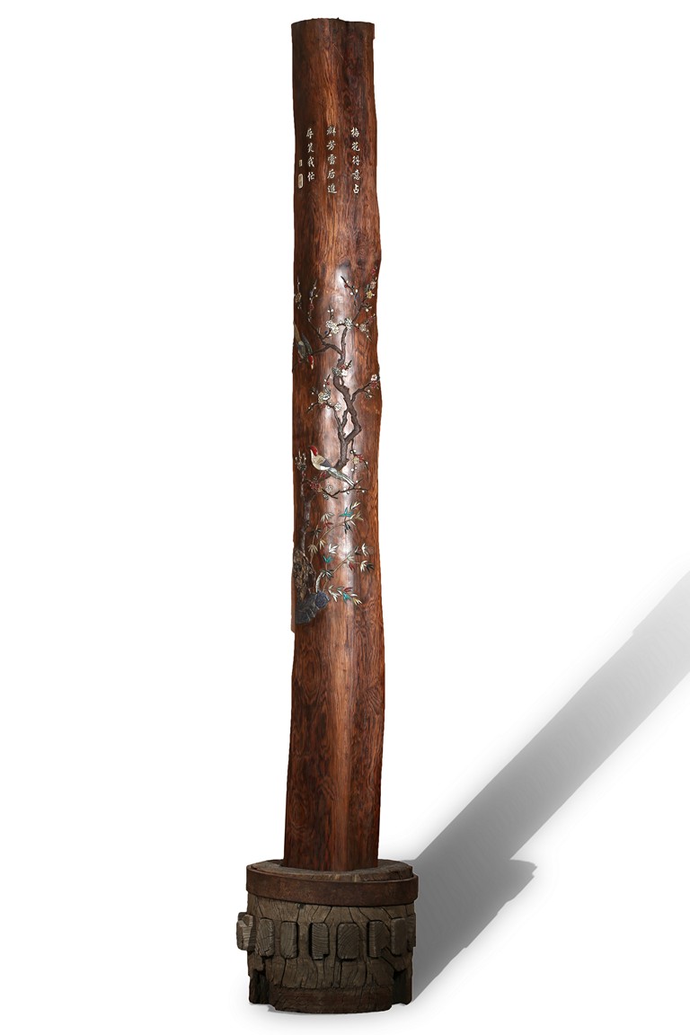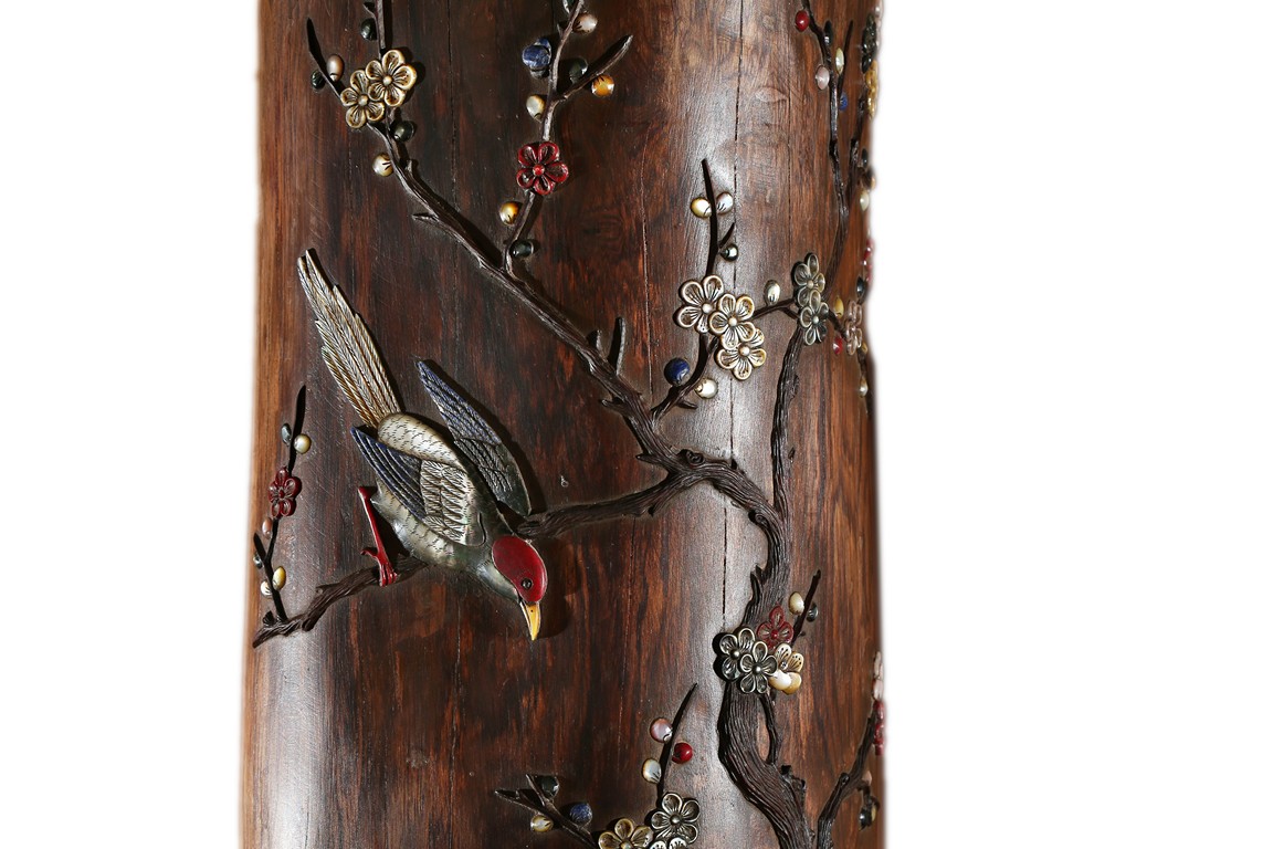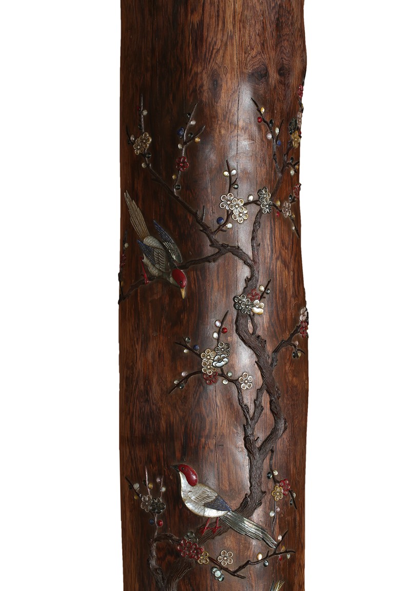 The Huanghuali raw log embellished in mother of pearl, agate, turquoise, jades, depicting magpies on plum blossom, with inscription and seal marks, all fitted on a wood stand.