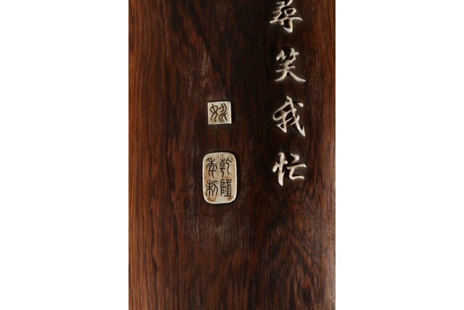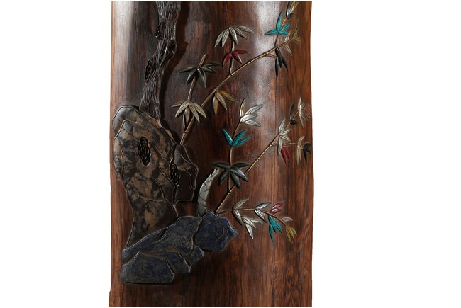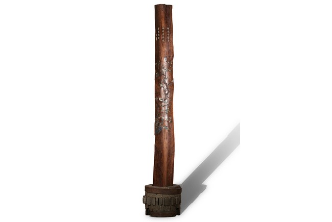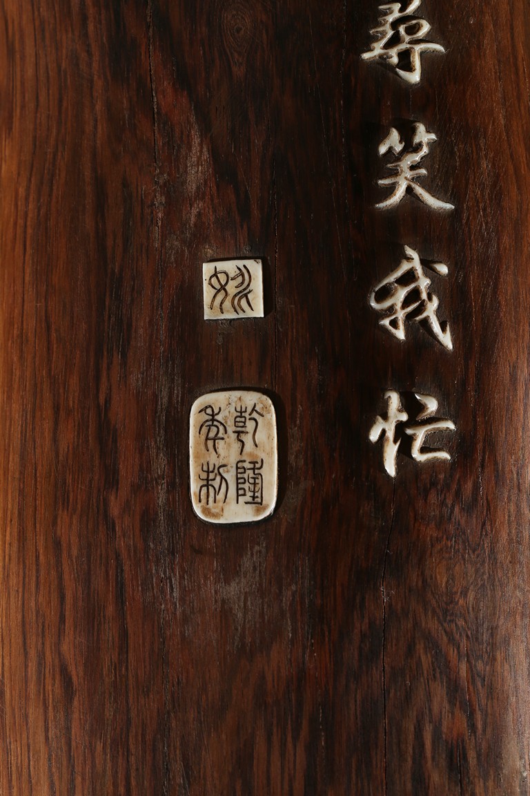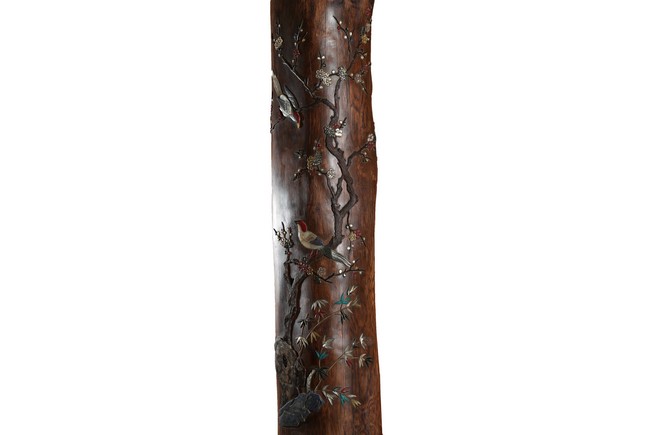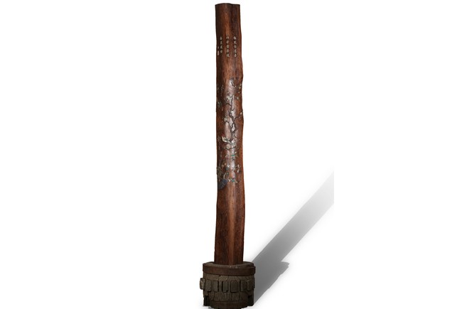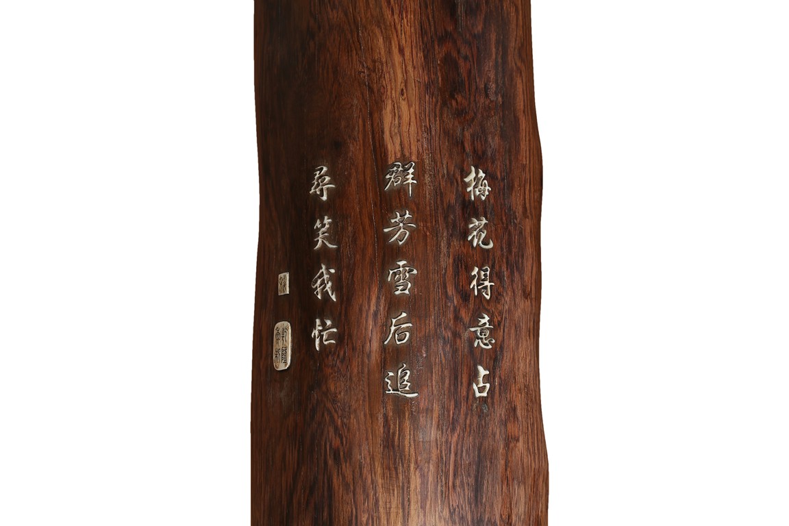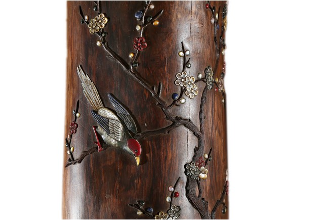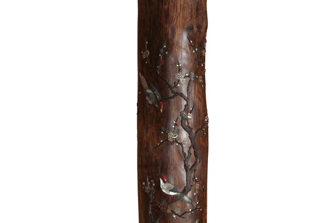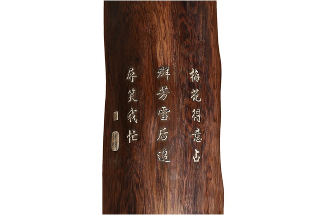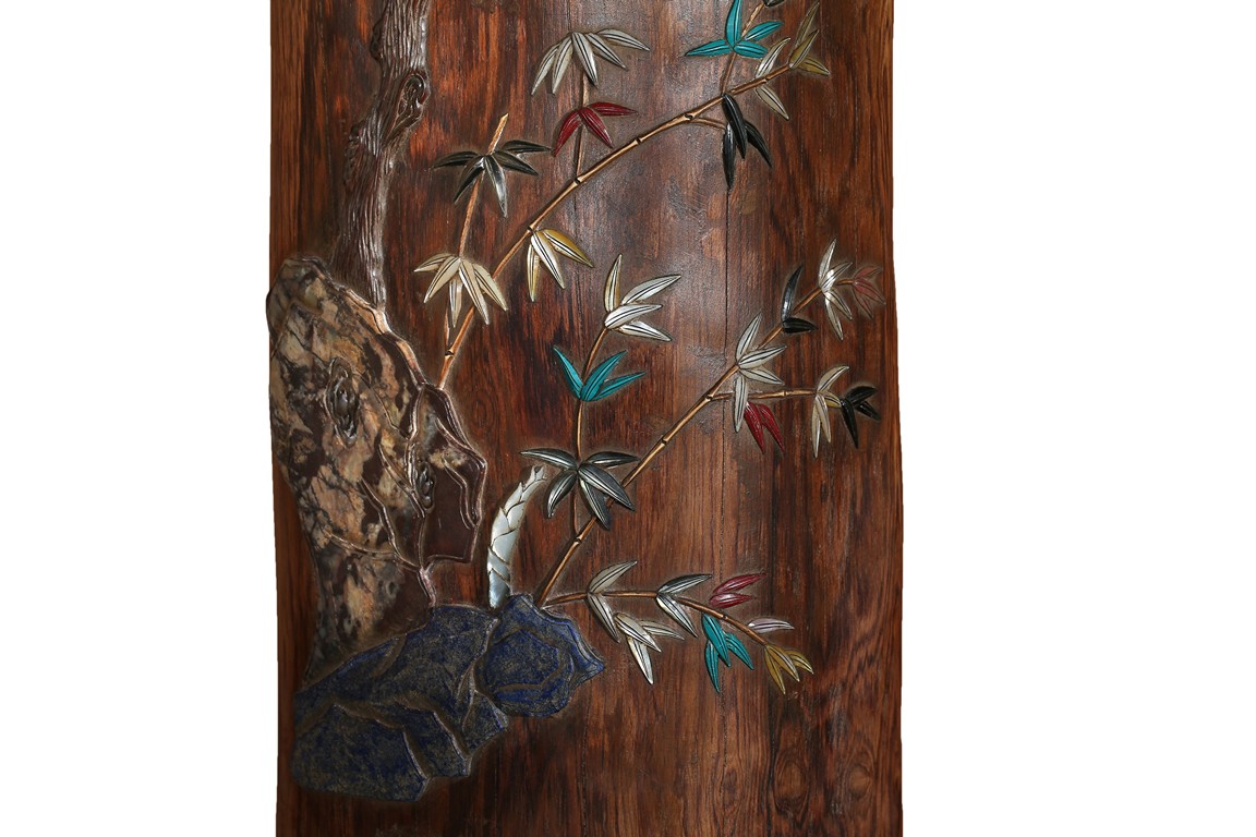 The Huanghuali raw log embellished in mother of pearl, agate, turquoise, jades, depicting magpies on plum blossom, with inscription and seal marks, all fitted on a wood stand.