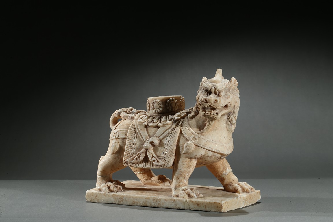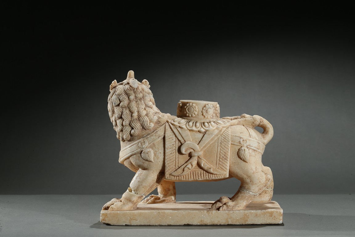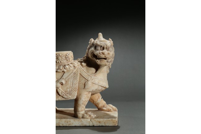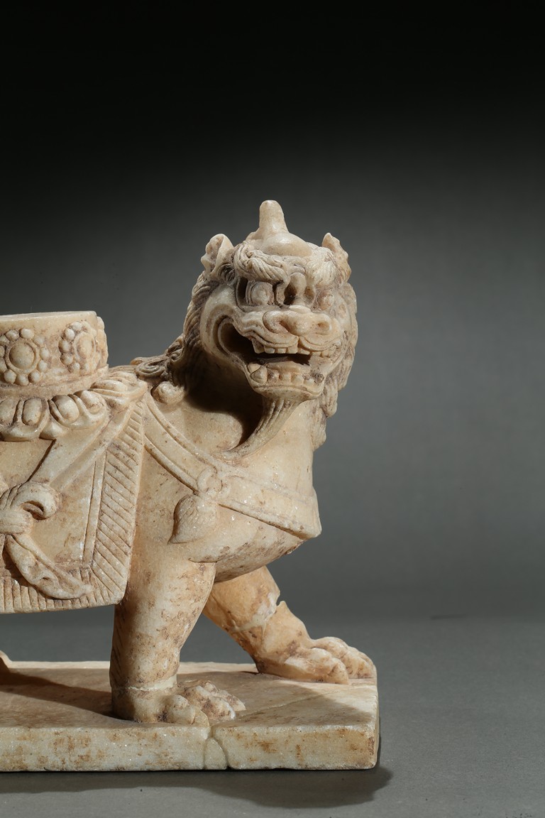 Boldly carved standing foursquare, head slightly turned to the right, the face with open mouth, bared fangs, he eyes with furrowed expression and the mane in tight curls, supporting a circular stand. Ming Dynasty period.