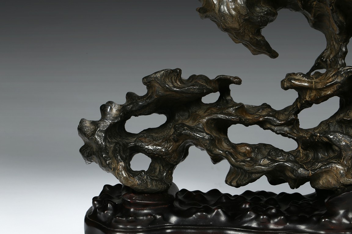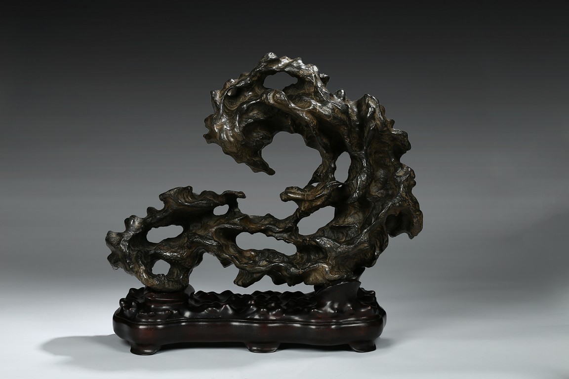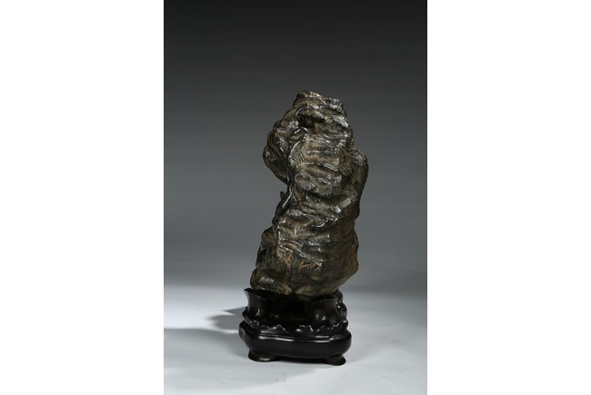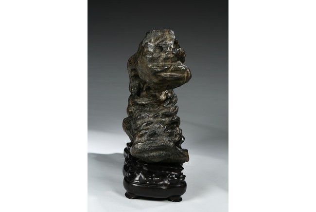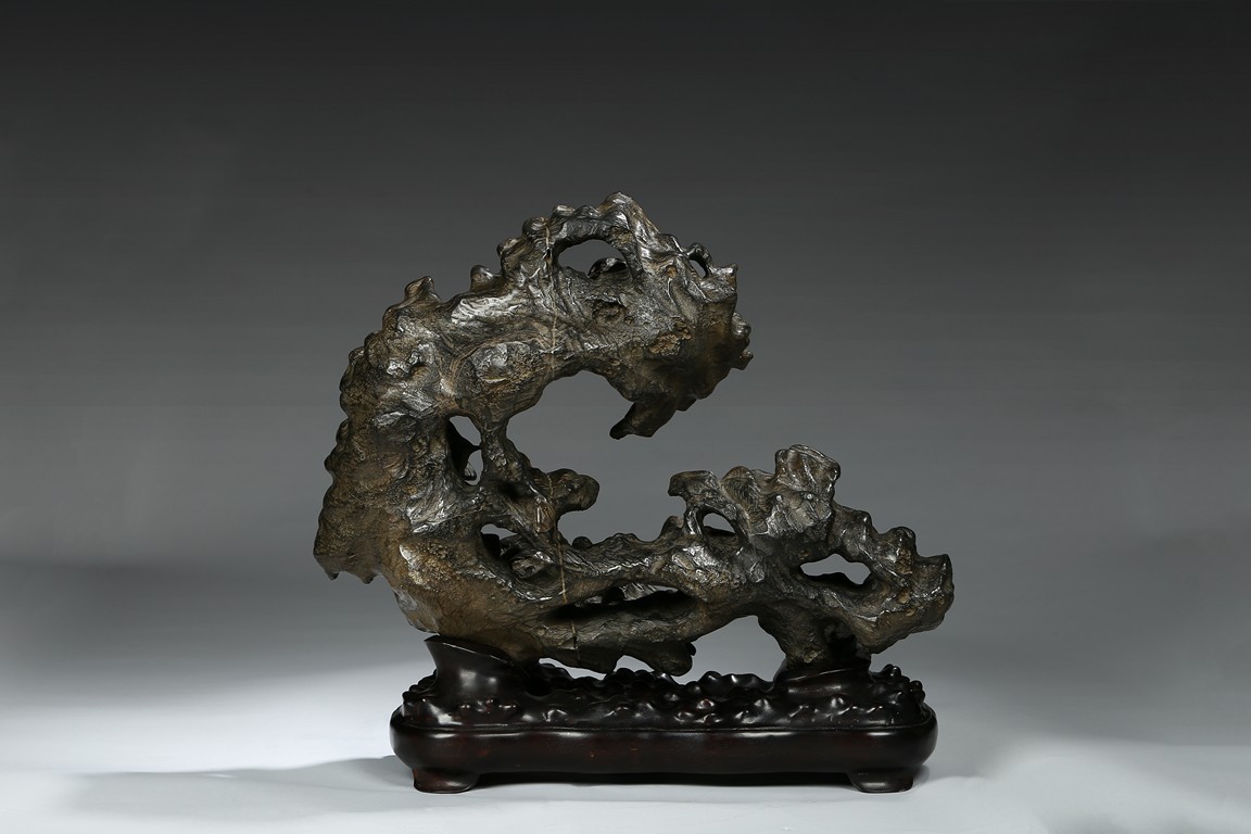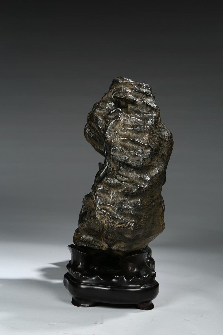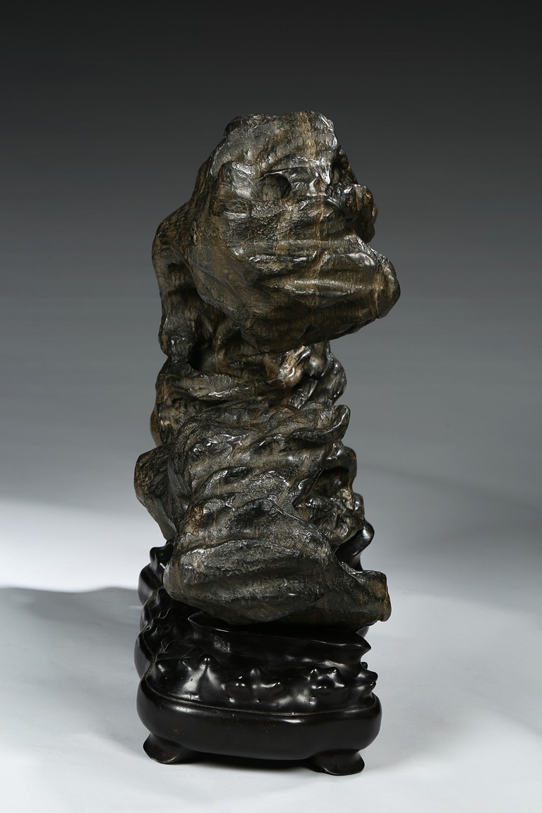Rising up from fitted hardwood stand like dragon emerging from ocean with head turned to back, the irregular surface of a smooth gray color interspersed with vertical white calcitic veining. Qing Dynasty period.