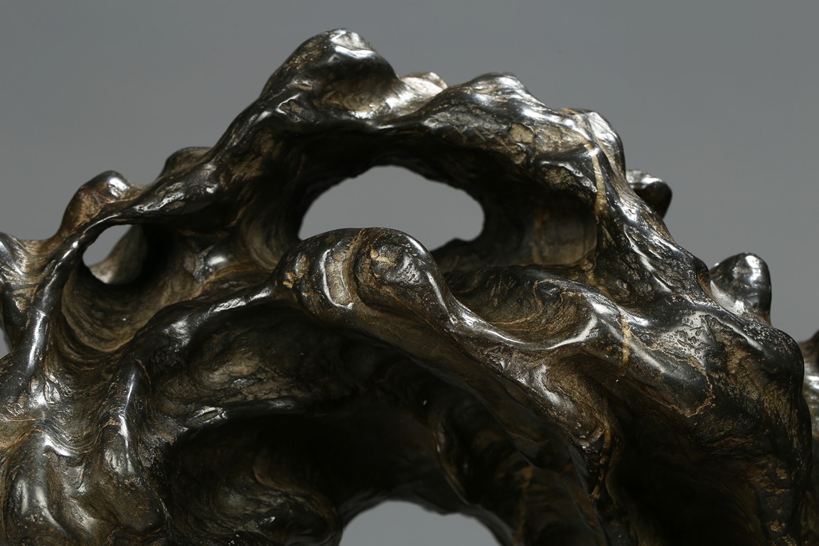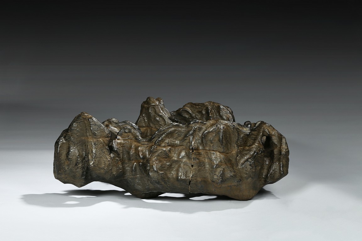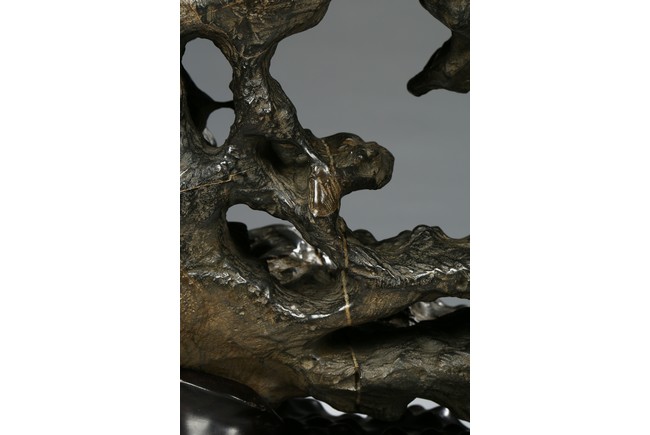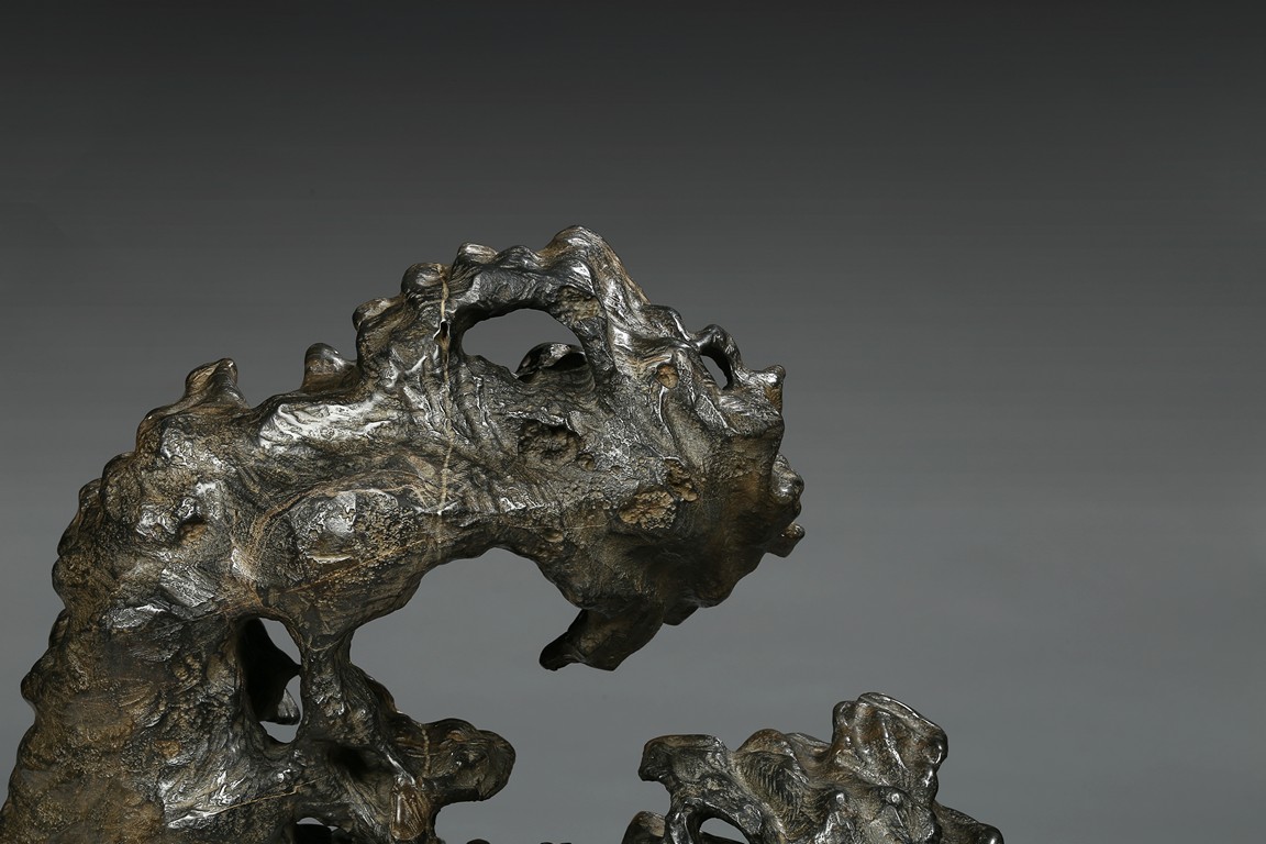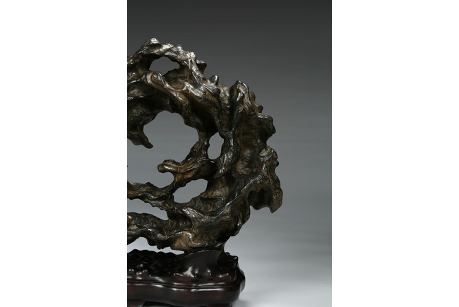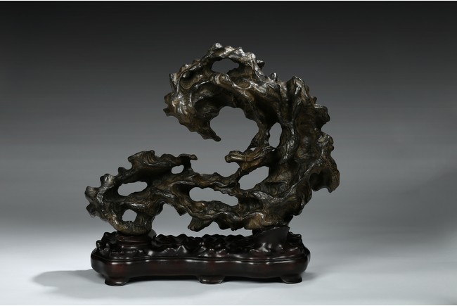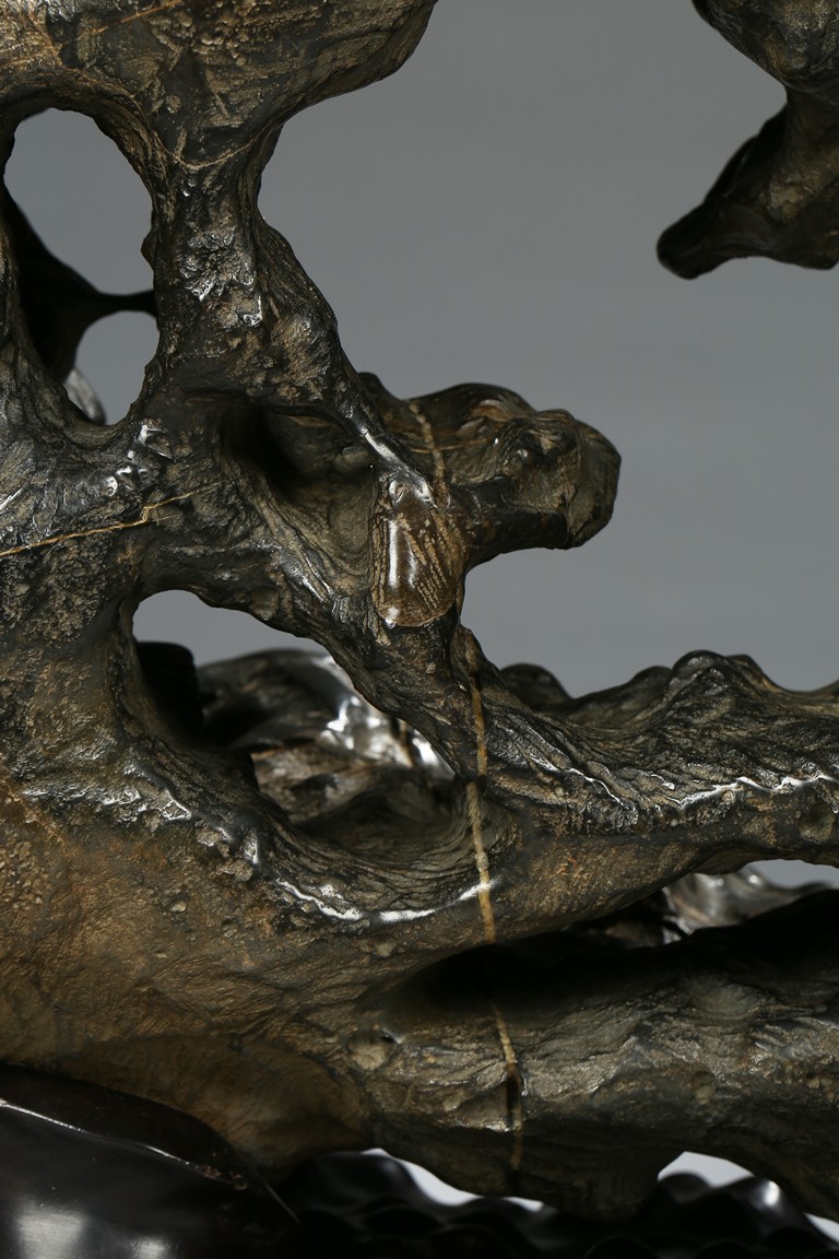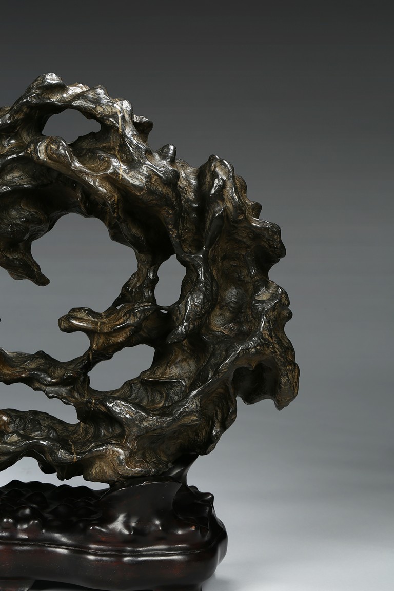 Rising up from fitted hardwood stand like dragon emerging from ocean with head turned to back, the irregular surface of a smooth gray color interspersed with vertical white calcitic veining. Qing Dynasty period.