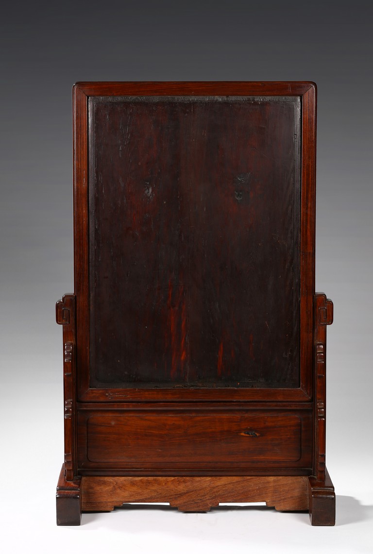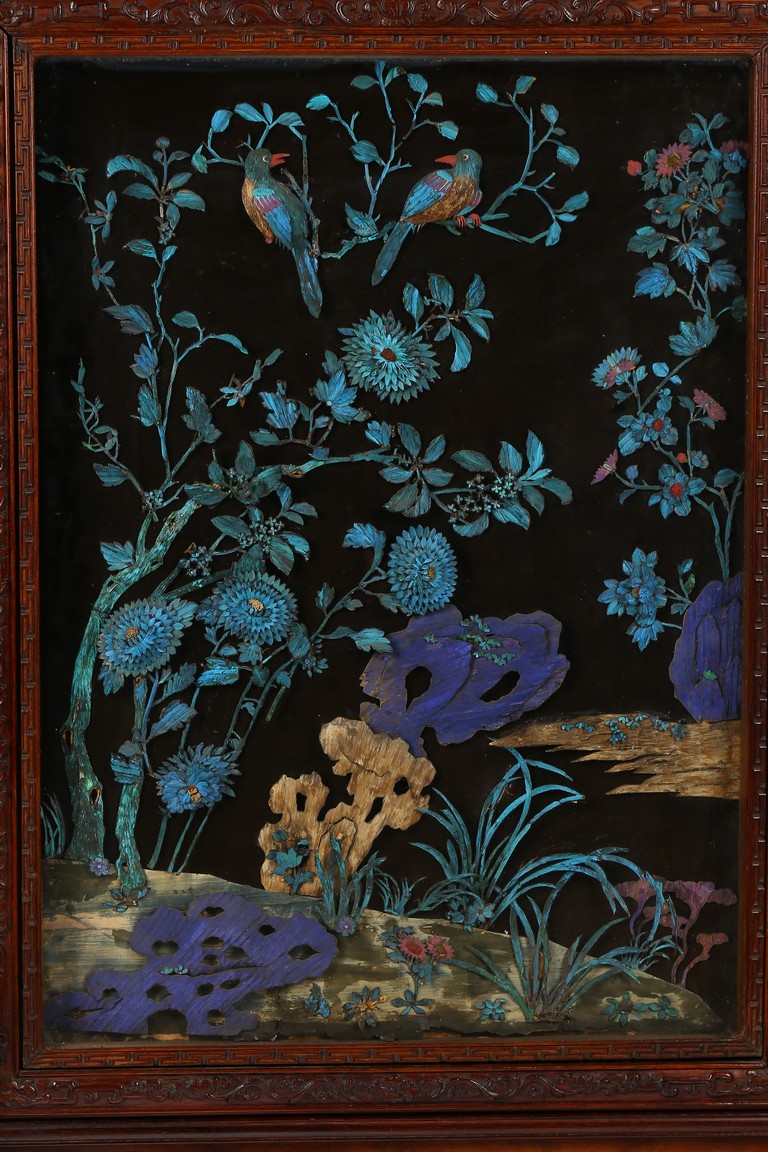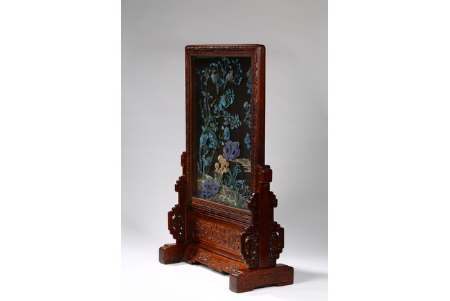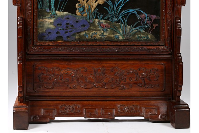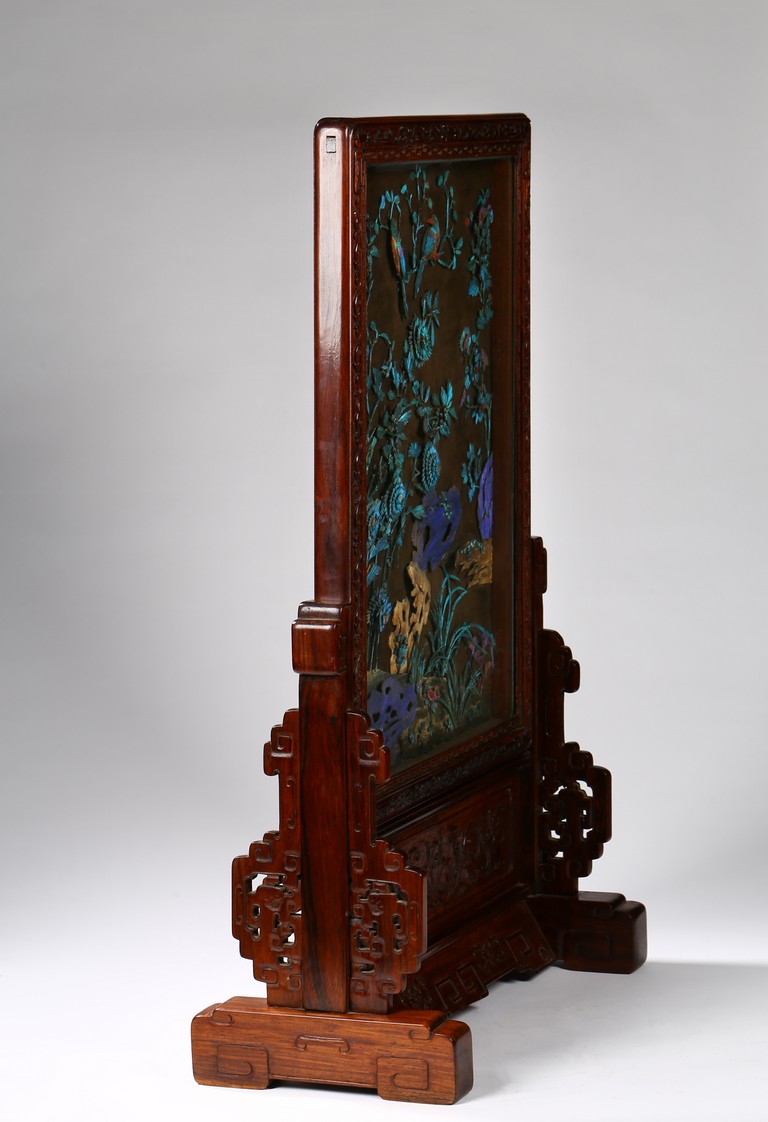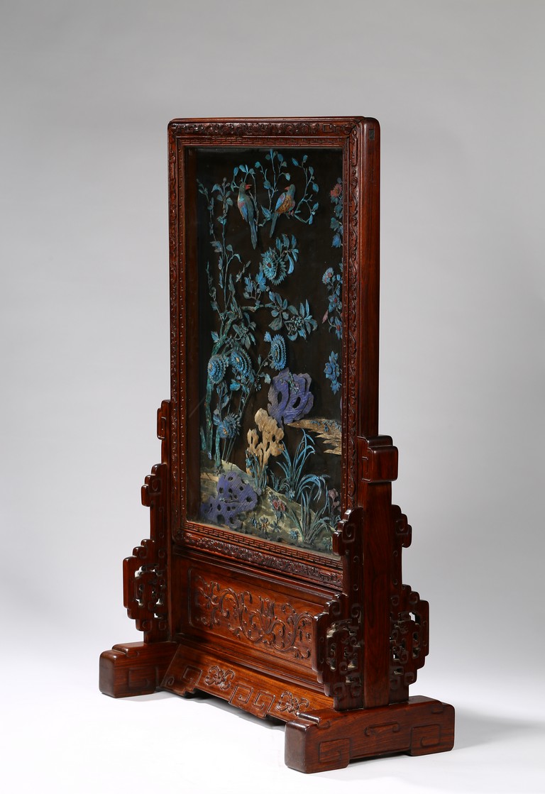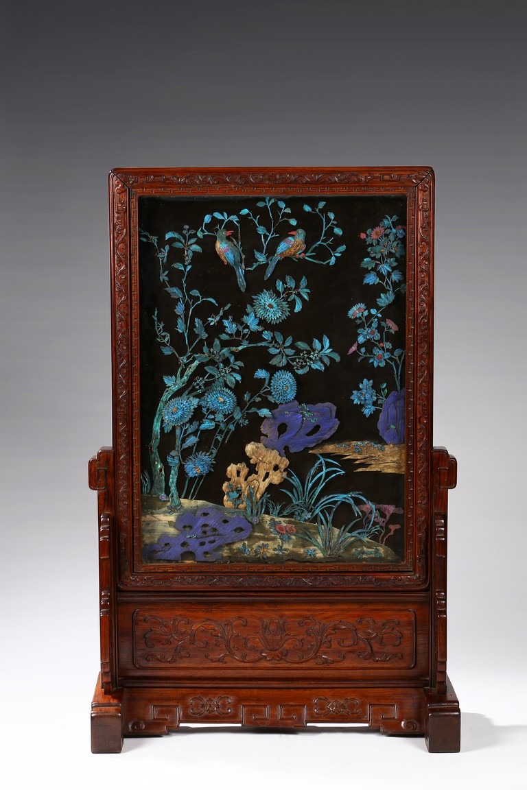 Of upright rectangular shape, the panel is finely decorated with a pair of birds perching on a branch above various flowers including chrysanthemum, narcissus, and lingzhi, along with irregular rockwork on the bottom, the side with flowering branch issuing from rock, all crafted in kingfisher and other feathers of turquoise, purple, and golden tones. The hongmu frame is carved with stylized scrolling branch pattern in relief, the inner border with key-fret pattern. Qing Dynasty Daoguang period.