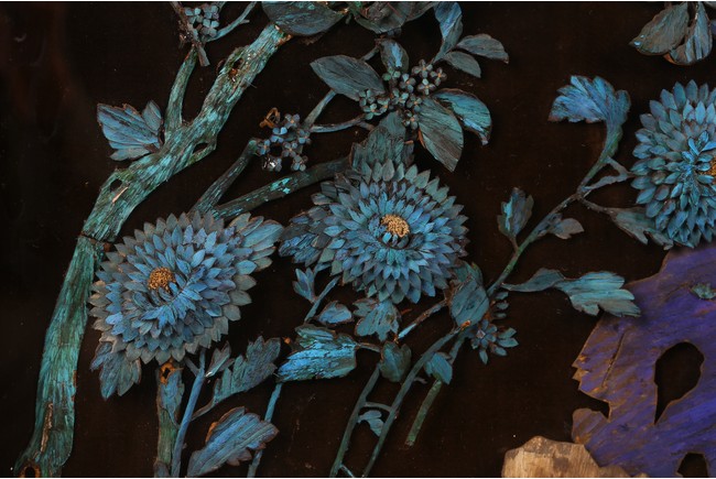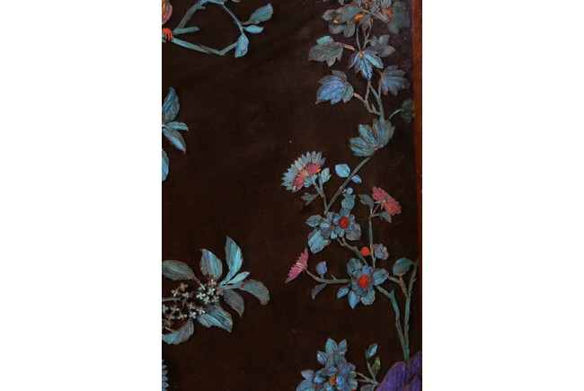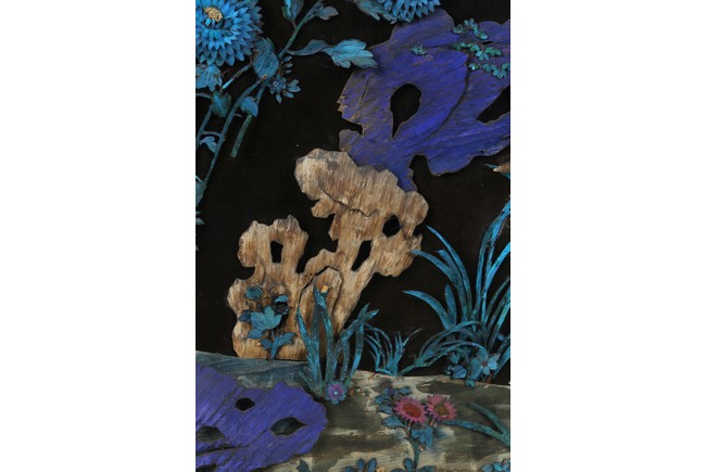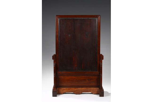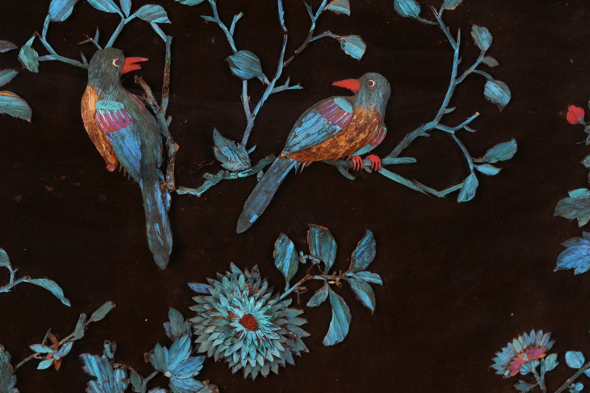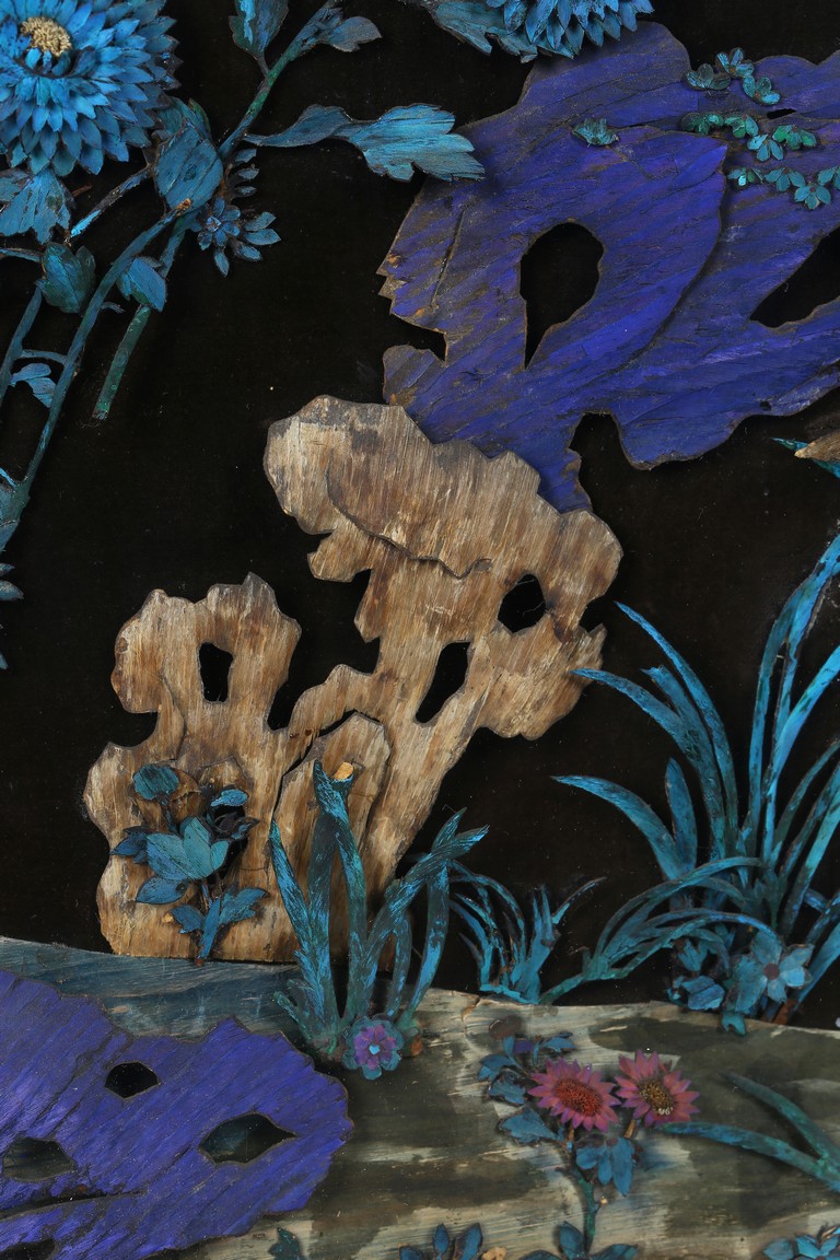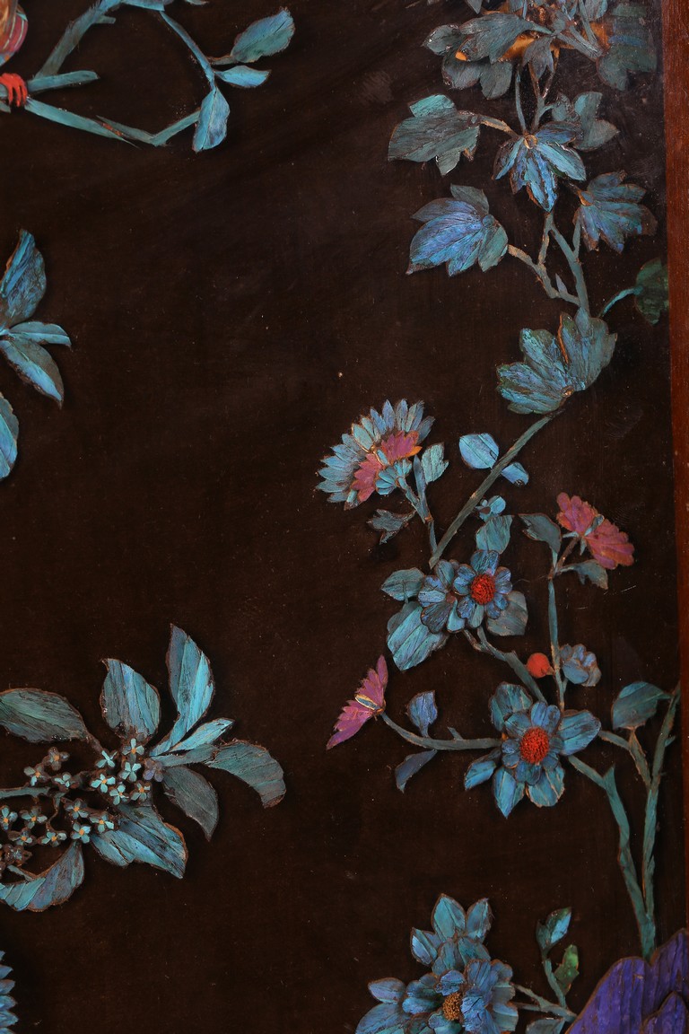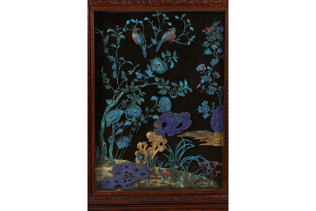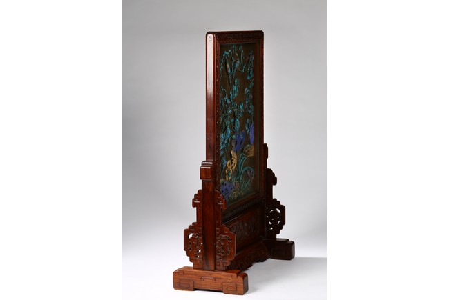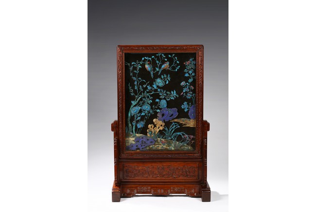 Of upright rectangular shape, the panel is finely decorated with a pair of birds perching on a branch above various flowers including chrysanthemum, narcissus, and lingzhi, along with irregular rockwork on the bottom, the side with flowering branch issuing from rock, all crafted in kingfisher and other feathers of turquoise, purple, and golden tones. The hongmu frame is carved with stylized scrolling branch pattern in relief, the inner border with key-fret pattern. Qing Dynasty Daoguang period.