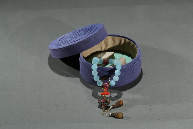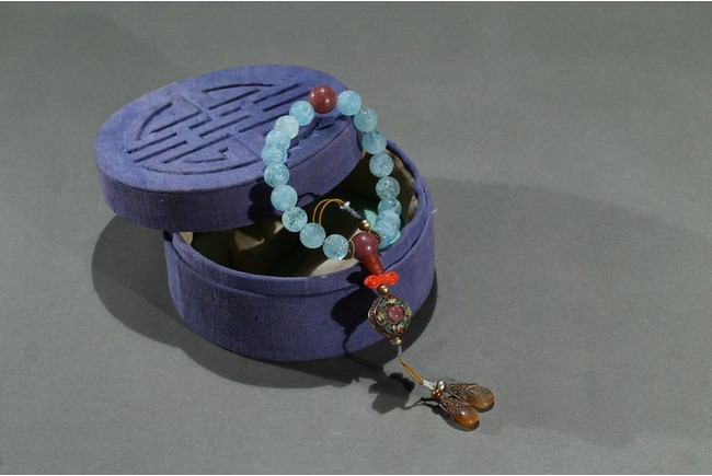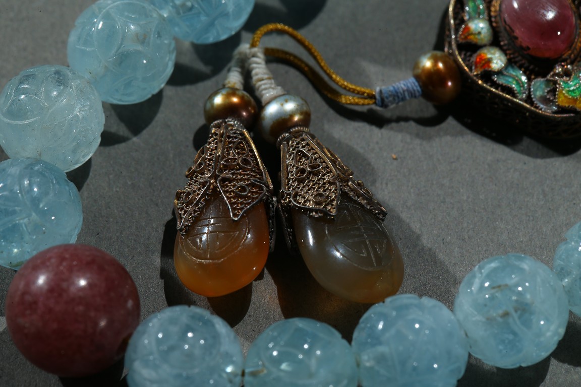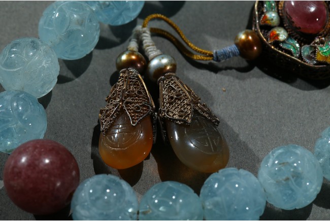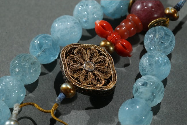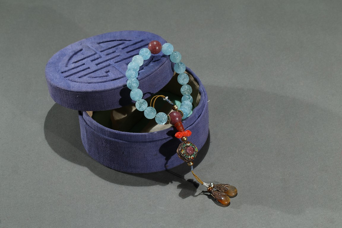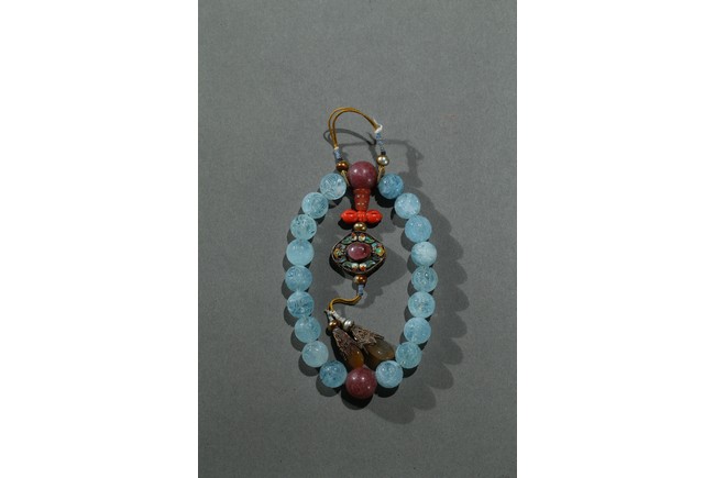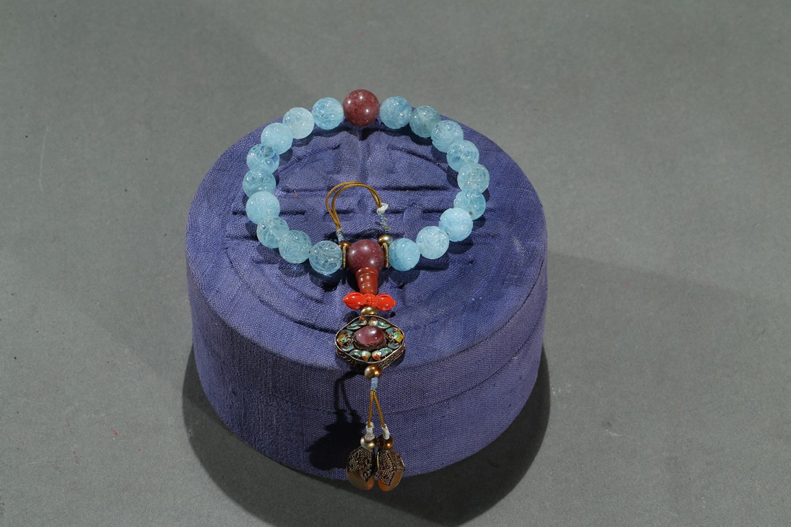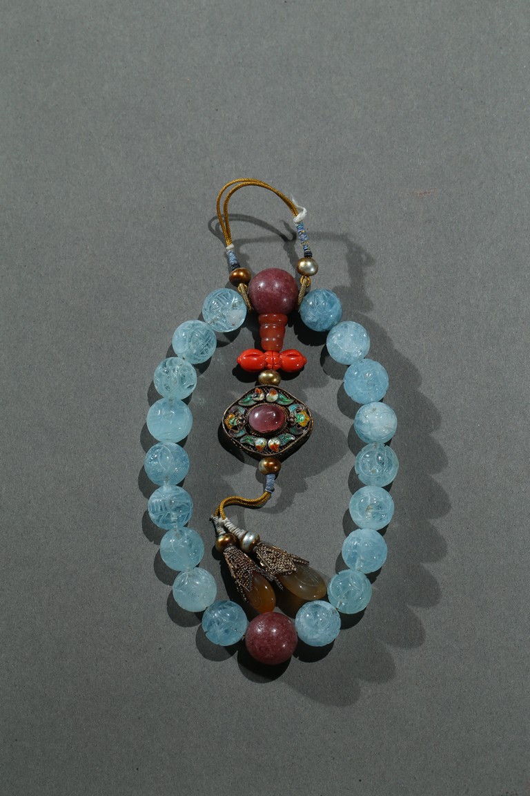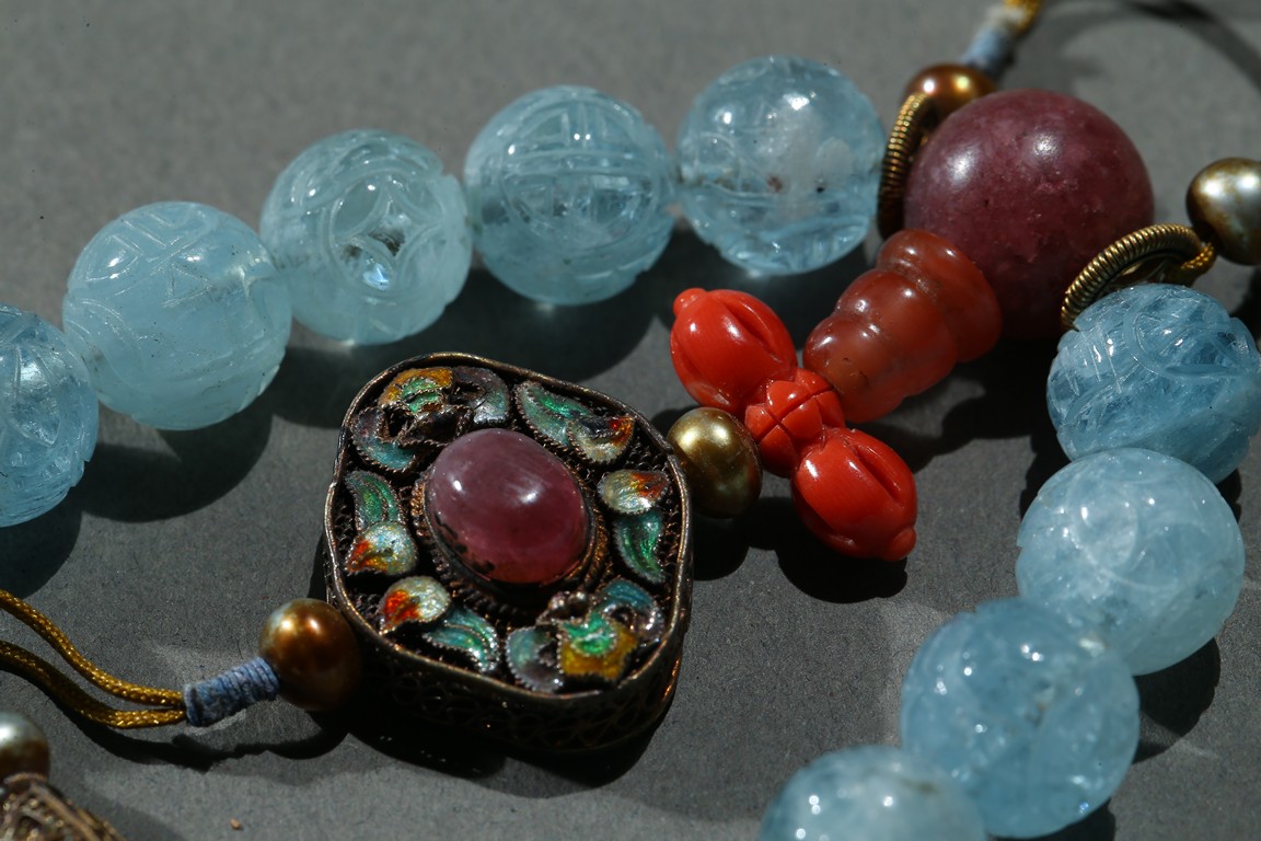 The rosary-bracelet comprises eighteen large aquamarine beads, a larger central tourmaline bead and a coral carved double-vajra bead suspending a tourmaline inlaid cloisonne plaque, terminating in two agate drop-shaped beads. Accompanied with box. Qing Dynasty period.