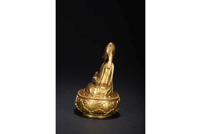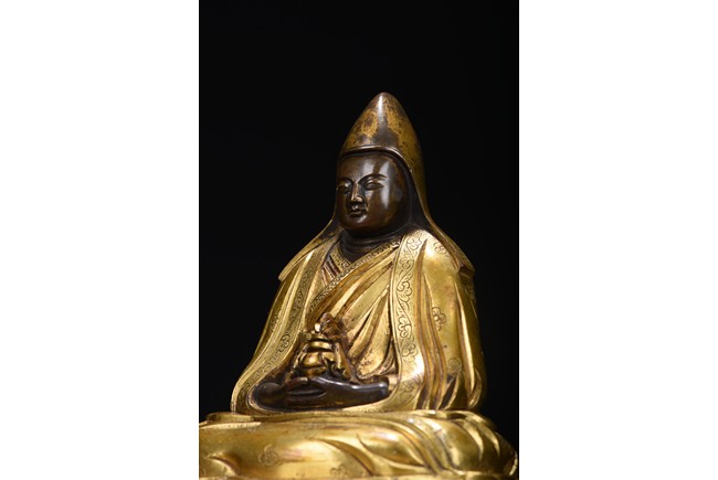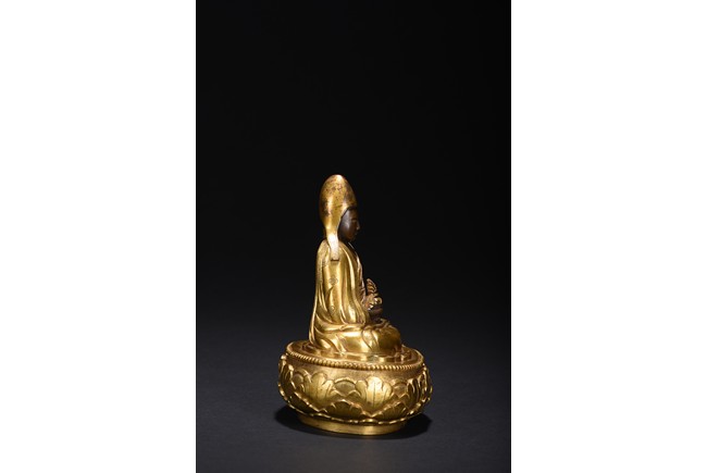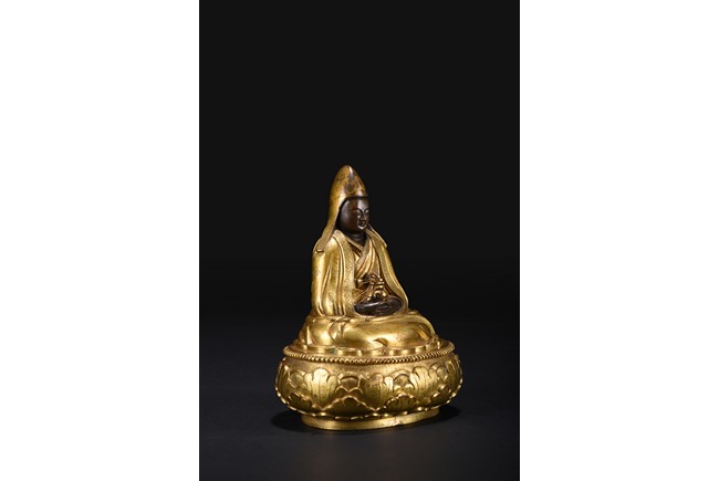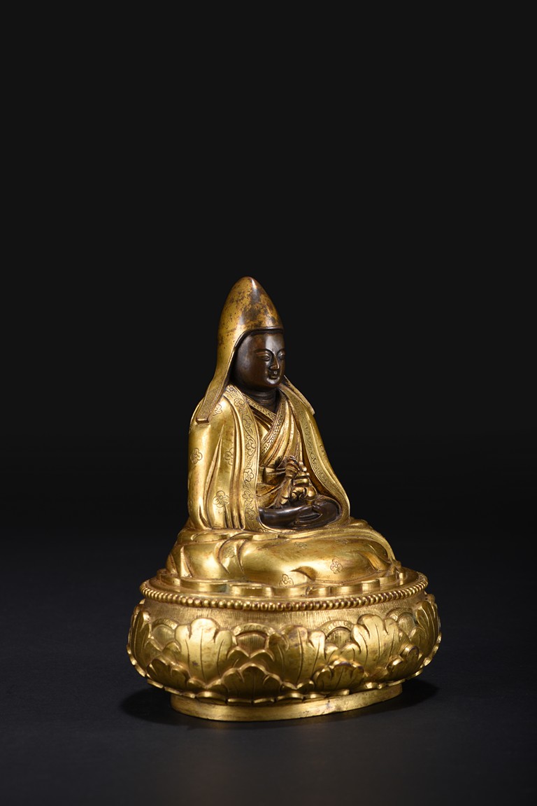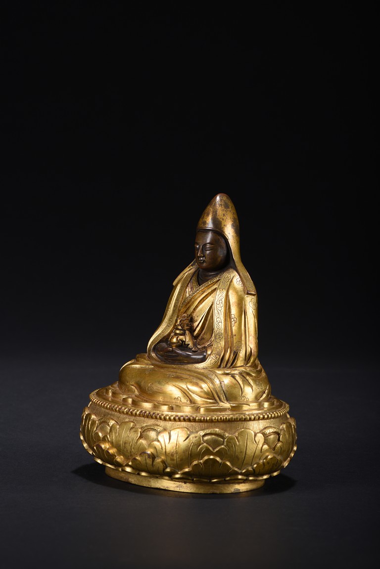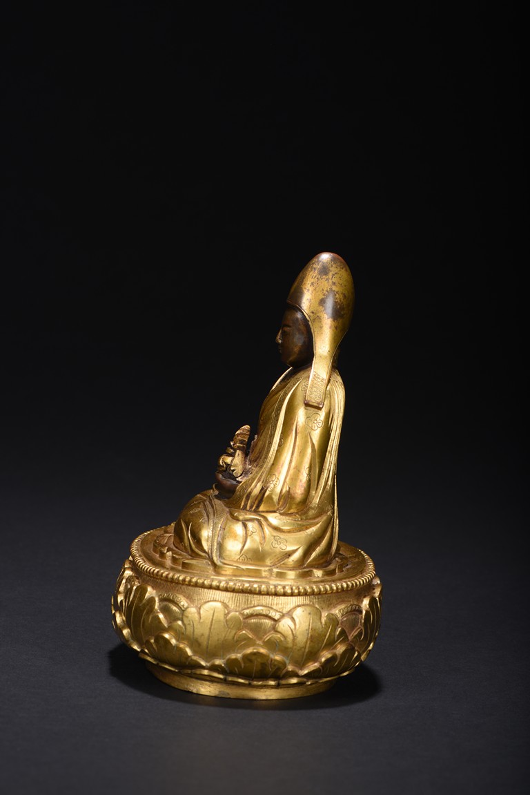 Mongolian zanabar school. Seated on a lotus flower base, both hands resting on his lap supporting a kalasa, wearing a finely incised robe and mantle covering both shoulders and legs, his head covered with a hat of the Gelugpa school. Base sealed and incised with a double vajra. 19th century.