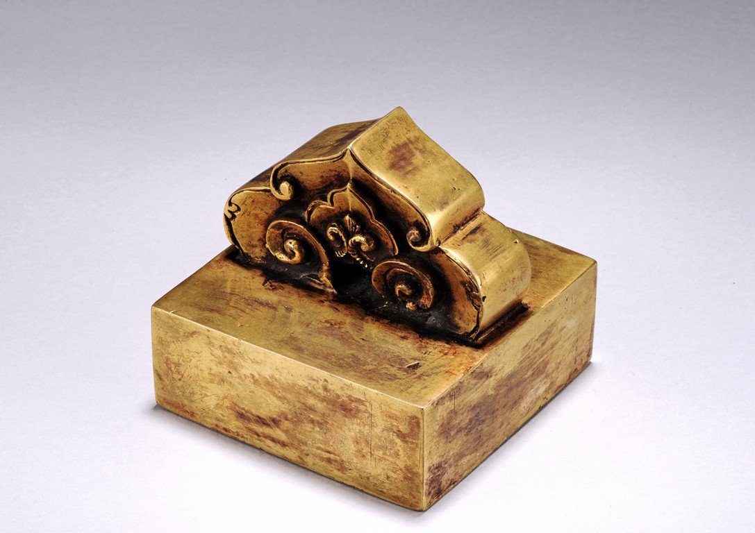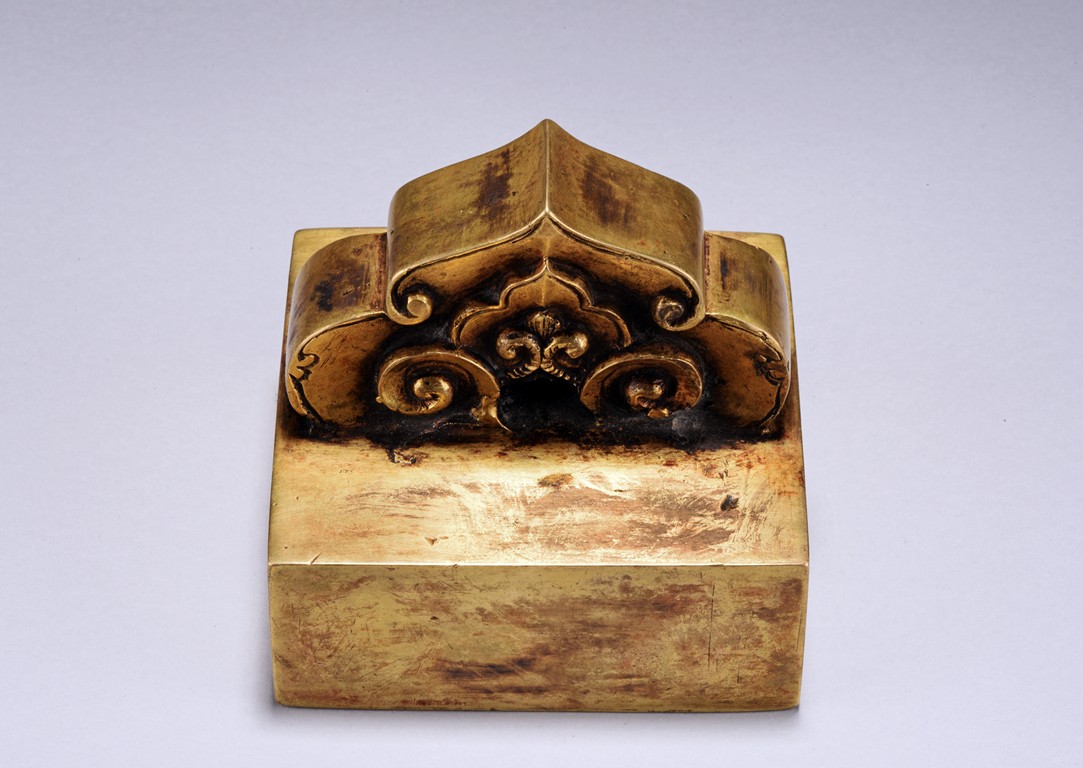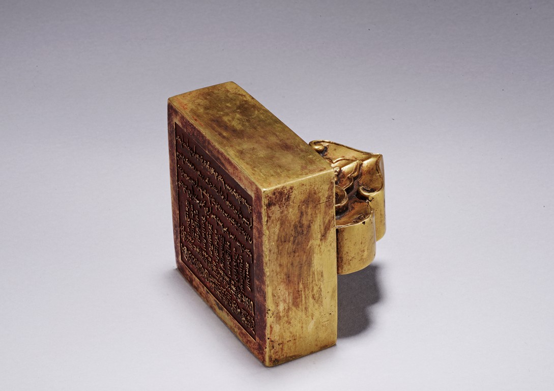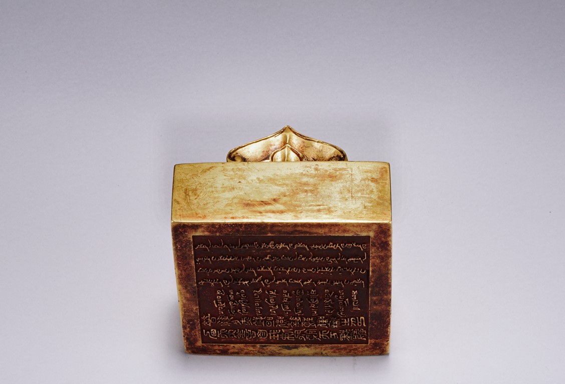 Of square section, the seal topped with ruyi-shaped finial, overall in rich gilt, the seal base with inscriptions in three different languages. Qing Dynasty period.