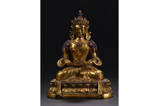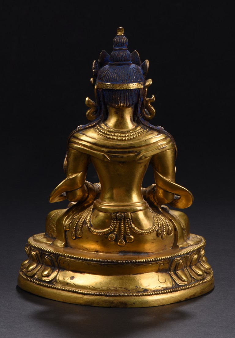 Seated in dhyanasana on an double-lotus base, the hems of his voluminous dhoti incised with an foliate motif adorned with an flowing sash over both arms, an elaborate beaded belt and various necklaces, the face with downcast eyes flanked by lotus earrings and flowing ribbons surmounted by an jeweled tiara, the hair pulled into an high chignon, the base sealed with an double-vajra. Qing Dynasty period.
