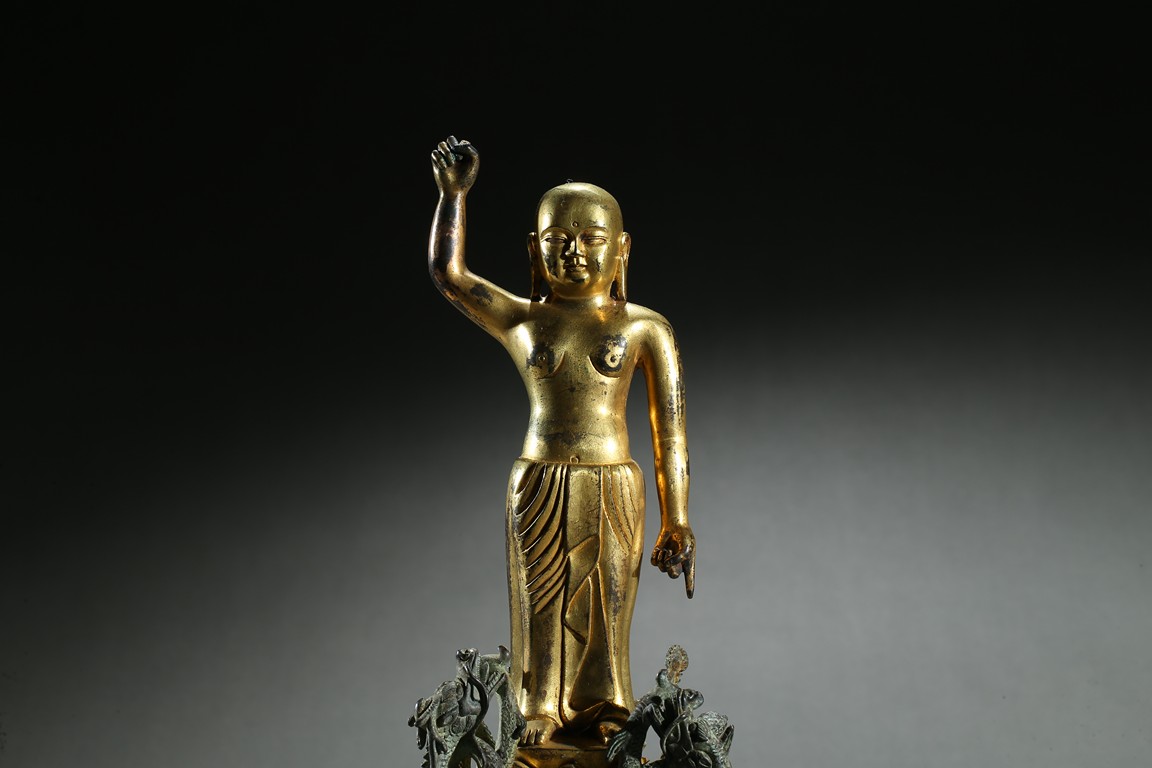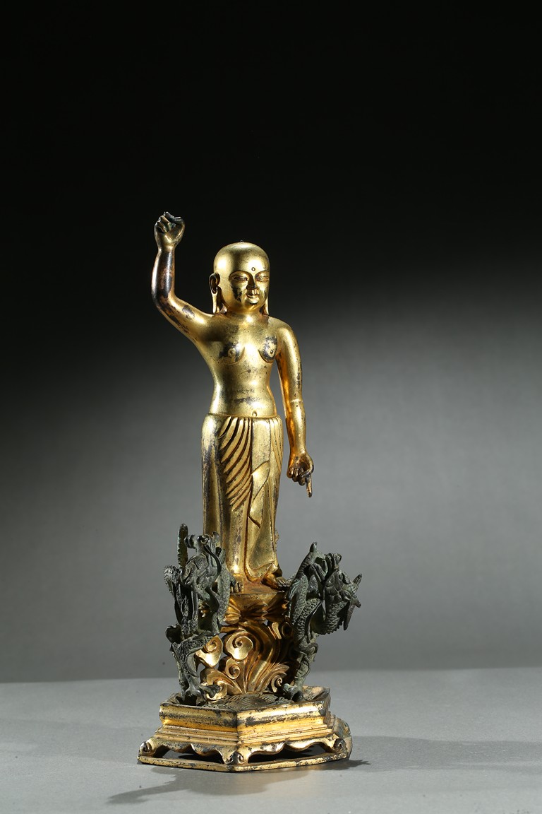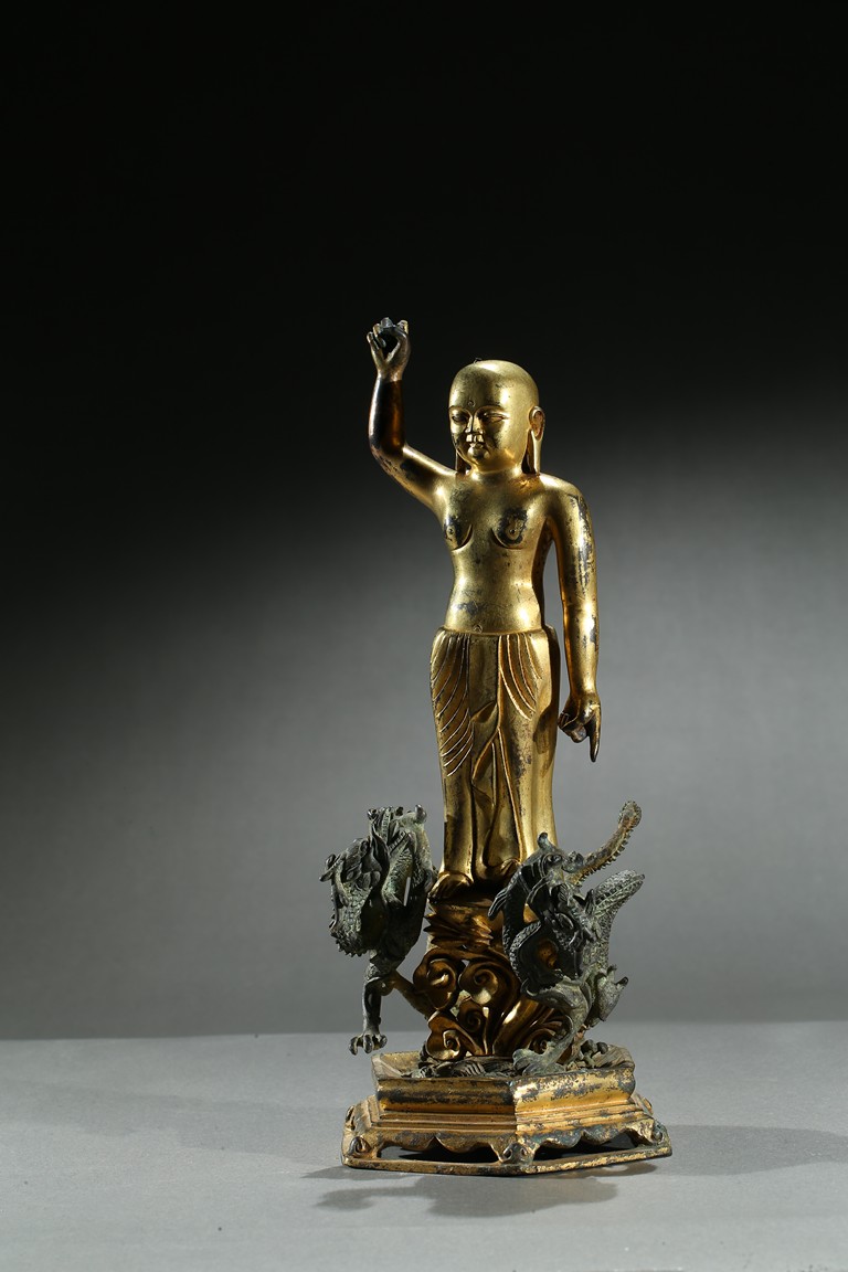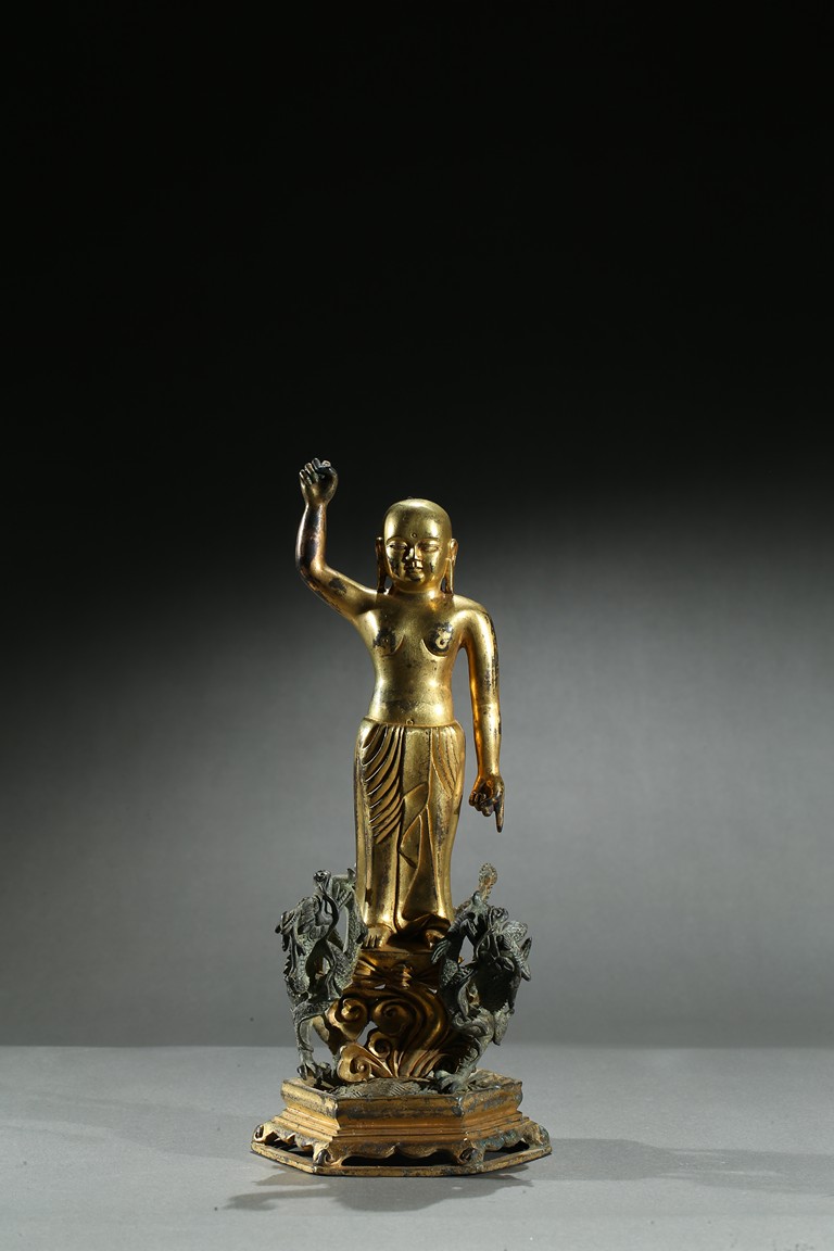 The baby buddha standing barefoot and dressed in a dhoti tied at the waist, his right arm raised above his head pointing at the heavens, and his left art at his side with his index finger pointing at the earth, in a sign of taking possession of the world, the head of the boy with slight smile with downcast eyes framed by long pendulous earlobes, mounted to a stand supported by flower branches and flanked by two ferocious dragons rising from waves, further supported on a pedestal stand. Qing Dynasty period.
