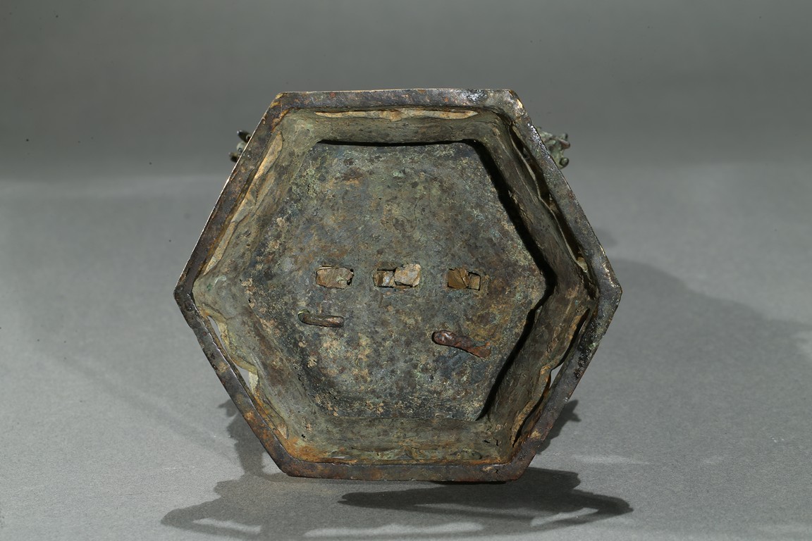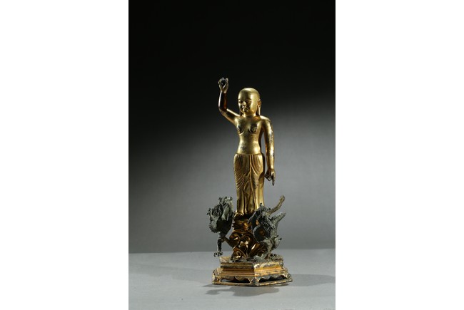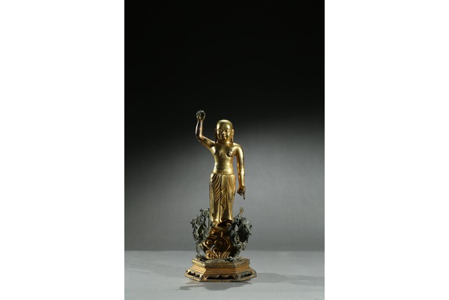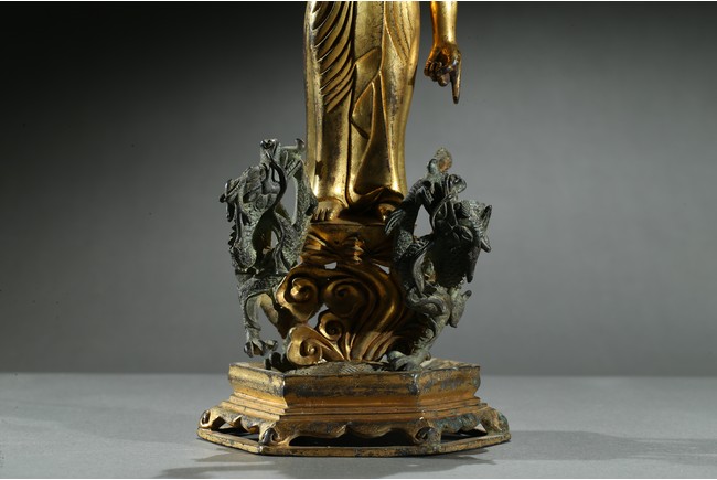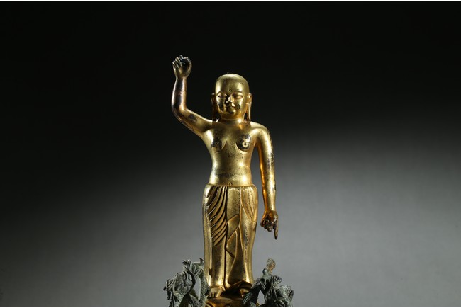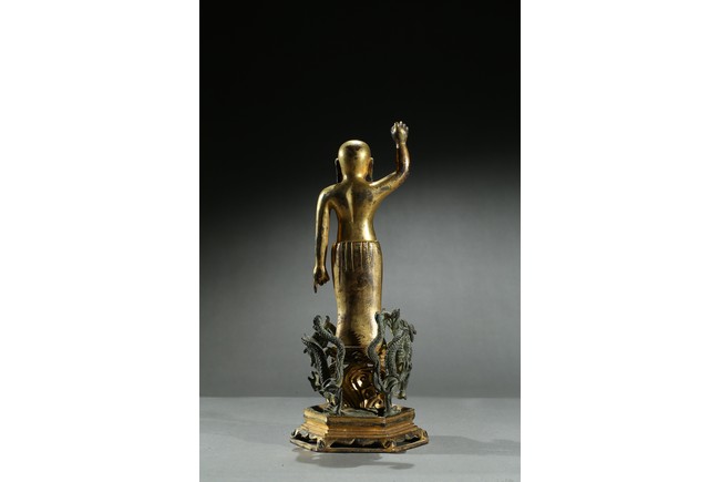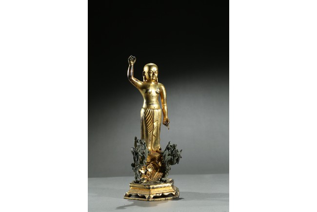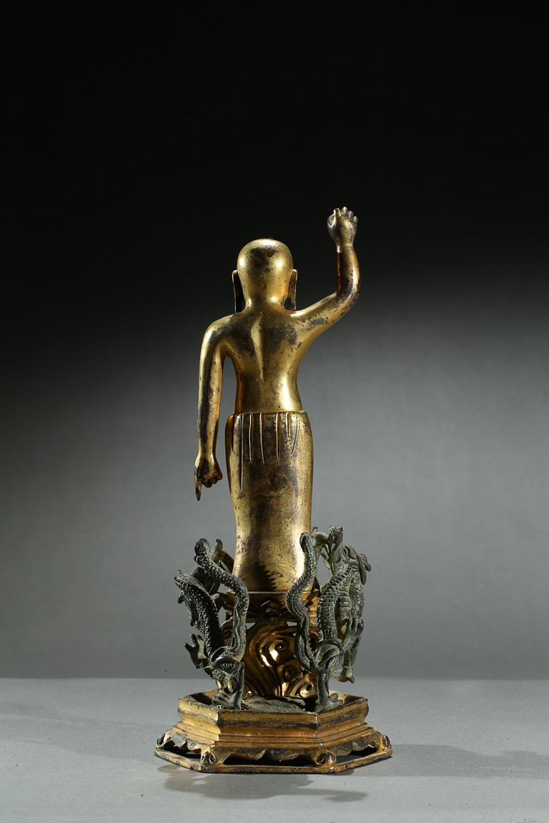 The baby buddha standing barefoot and dressed in a dhoti tied at the waist, his right arm raised above his head pointing at the heavens, and his left art at his side with his index finger pointing at the earth, in a sign of taking possession of the world, the head of the boy with slight smile with downcast eyes framed by long pendulous earlobes, mounted to a stand supported by flower branches and flanked by two ferocious dragons rising from waves, further supported on a pedestal stand. Qing Dynasty period.