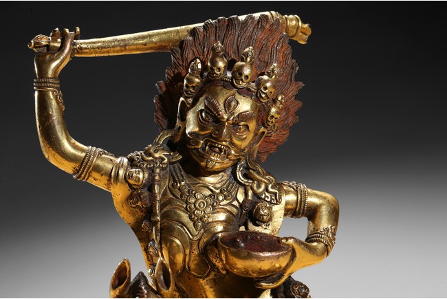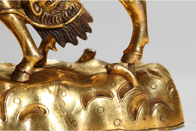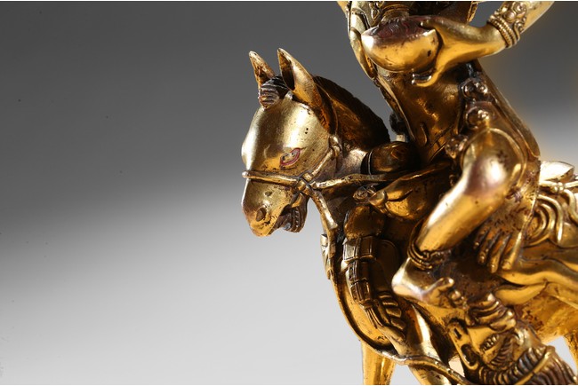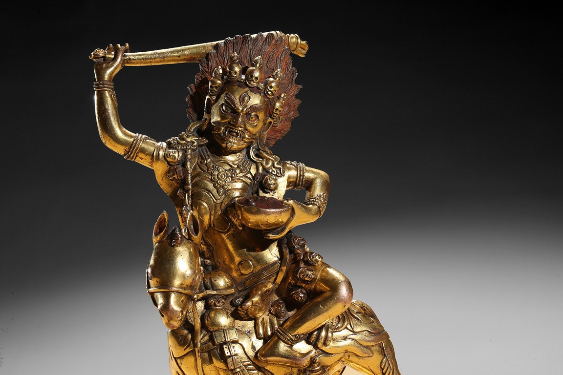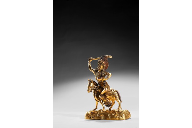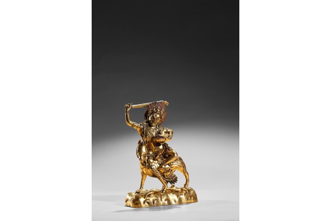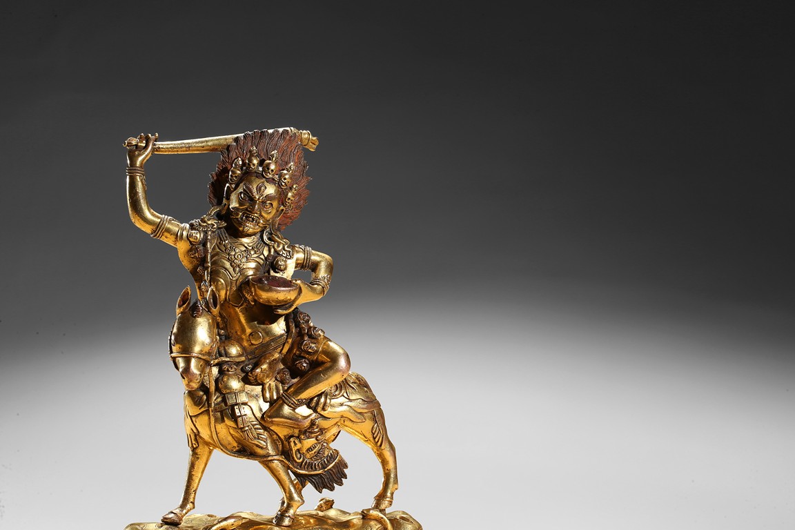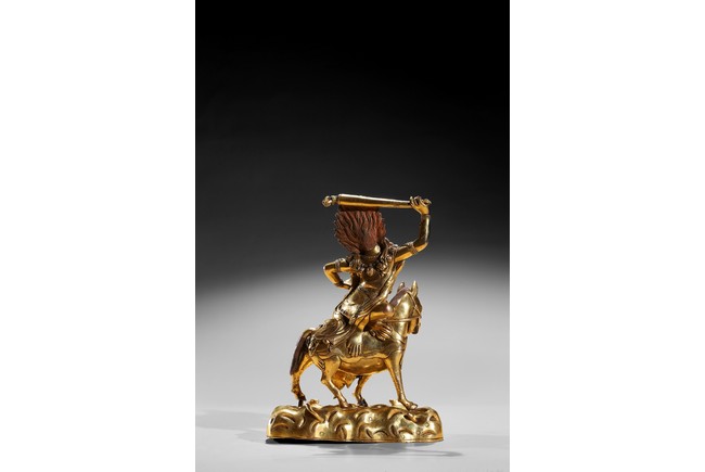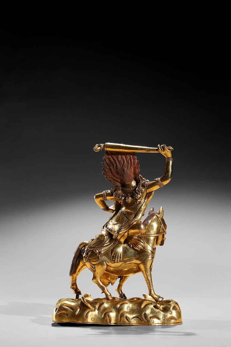 Seated on a galloping donkey, the right hand holding a sceptre, wearing beaded jewels around the chest, the ferocious face with exaggerated features and pierced with a third eye between the eyebrows, the flaming hair surmounted by a skull crown, all supported on a base of turbulent waves. Qing Dynasty period.