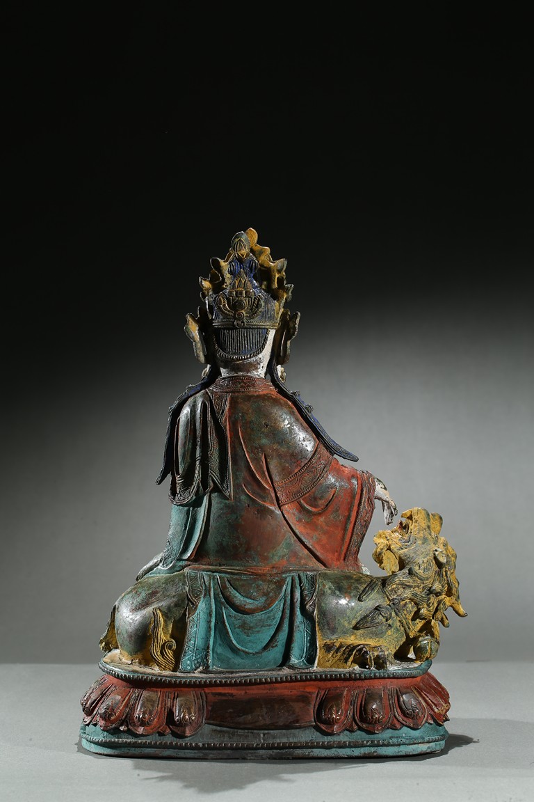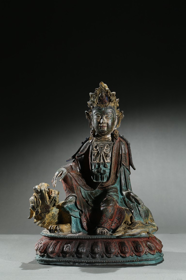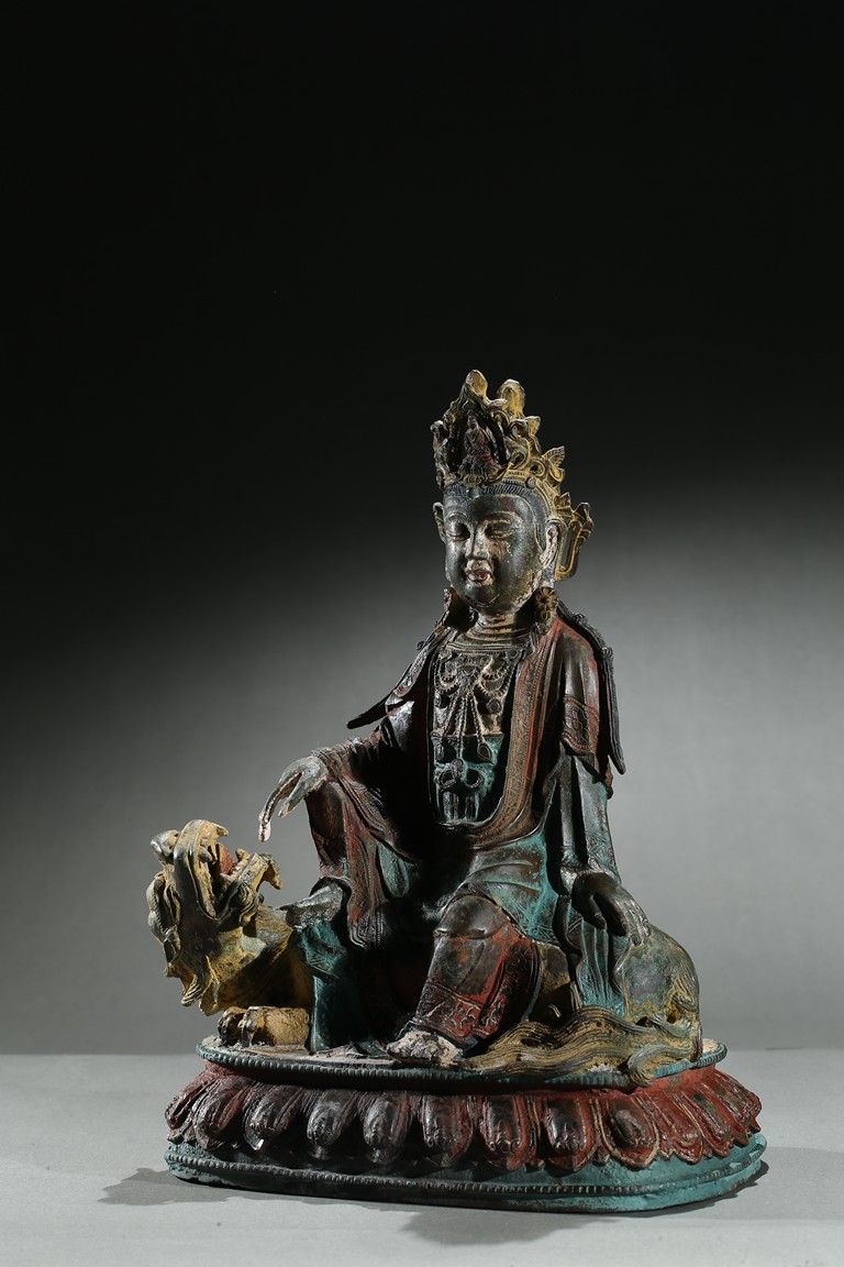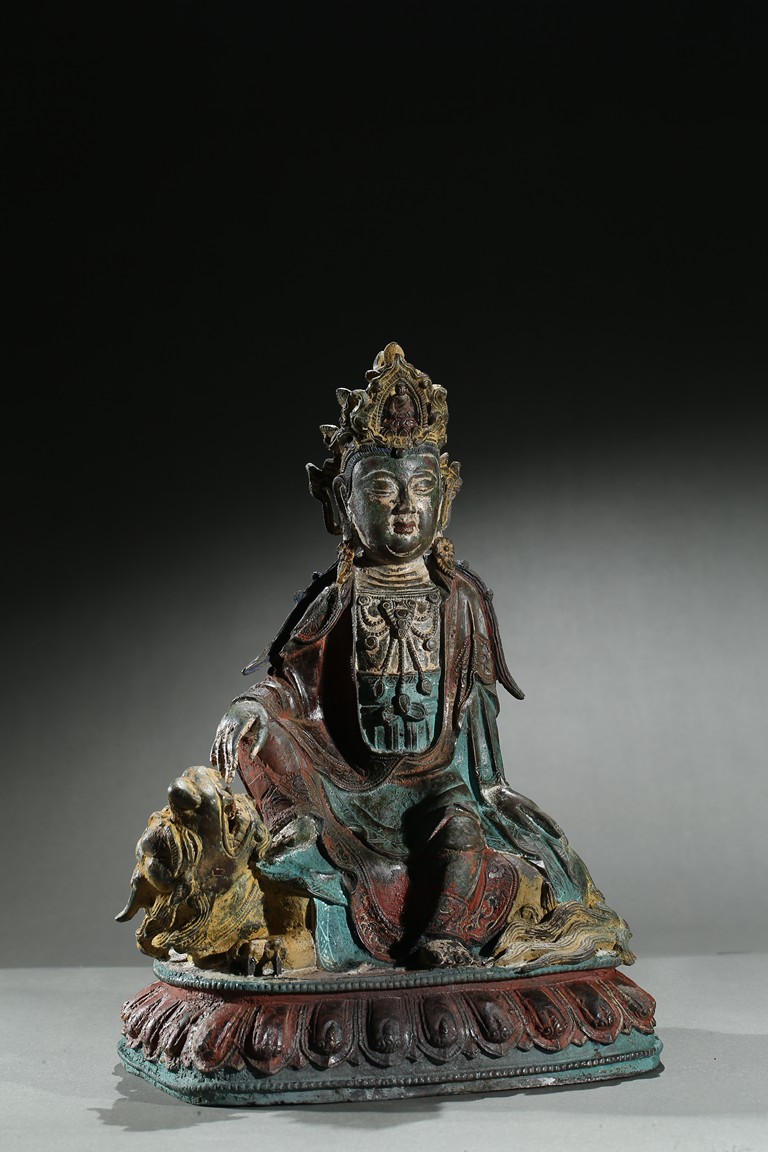 The bodhisattva is shown seated in rajali lasana, his pendent foot resting atop the back of a lion with ferocious expression and mouth agape. He is dressed in flowing robes incised with a floral pattern and adorned with various sashes and jewelry. The hair are arranged in an elaborate chignon behind pointed tiara, overall painted with various pigments including yellow, red, green, and blue, all supported on a lotus stand. Ming Dynasty period.