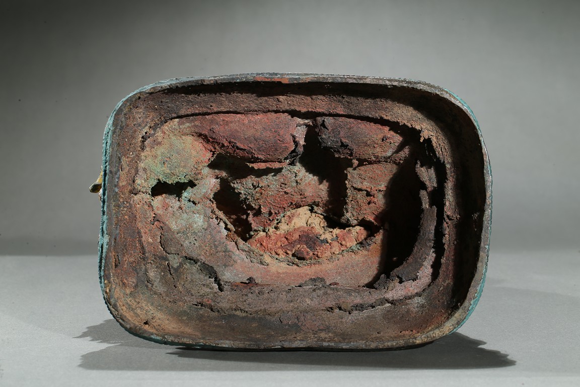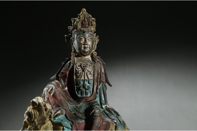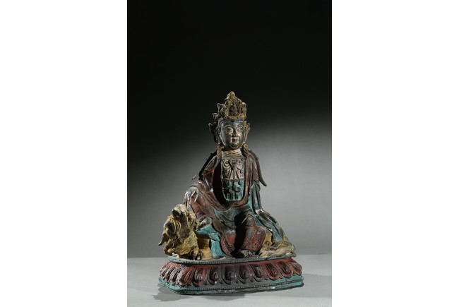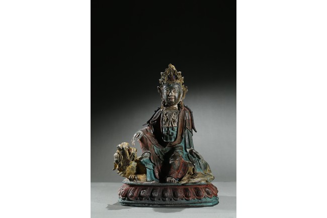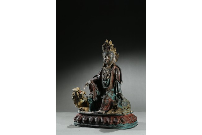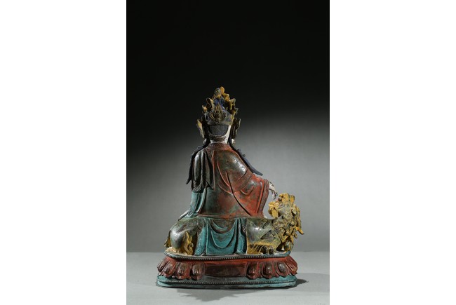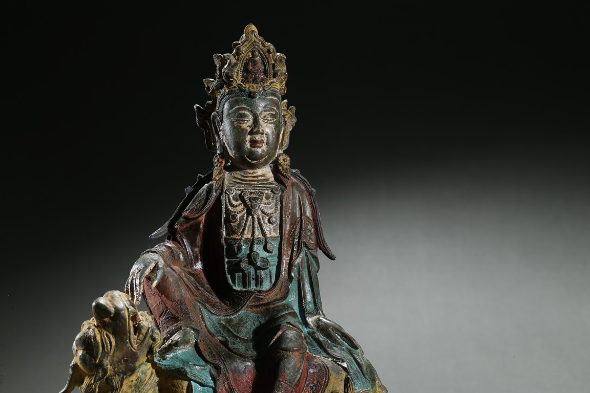 The bodhisattva is shown seated in rajali lasana, his pendent foot resting atop the back of a lion with ferocious expression and mouth agape. He is dressed in flowing robes incised with a floral pattern and adorned with various sashes and jewelry. The hair are arranged in an elaborate chignon behind pointed tiara, overall painted with various pigments including yellow, red, green, and blue, all supported on a lotus stand. Ming Dynasty period.