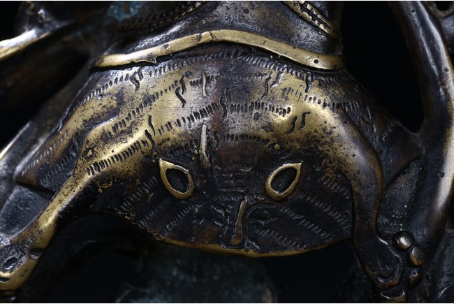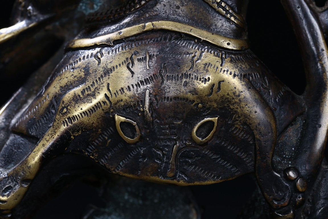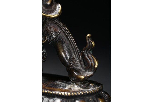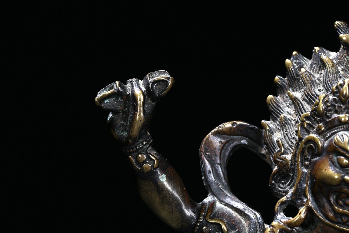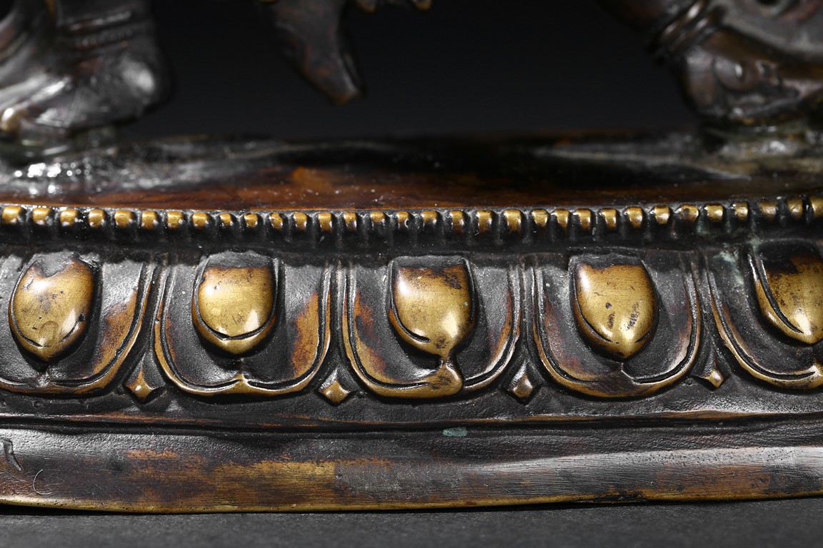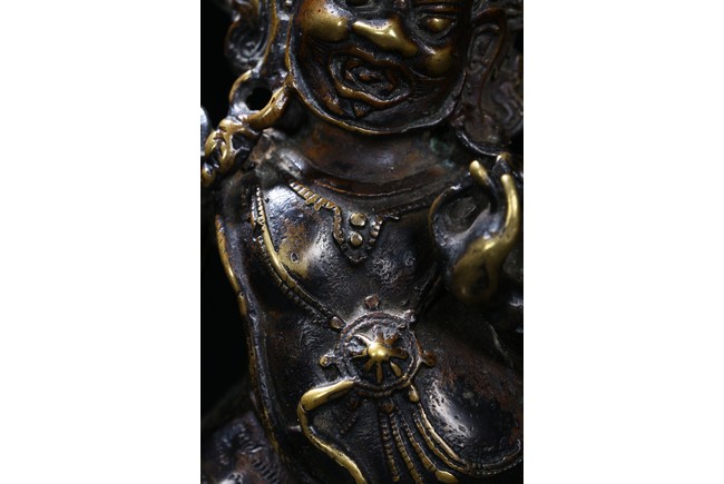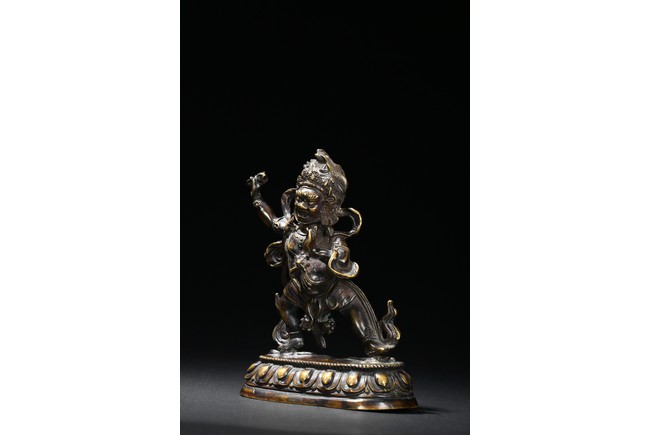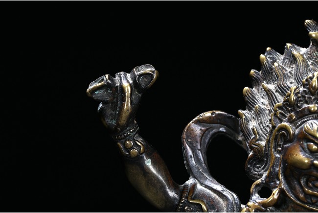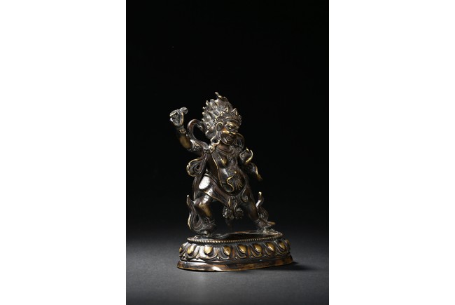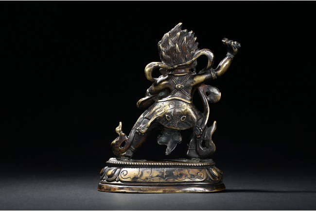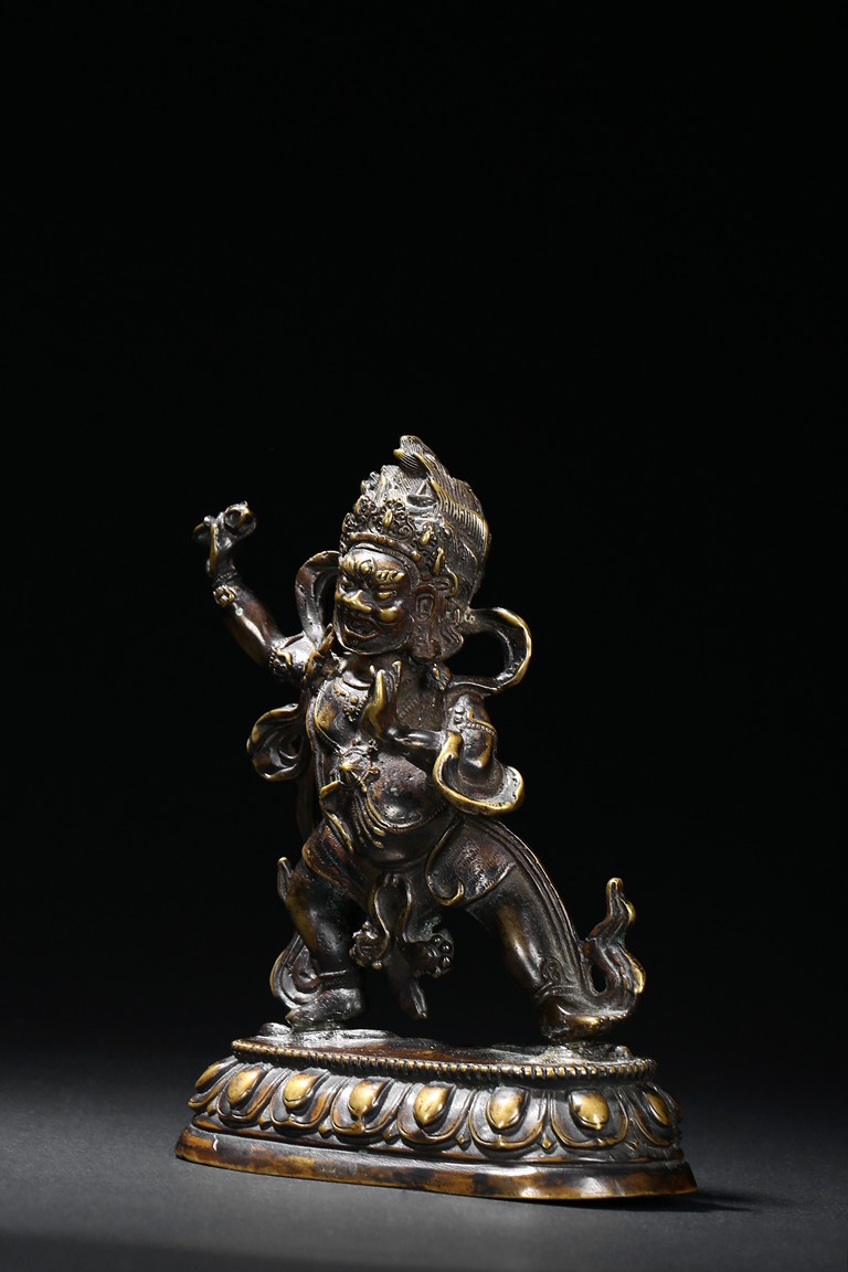 Standing in pratya siddhasana on a lotus base, his right hand holding a vajra, the left in tarjani mudra, wearing a tiger skin around his waist, abundant jewelry, and a snake draped over his shoulders, his wrathful face open-mouthed, wearing a crown fronting a vajra emerging from his upswept mane. Early Qing Dynasty period.