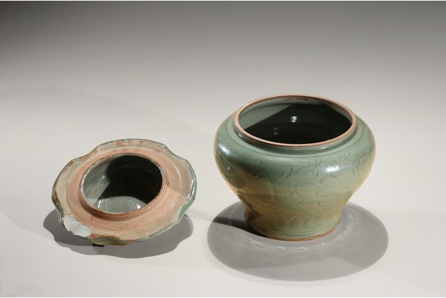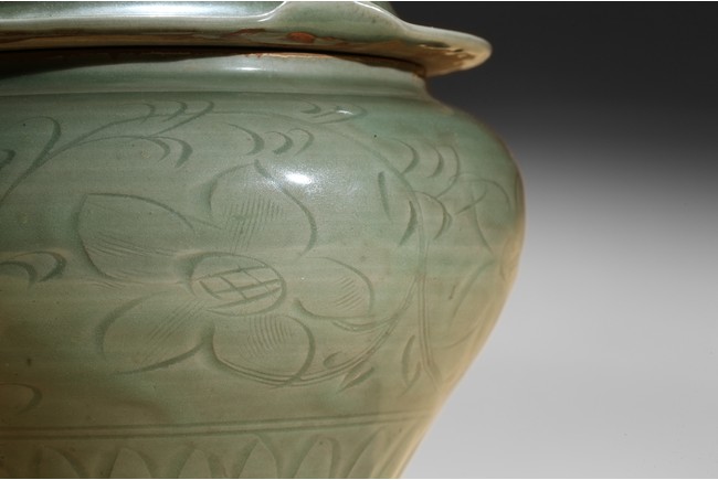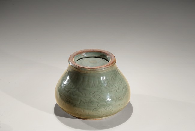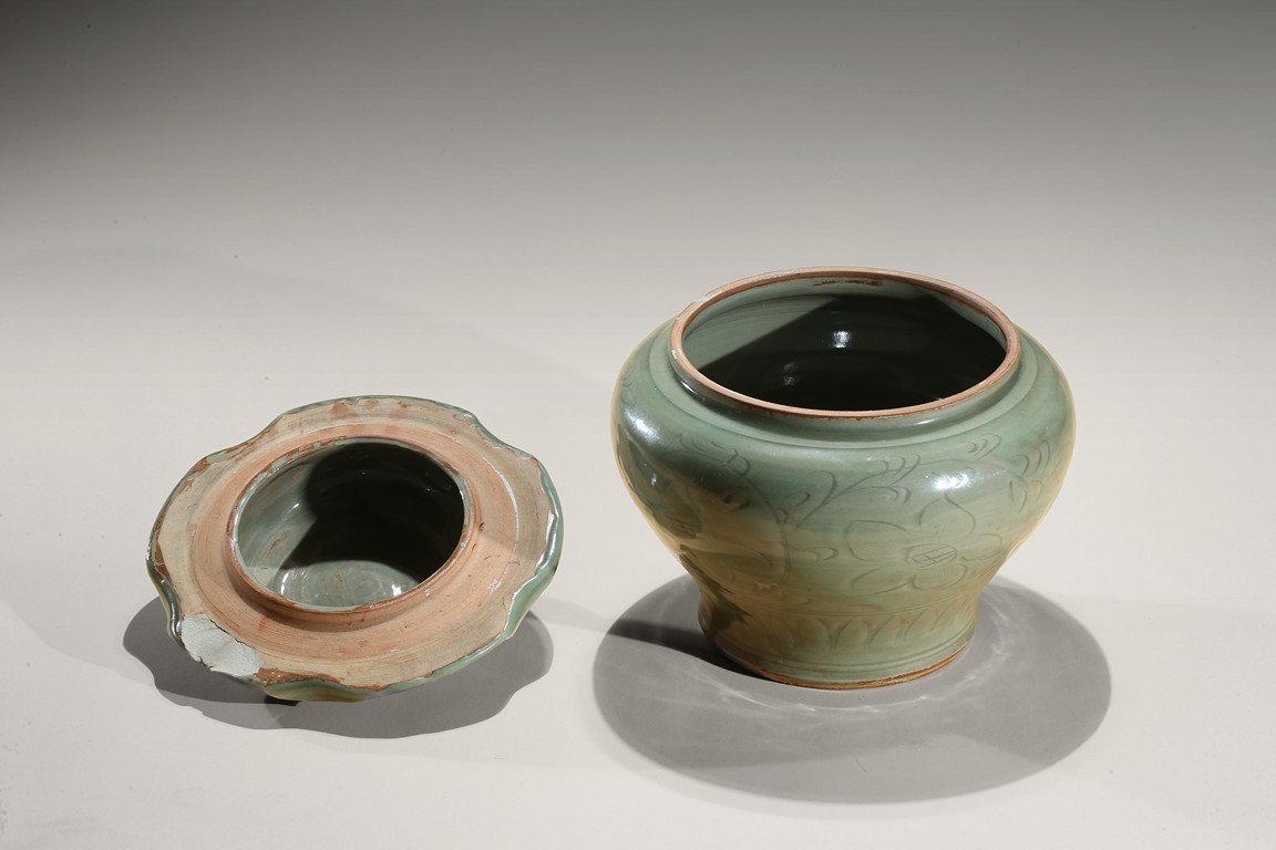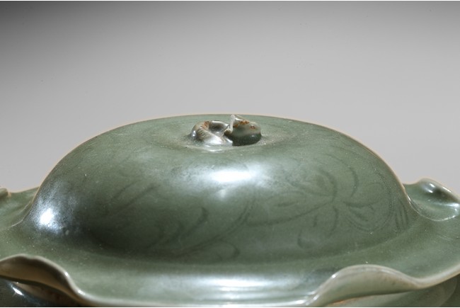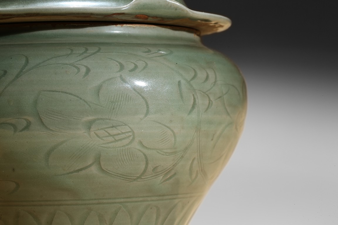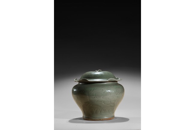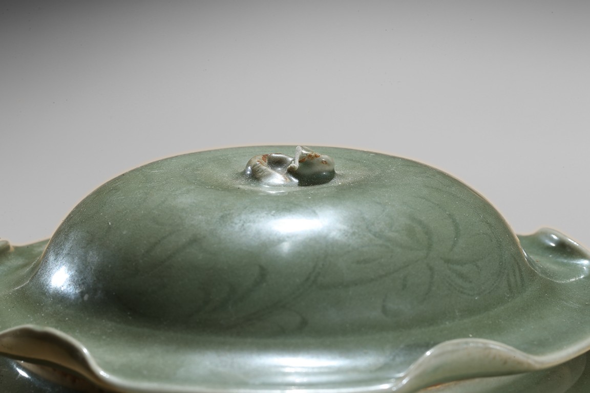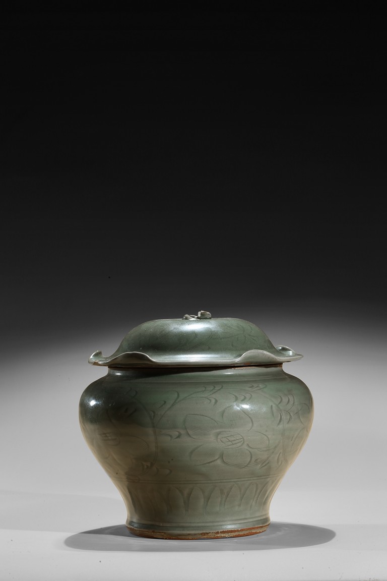 Of compressed baluster form, with a short neck, the exterior incised with a wide band of leafy floral sprays above pointed upright lappets, covered overall with an olive-green glaze, stopping at the foot and mouth rim to reveal the burnt orange body, with a similarly decorated cover in the shape of a curled lotus leaf. Yuan Dynasty period.