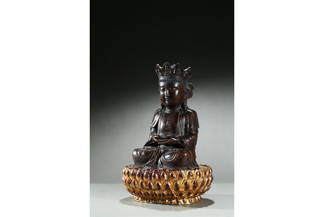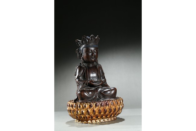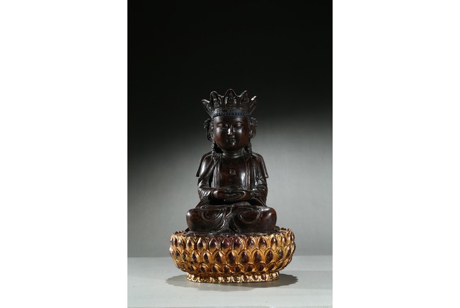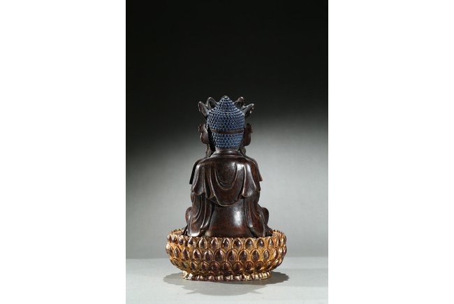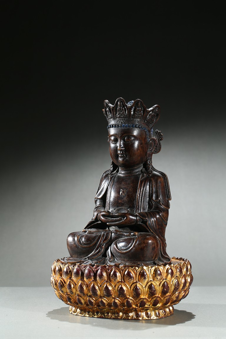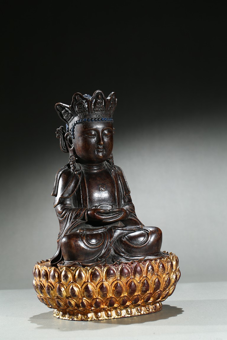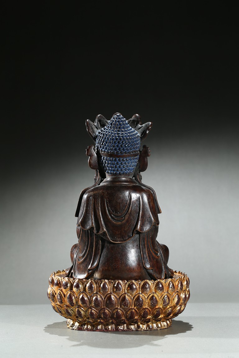 The agarwood carved Amitabha is shown seated upon an a later-gilted double lotus throne in dhyanasana, both hands held together in dhyana mudra, the chest centered with an raised swastika, face with serene and meditative expression under an pointed tiara with small buddha figures. Qing Dynasty period.