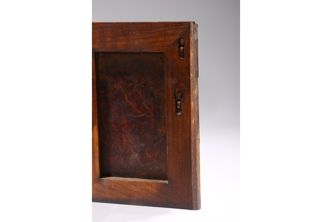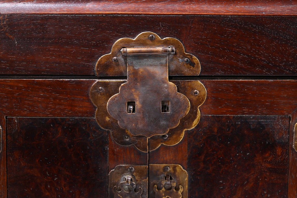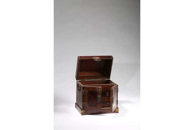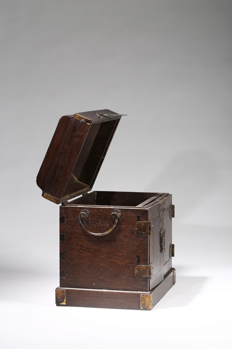 Of rectangular form, the single panel hinged cover above a pair of framed matched burlwood panel doors, hinged to the cabinet by inlaid squared hinges retained by pins, the interior with three drawers of varying size, the inlaid shaped lock escutcheon with a cloud-shaped hasp, each side with bail handles pendent from shaped back and knock plates, all supported on rectangular plinth.