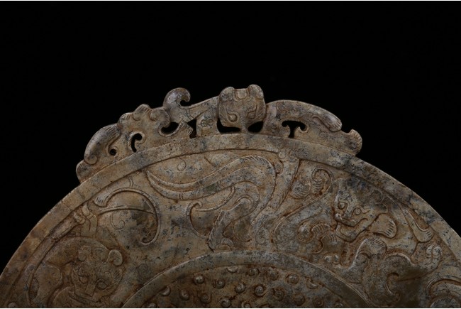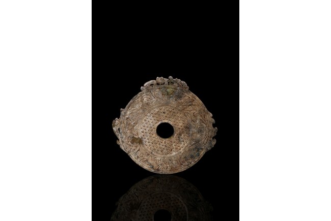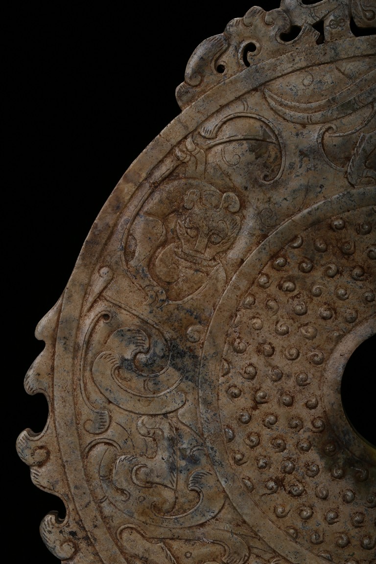 The large jade bi boldly carved on both sides with overall array of small raised circular dots, encircled by intricately carved various mythical beasts, the top and sides further carved with flange of wave and mythical beasts, the celadon stone with extensive white calcification throughout. Han Dynasty period.