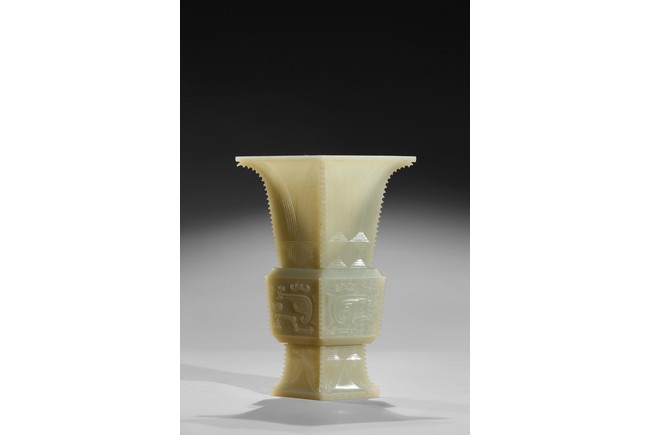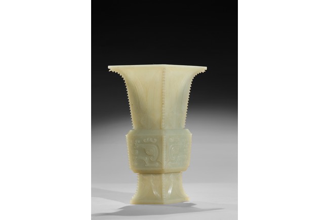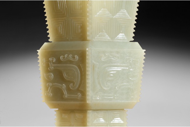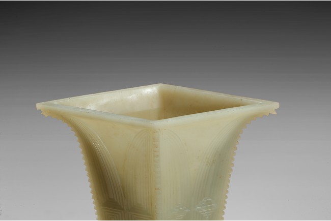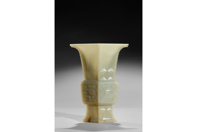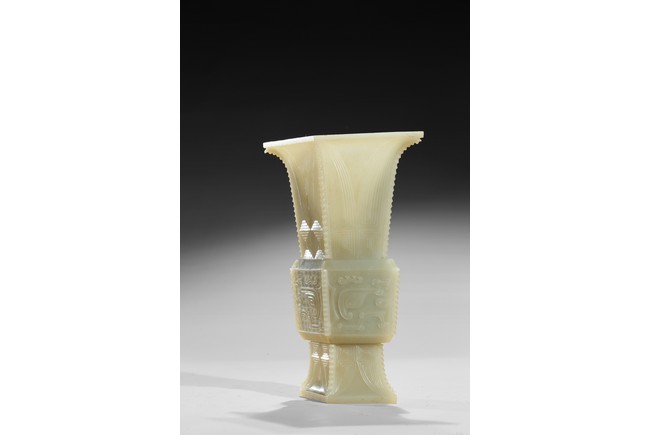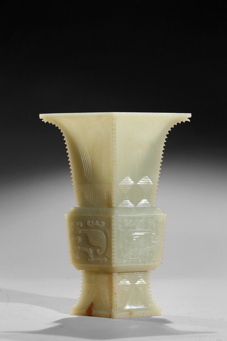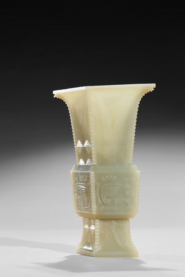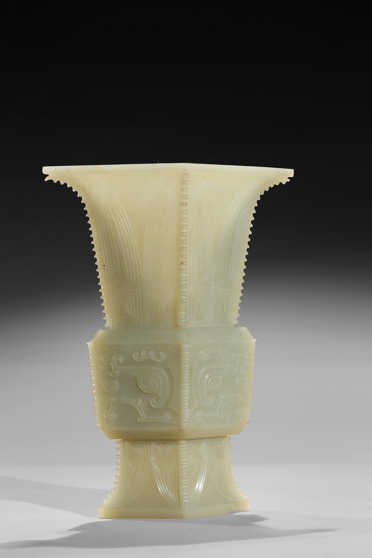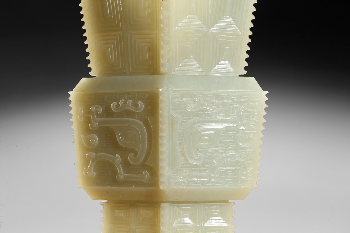 Of archaistic zun vessel form, the central body finely carved with a taotie mask above and below cicada blades. Qing Dynasty period.