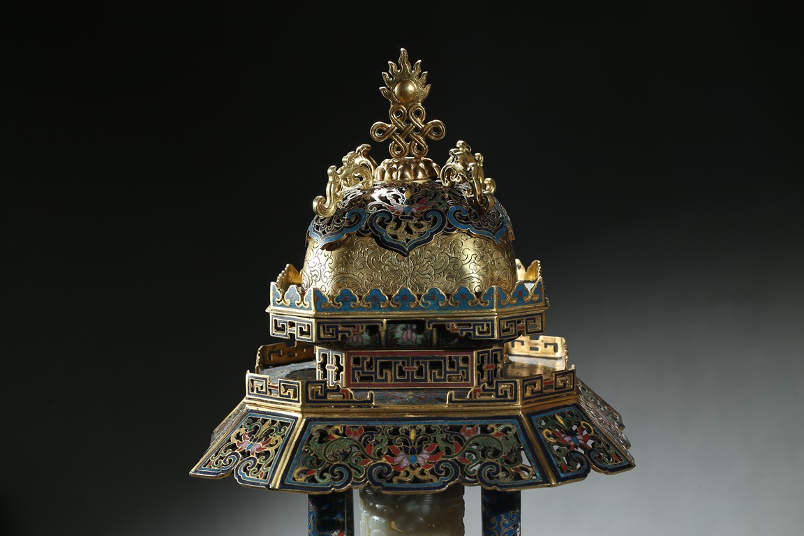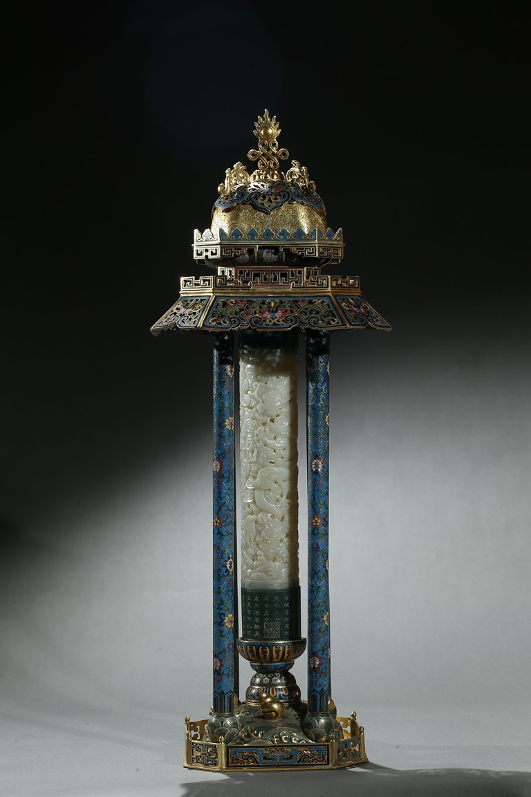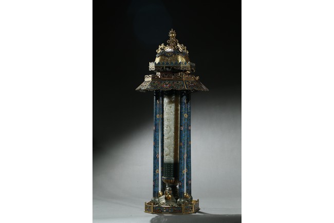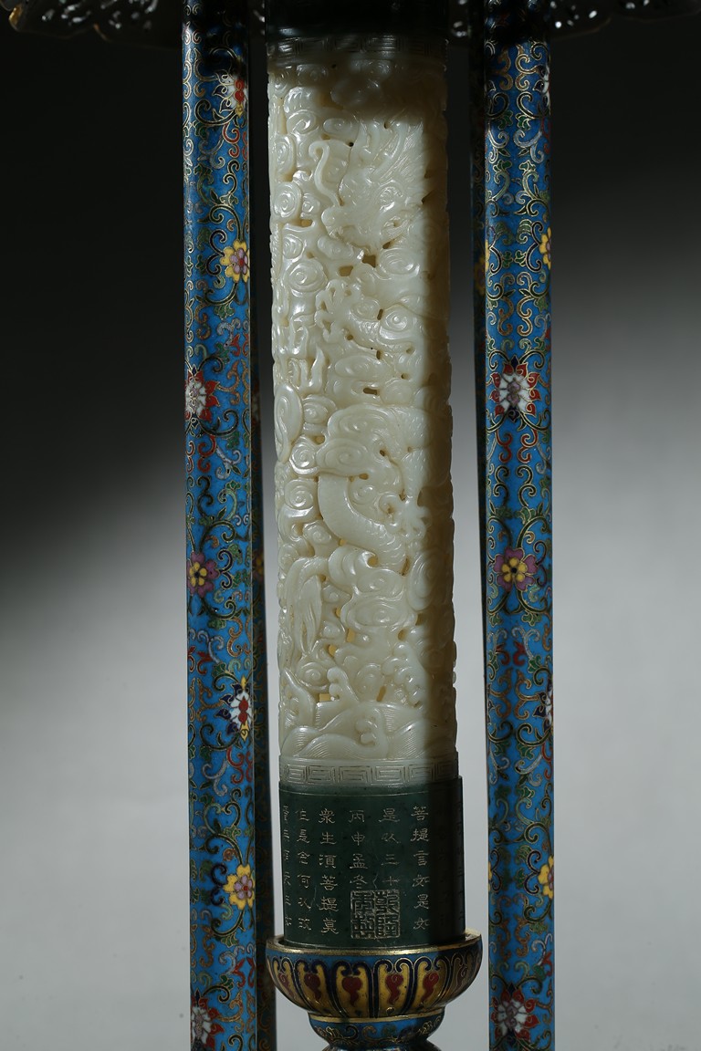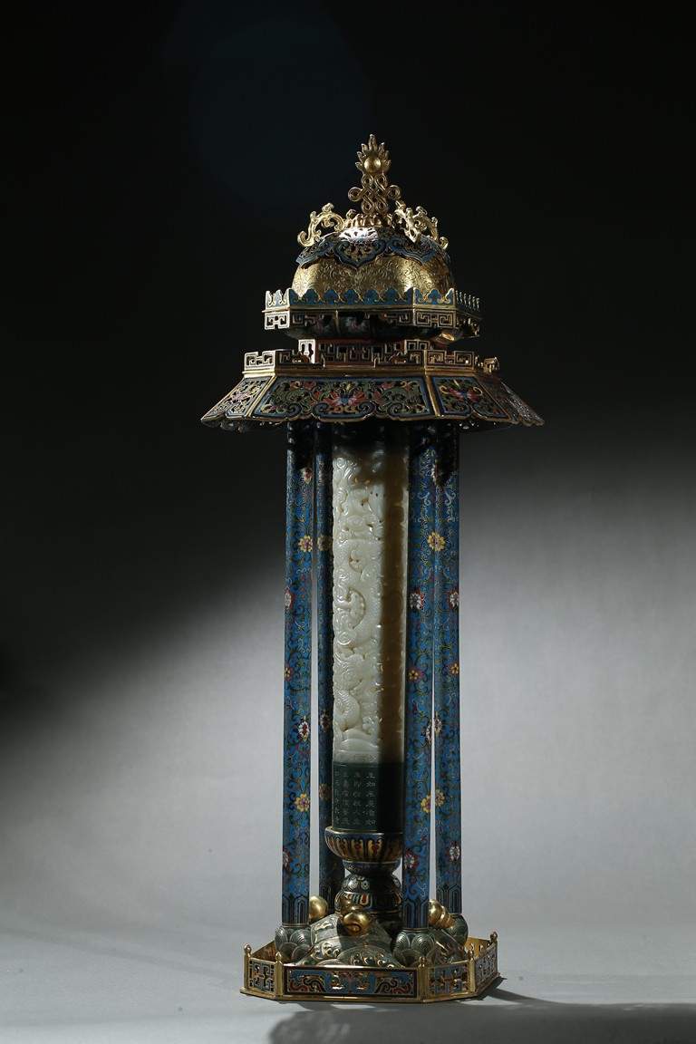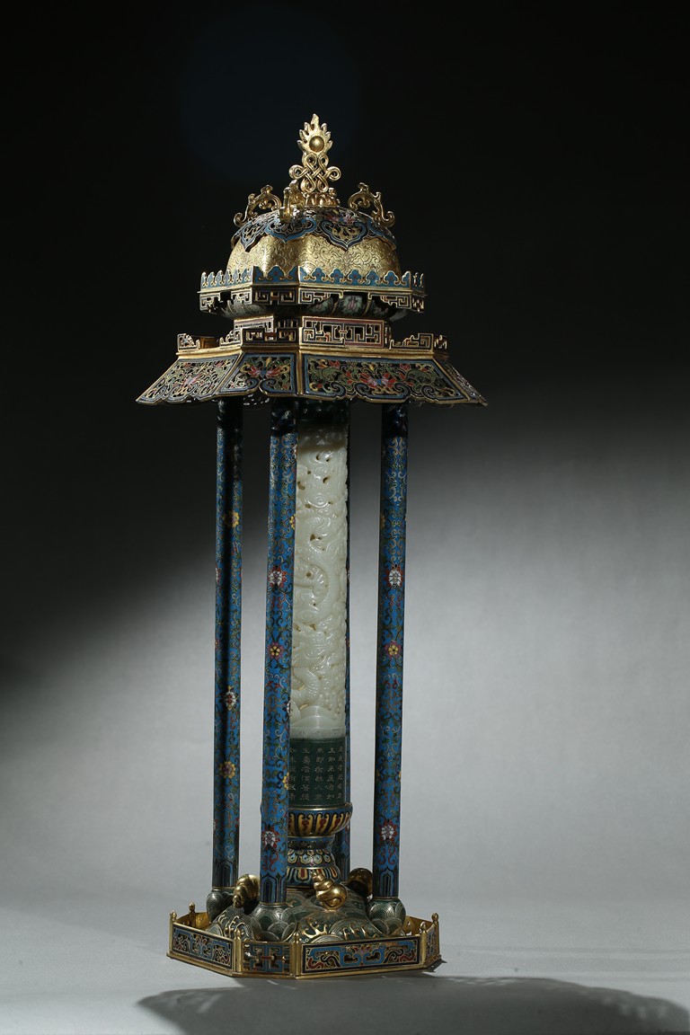 the hexagonal structure supported on four cloisonne enamel pillars, the central column secured with a reticulated white jade carved with dragons on a dense cloud ground set with a spinach section inscribed with imperial poem, set below a two-tiered roof. Qing Dynasty period.