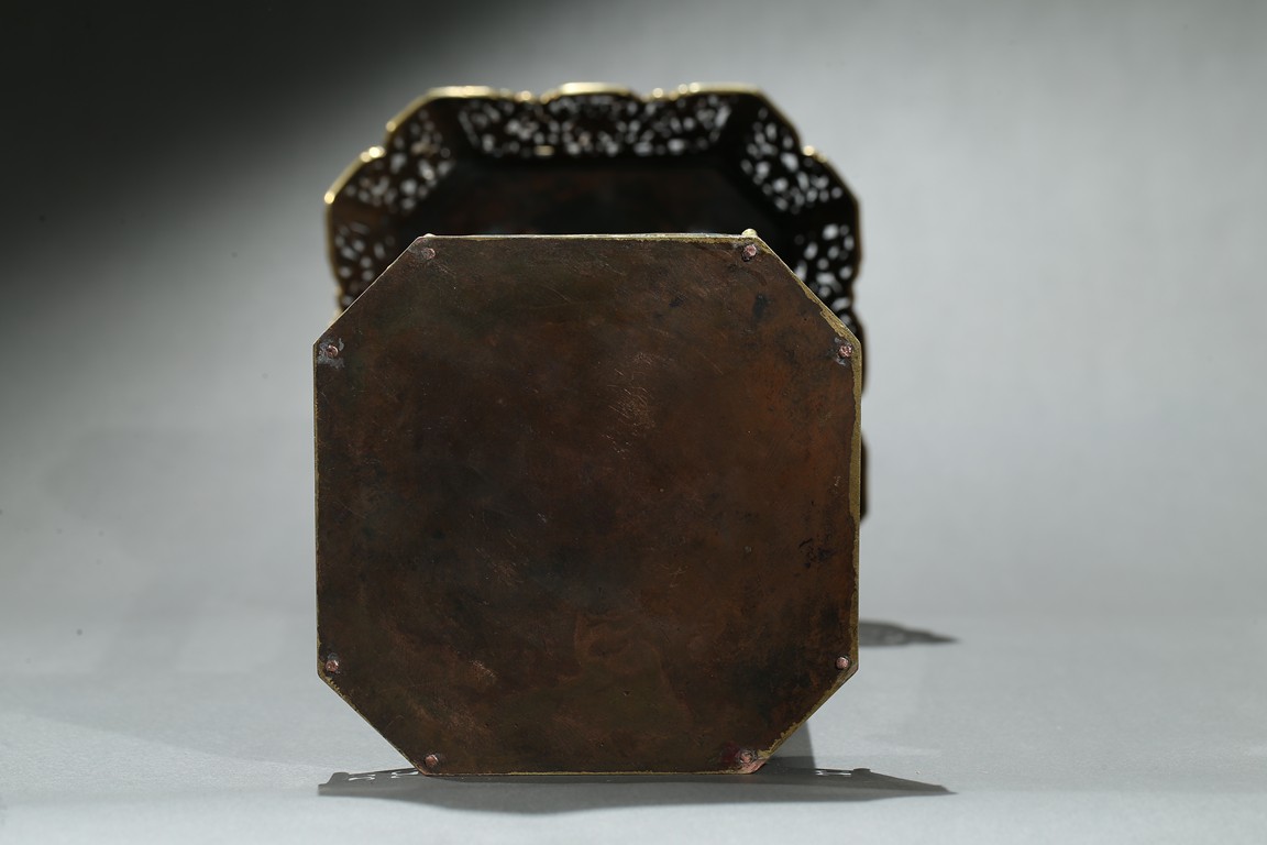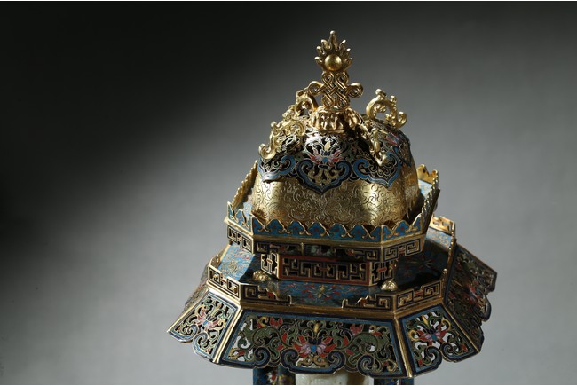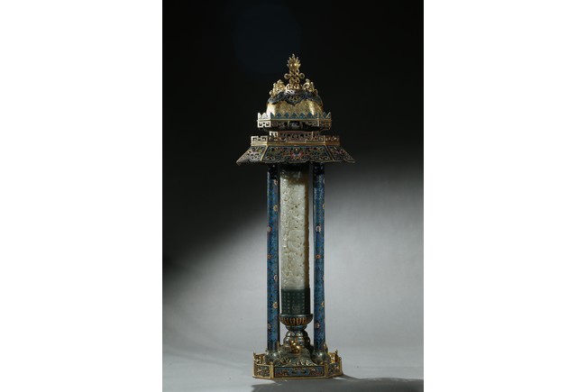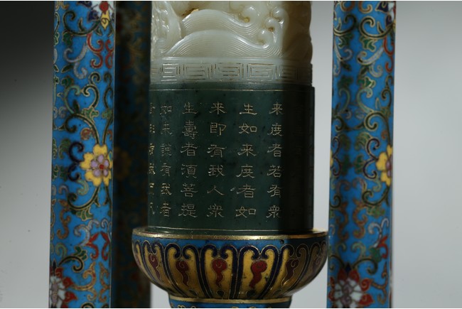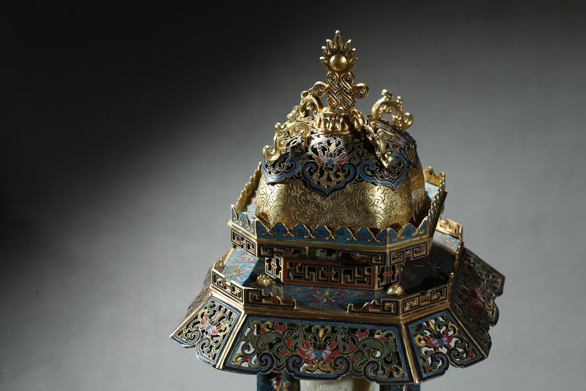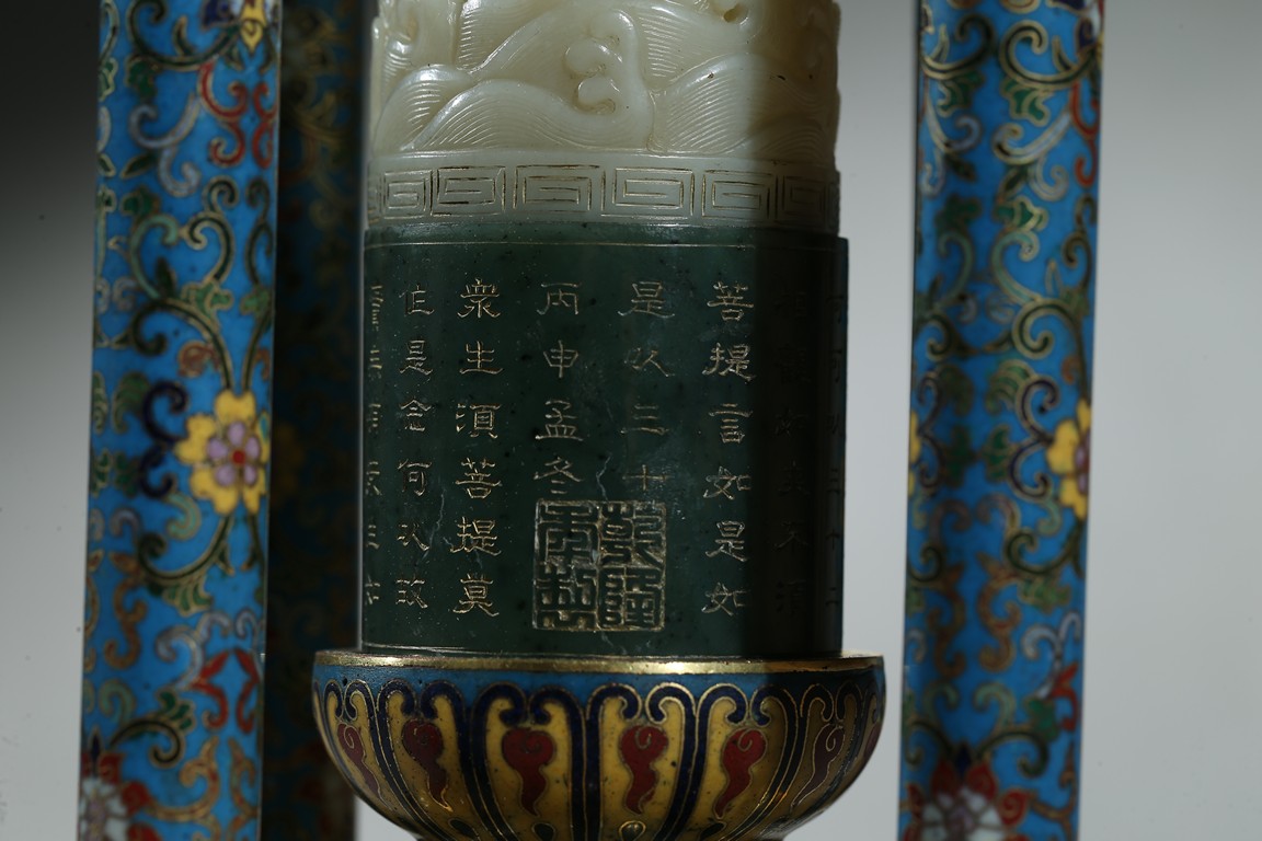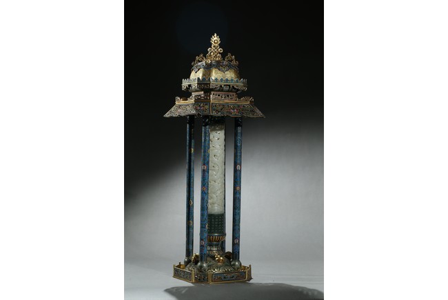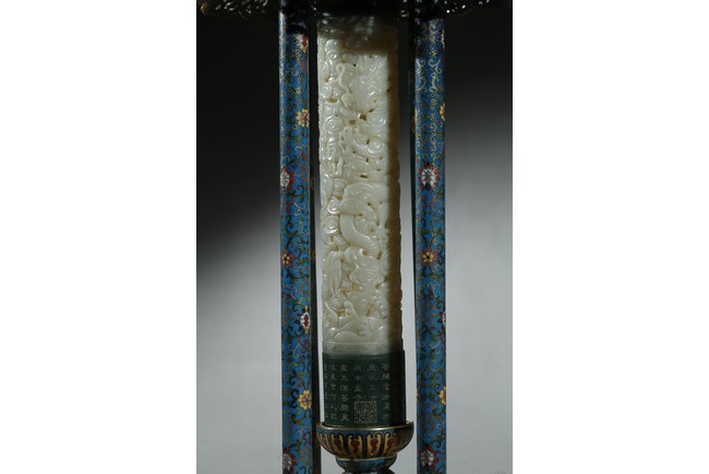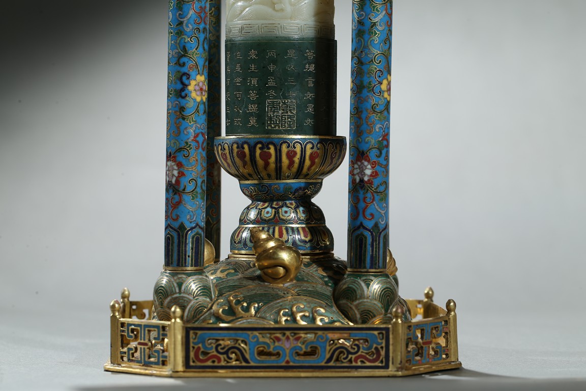 the hexagonal structure supported on four cloisonne enamel pillars, the central column secured with a reticulated white jade carved with dragons on a dense cloud ground set with a spinach section inscribed with imperial poem, set below a two-tiered roof. Qing Dynasty period.
