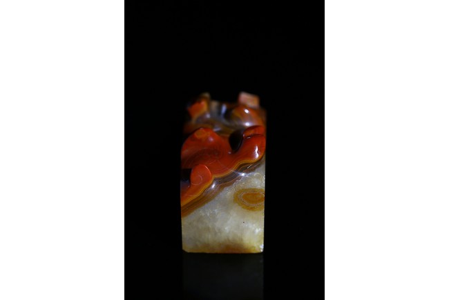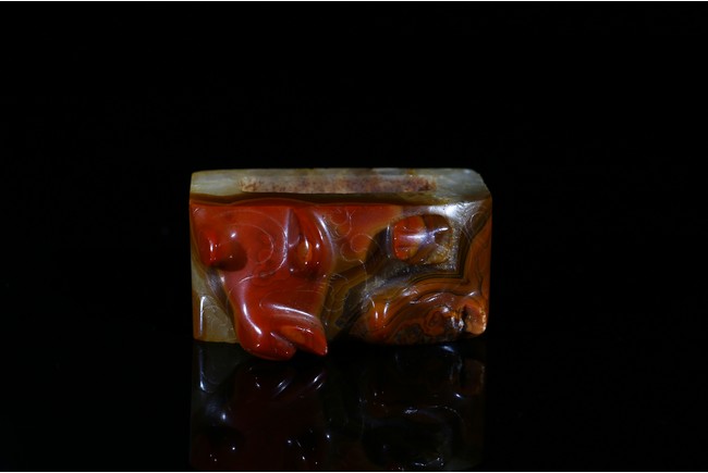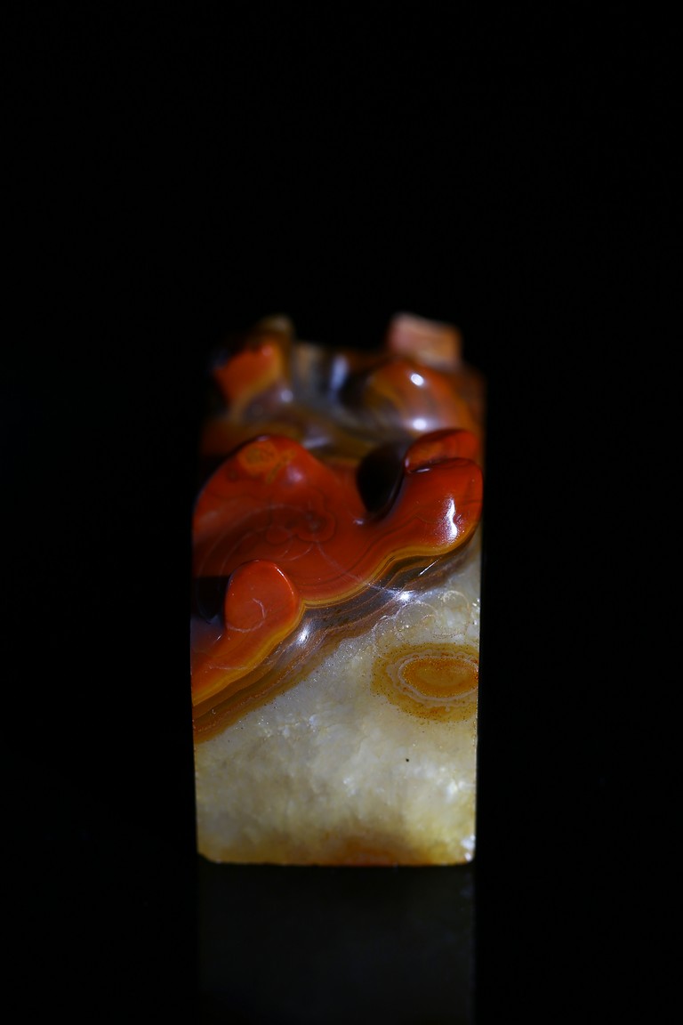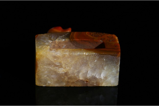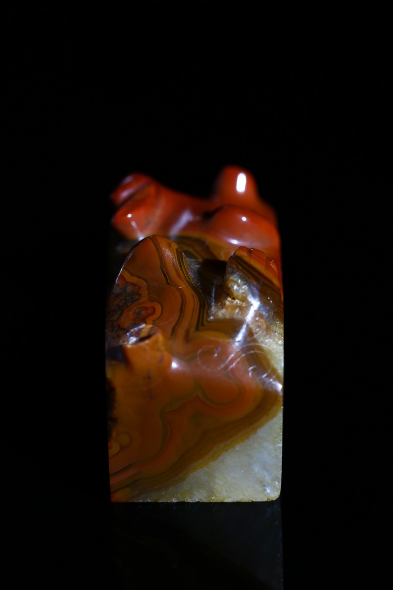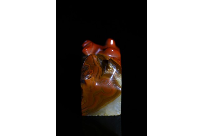 此劍璲紅瑪瑙質地,質料瑩澤細密,器身通體光素,無雕琢紋樣。正面六組形狀不規則的突出,下部矩形開孔,造型簡潔,紋理流光溢彩。可參考一較小東漢紅縞瑪瑙劍璲,成交於香港嘉德2015年秋季拍賣, 拍品號433。 來源: 北加州藏家提供 Compare a smaller and similar agate sword fitting, sold in China Guardian, Hong Kong in Nov.2015, Lot 433.