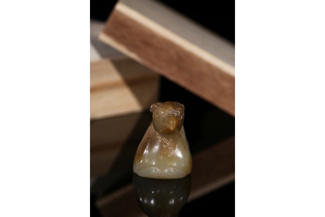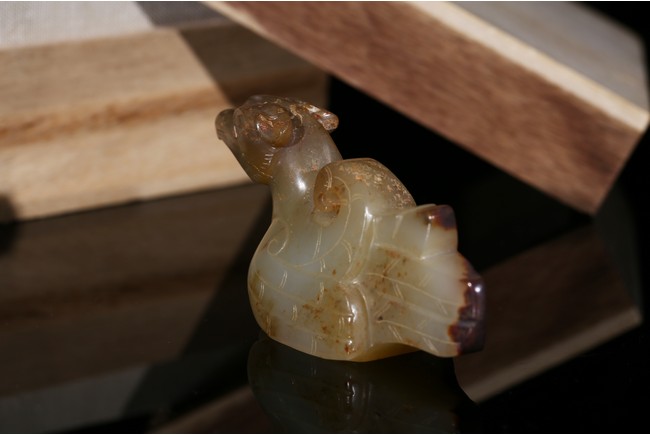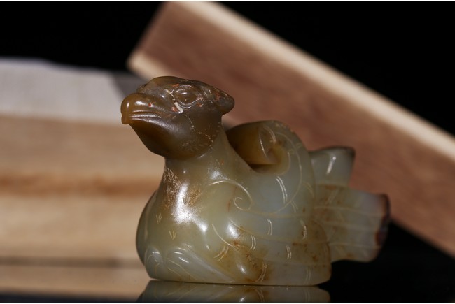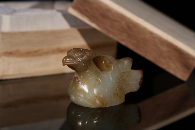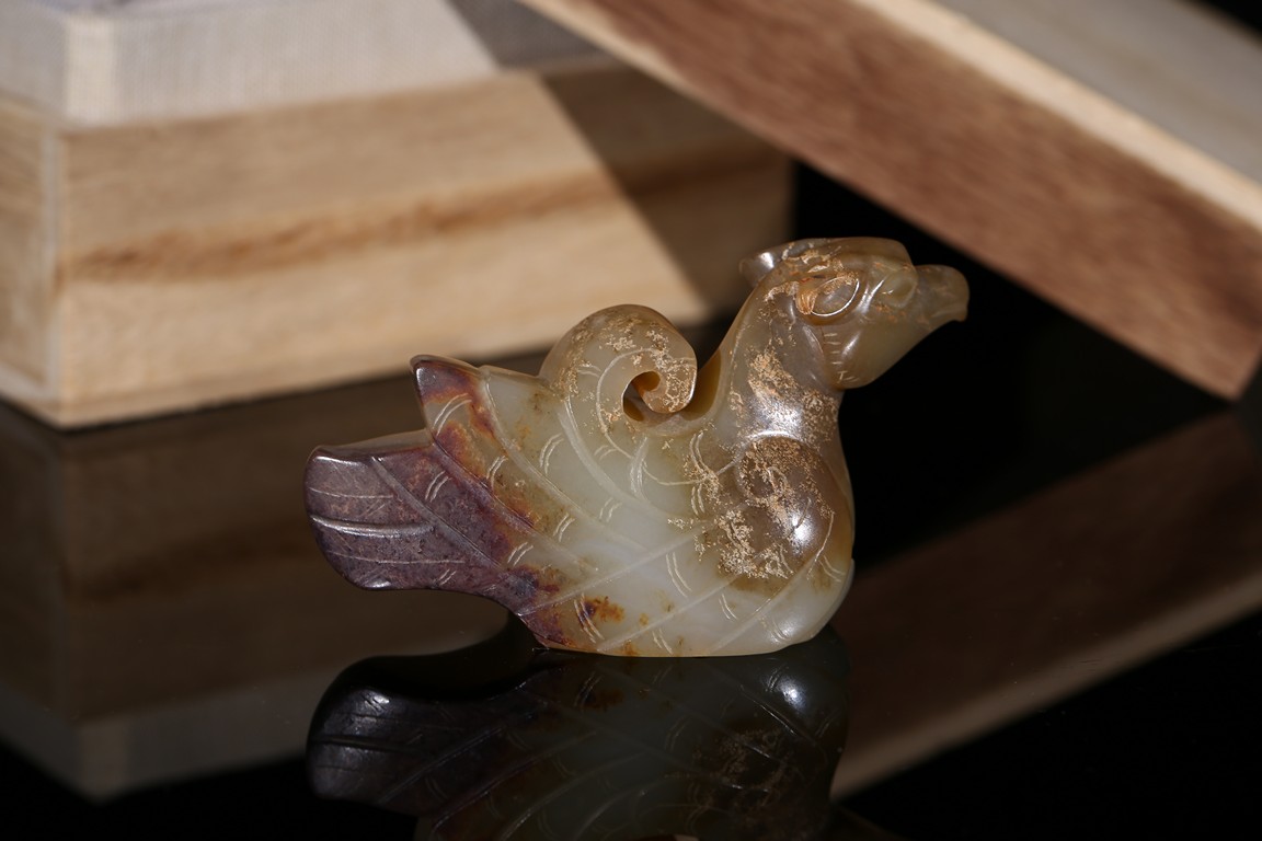 In the form of a recumbent bird, its head with a short beak looking straight ahead and its wings tucked tightly by its sides, the plumage and tail finely incised, drilled with a circular hole on the underside for attachment, the stone of a pale celadon tone with russet and dark brown inclusions. Song Dynasty period.