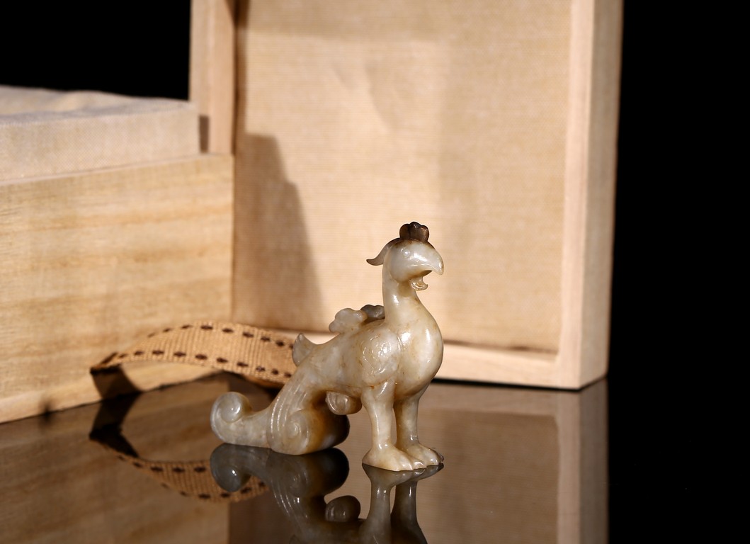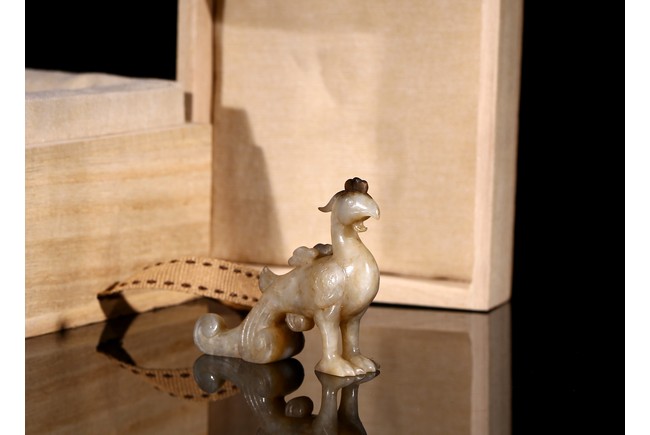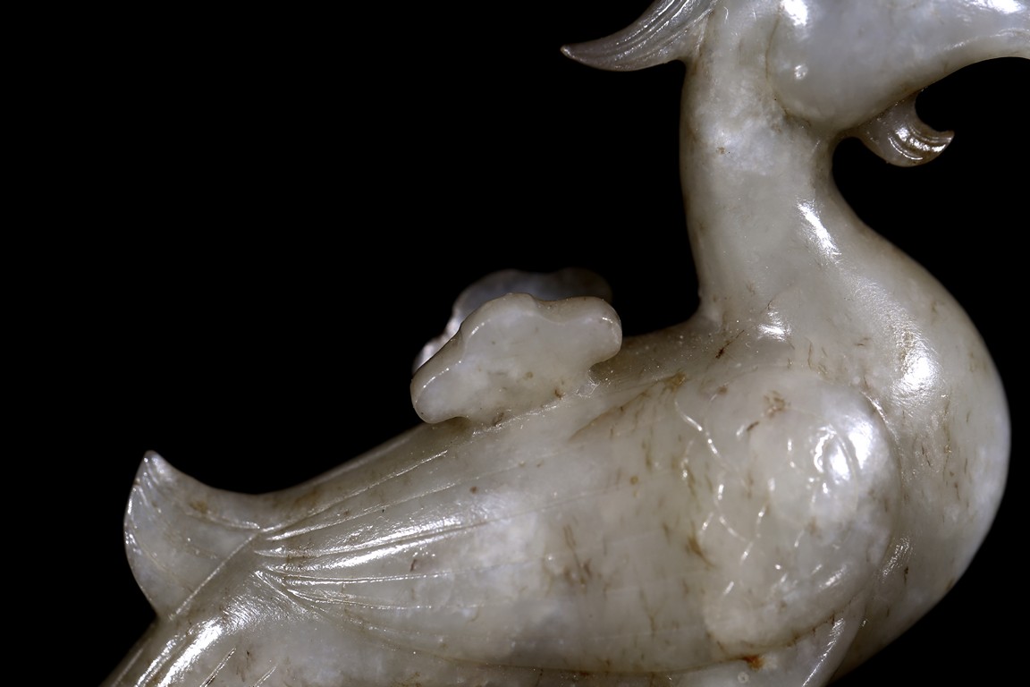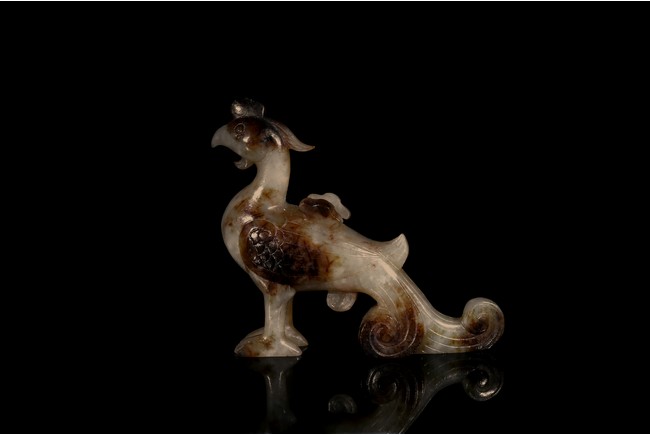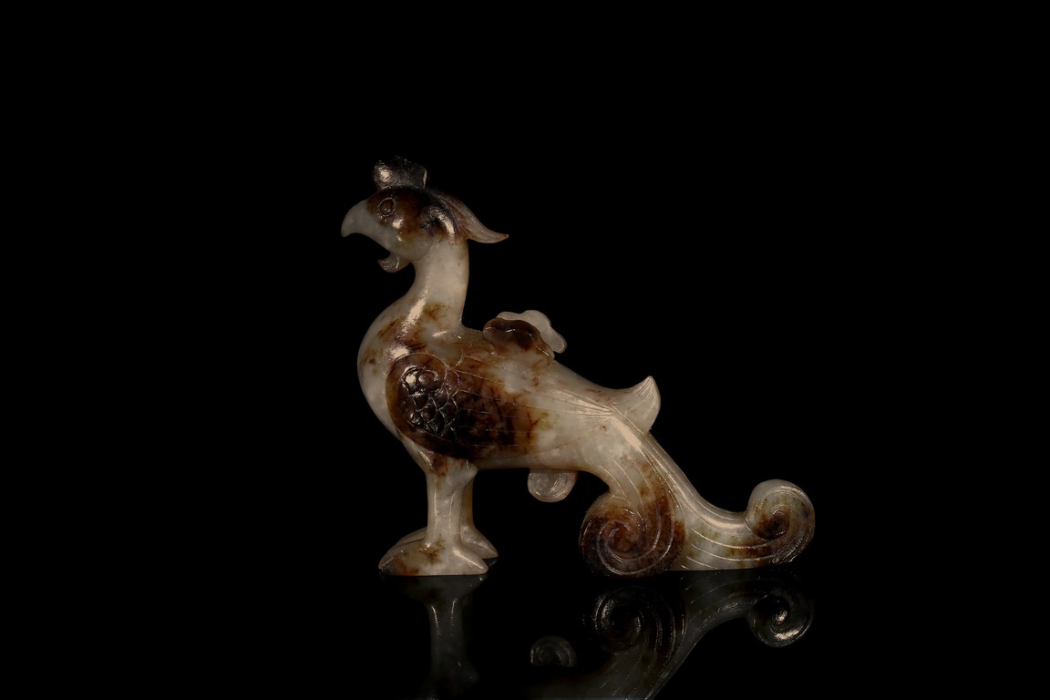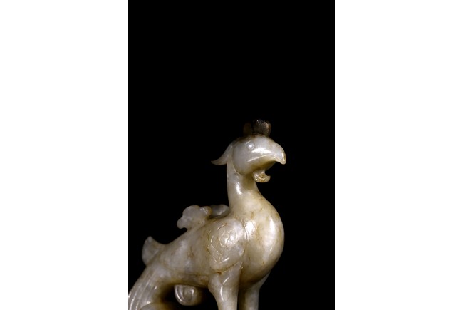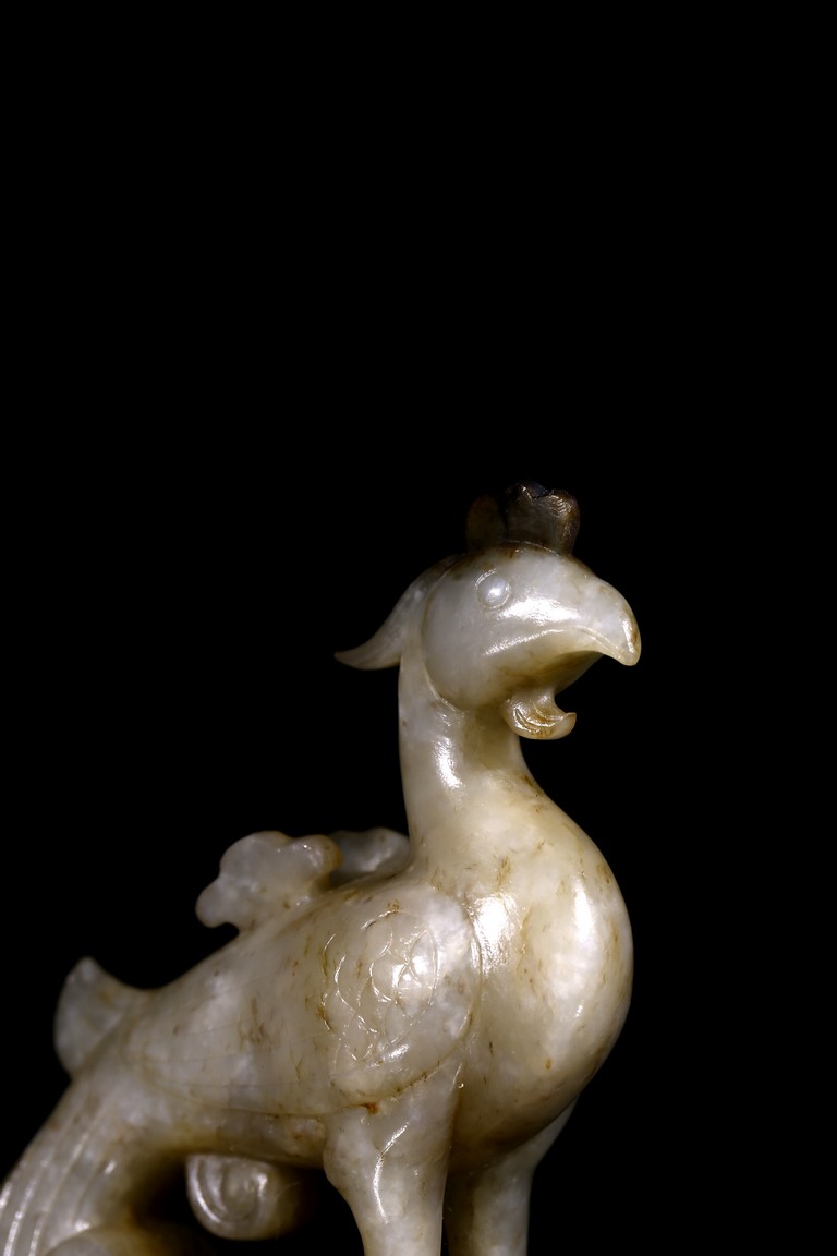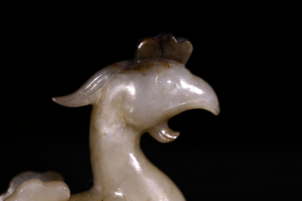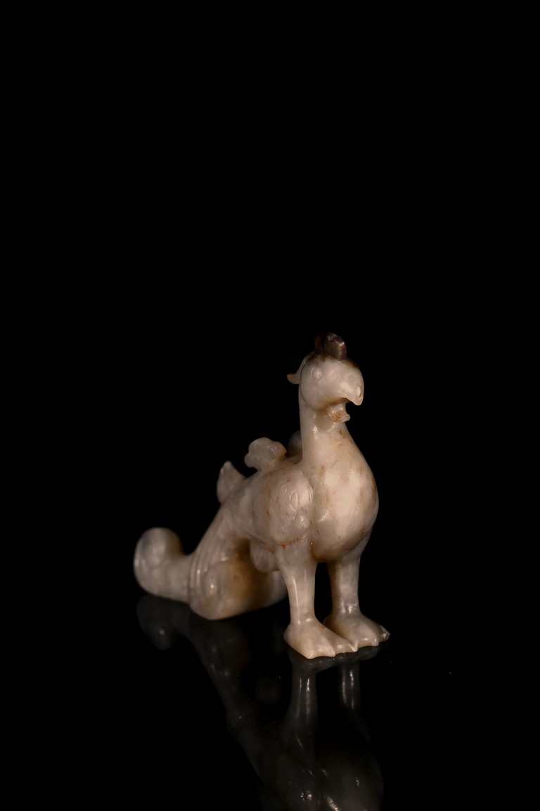 Carved as a standing phoenix looking straight ahead, the feathers and up-curled long tails finely carved with details, the stone is of white celadon tone with russet inclusions. Song Dynasty period.
