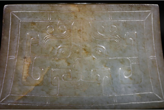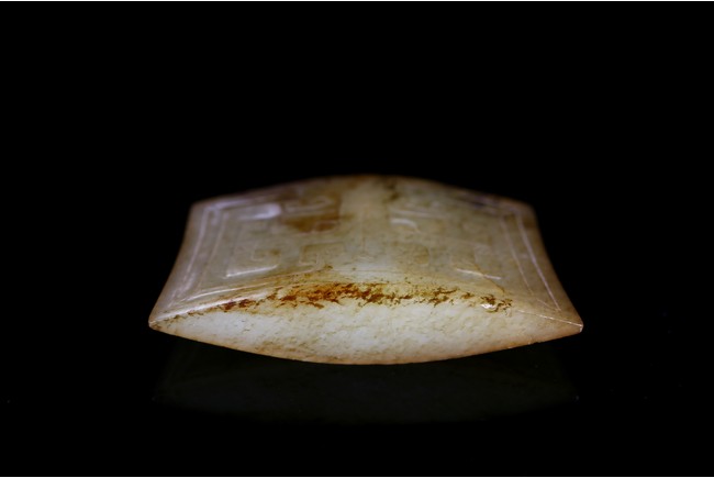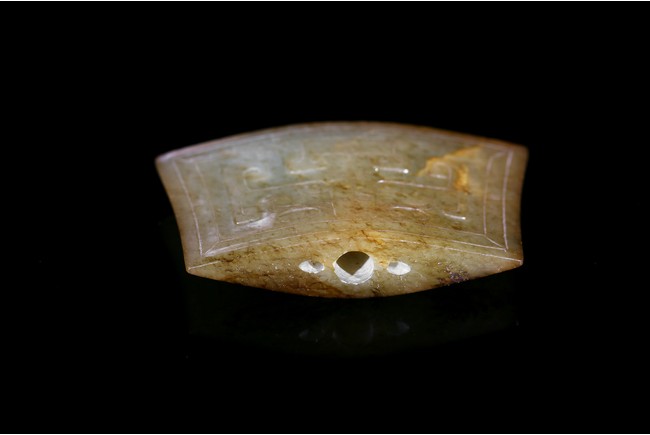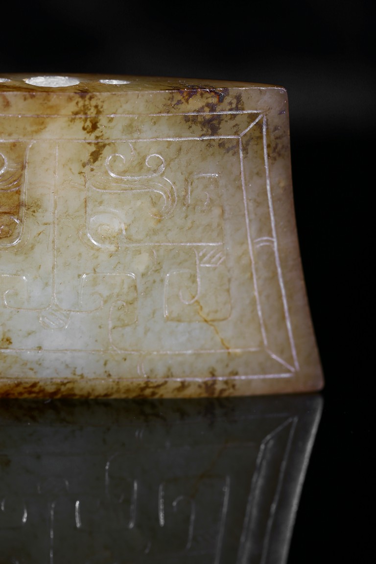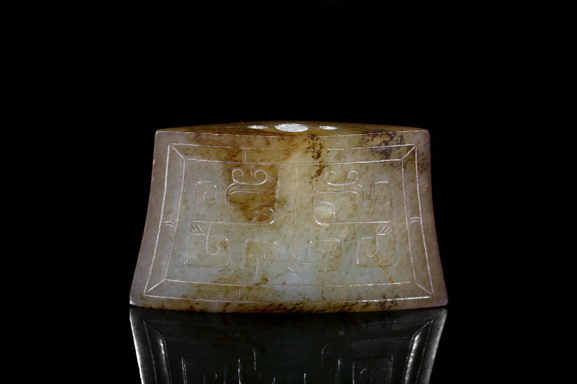 Of trapezoidal outline and lenticular section, both front and reverse finely incised with angular scrolls, the top drilled with three holes, the stone is of mottled translucent white and russet tone. Western Han Dynasty period.