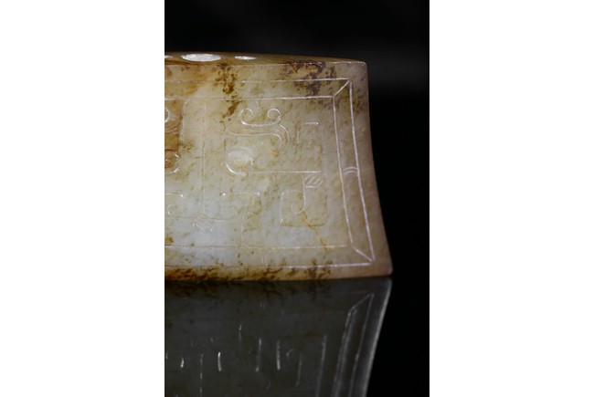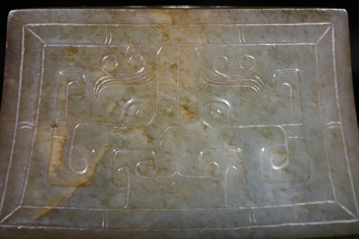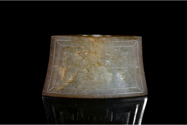 此器面呈梯形, 以陰線幾何化雲紋為飾, 雙面同紋, 小端面中央有一嵌孔, 兩側各有一較小的穿。可參考一類似玉劍飾, 2009年3月於紐約佳士得成交, 拍品號315. 來源: 北加州藏家提供 Compare a similar jade sword fitting, sold in Christie's New York, March 2009, Lot 315.