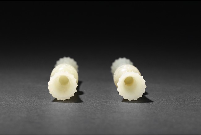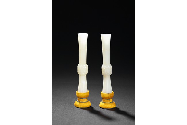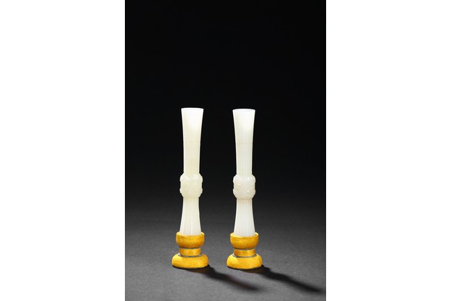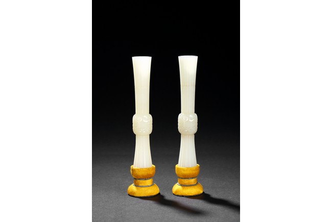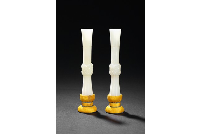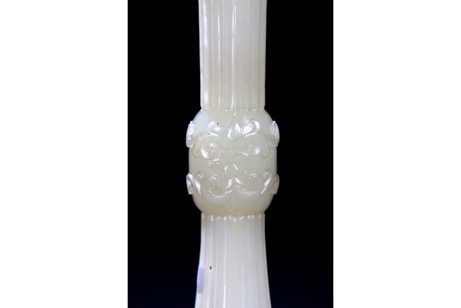 Of slender archaistic gu vessel form, middle section carved with raised foliate scrolls, the stone is of even white tone.