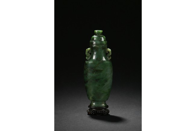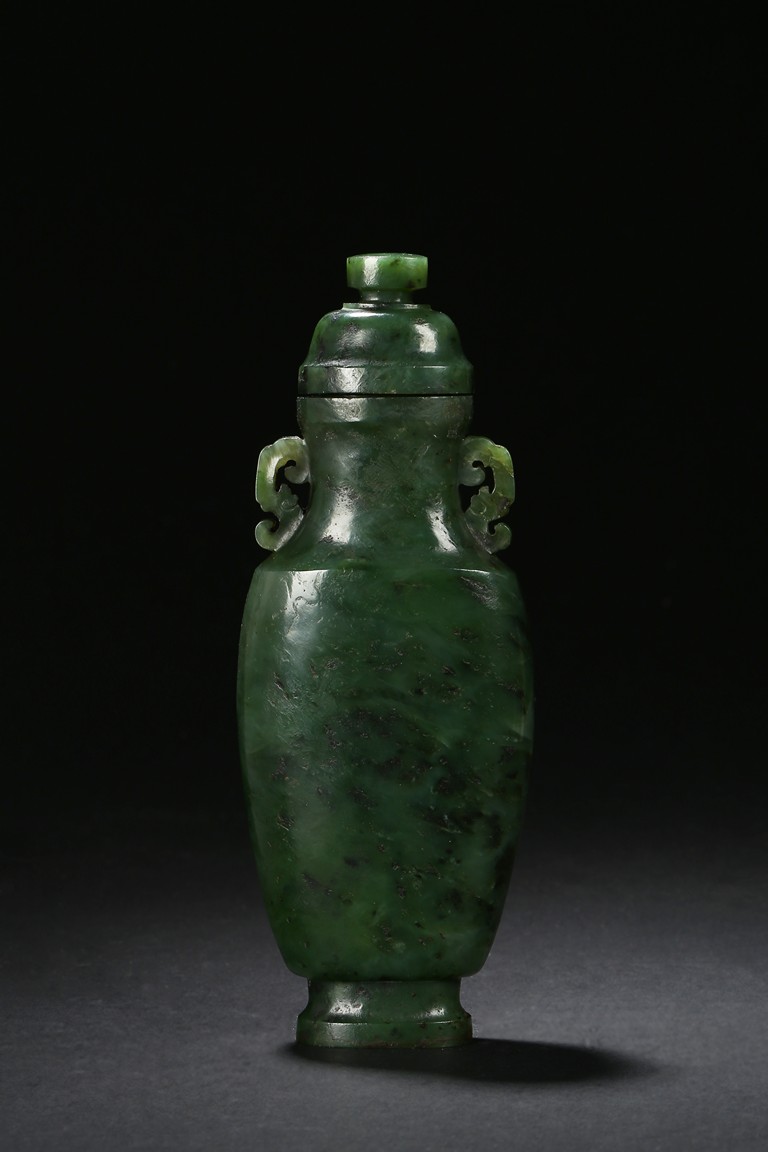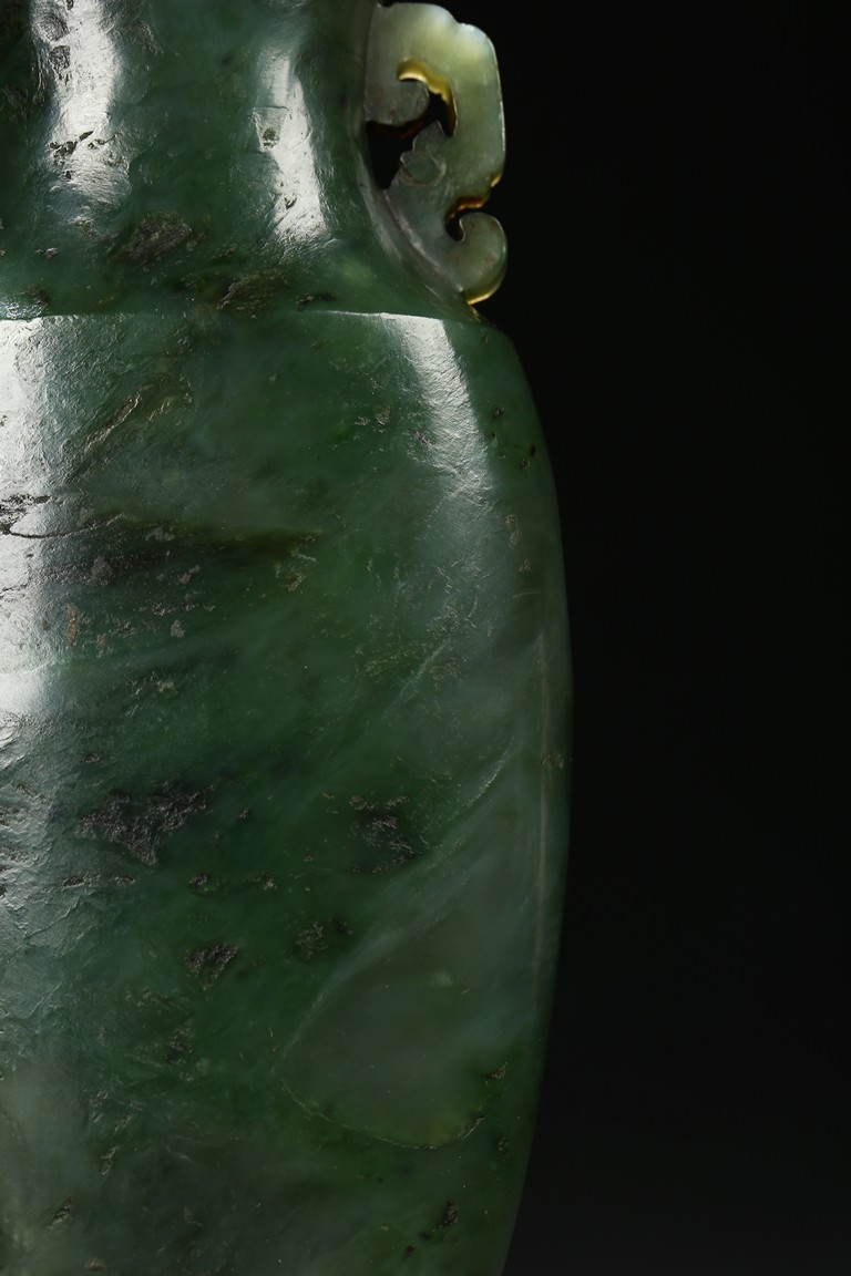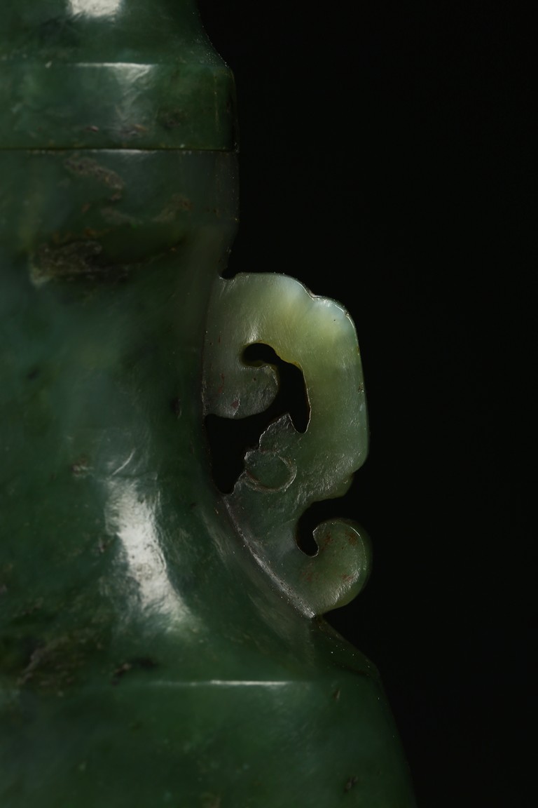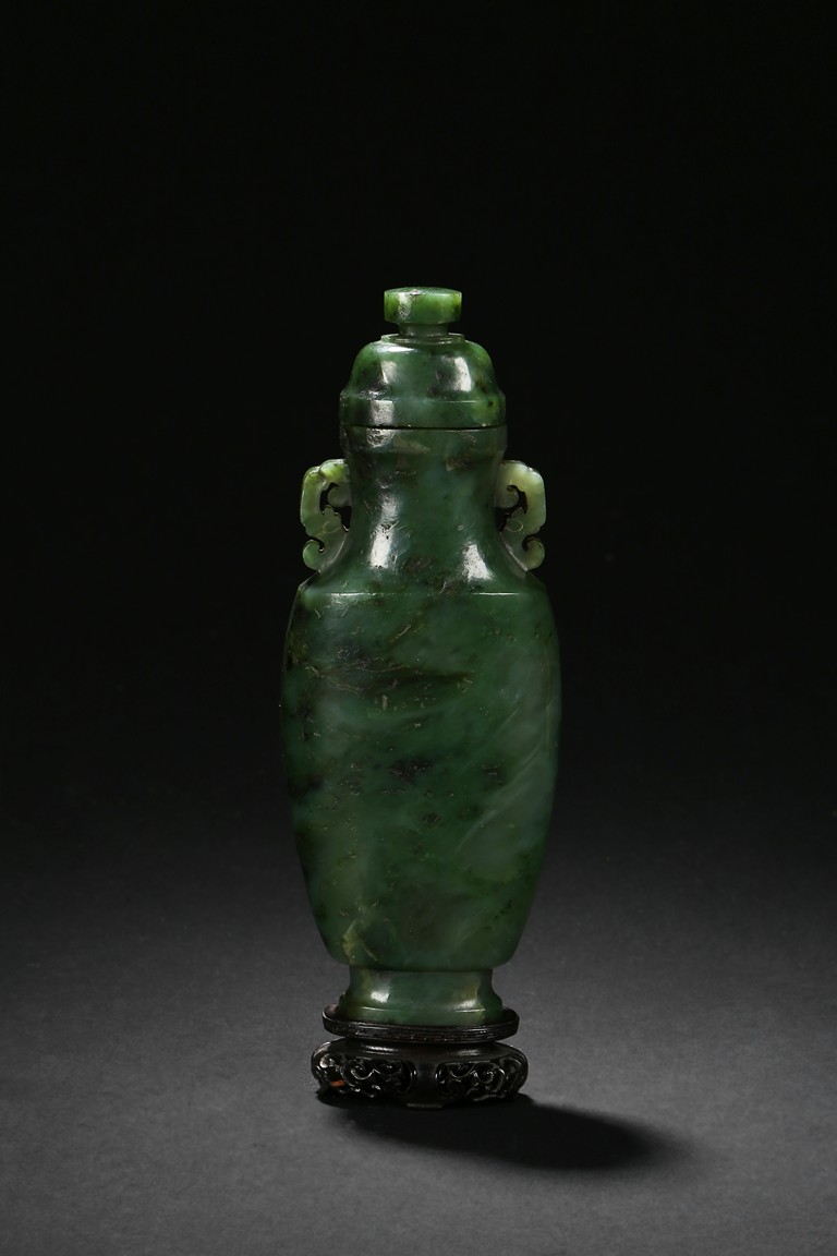 Of plain tapering body and oval section, the neck carved and pierced with two fretwork handles, with matching domed cover, in dark green tone with gray mottling and black inclusions, accompanied with wood stand. Qing Dynasty period.