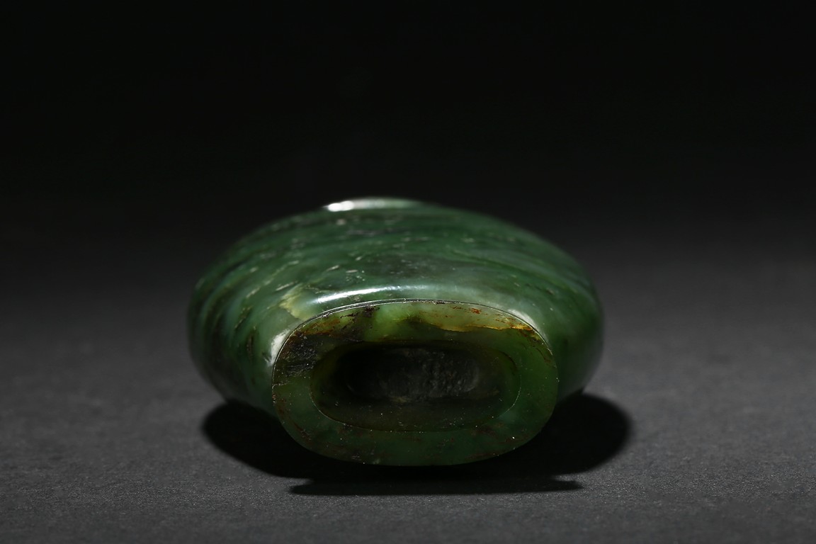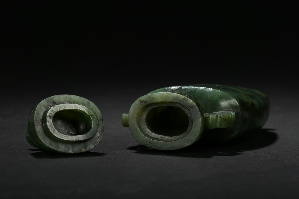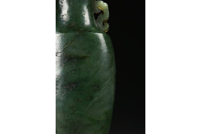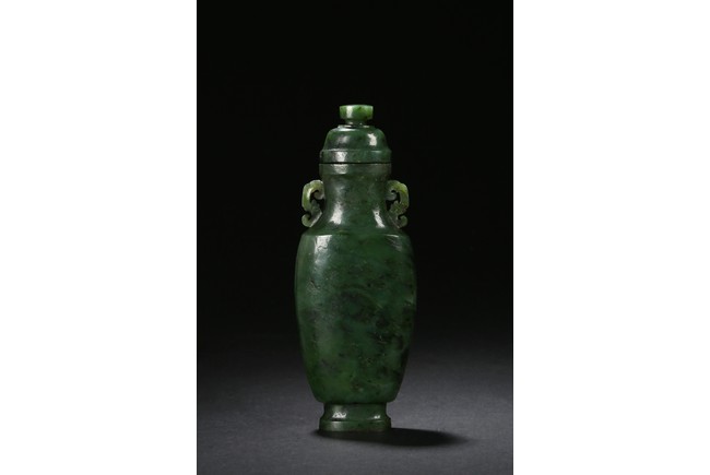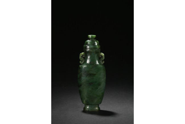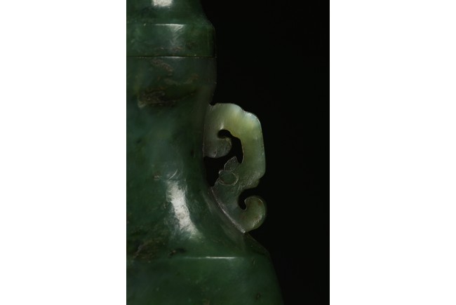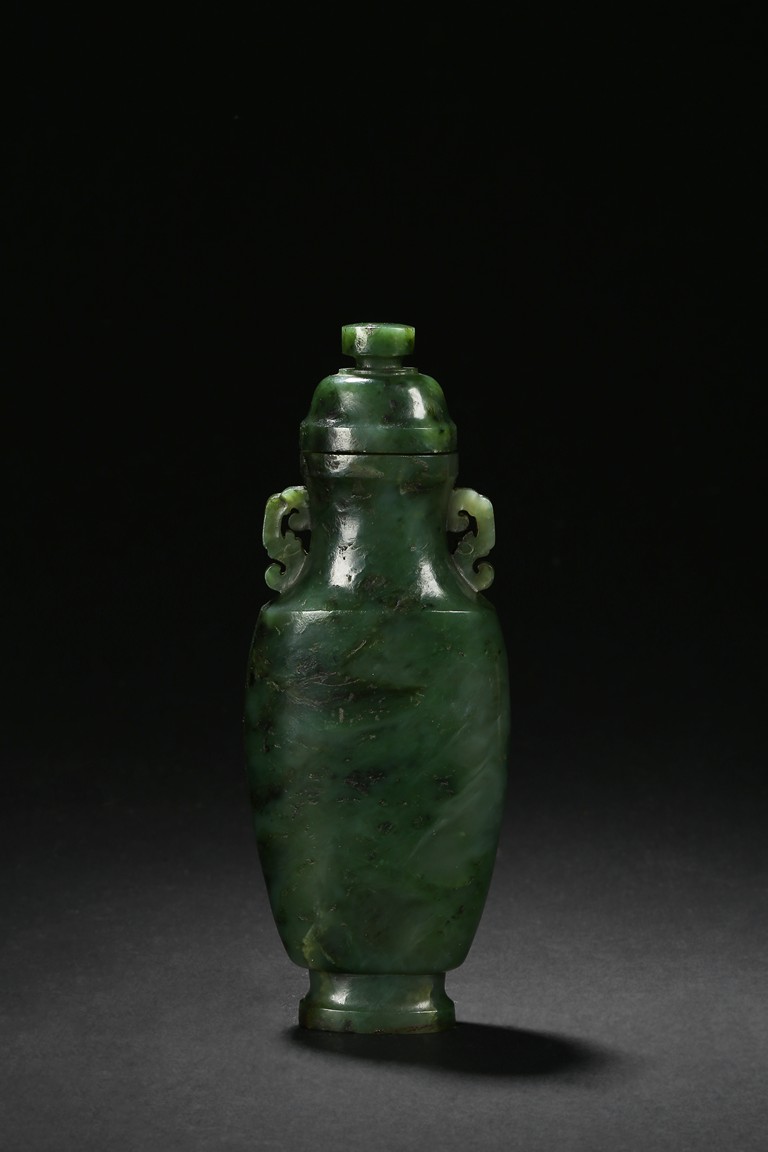 Of plain tapering body and oval section, the neck carved and pierced with two fretwork handles, with matching domed cover, in dark green tone with gray mottling and black inclusions, accompanied with wood stand. Qing Dynasty period.