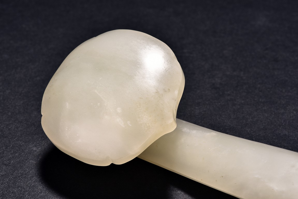 Of plain design, the ruyi scepter is carved with a ruyi-shaped terminal and an arched shaft. The stone is of smoothly polished, semi-translucent even white tone. Qing Dynasty period.