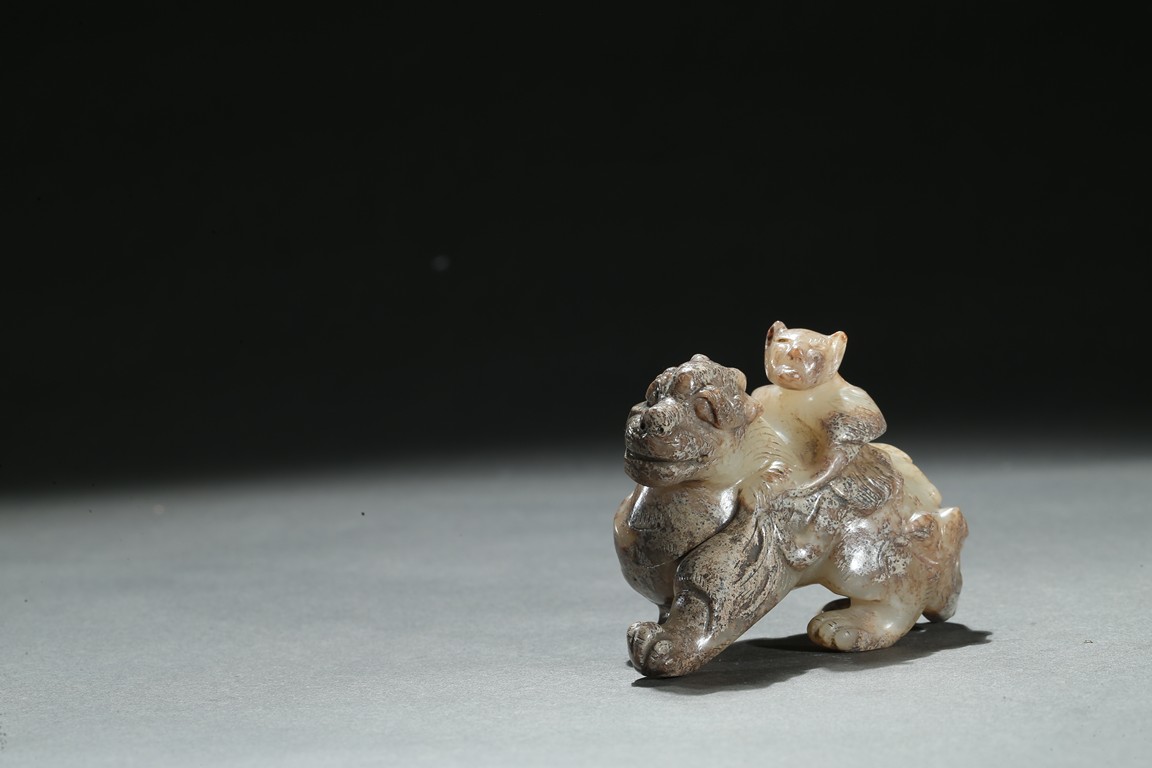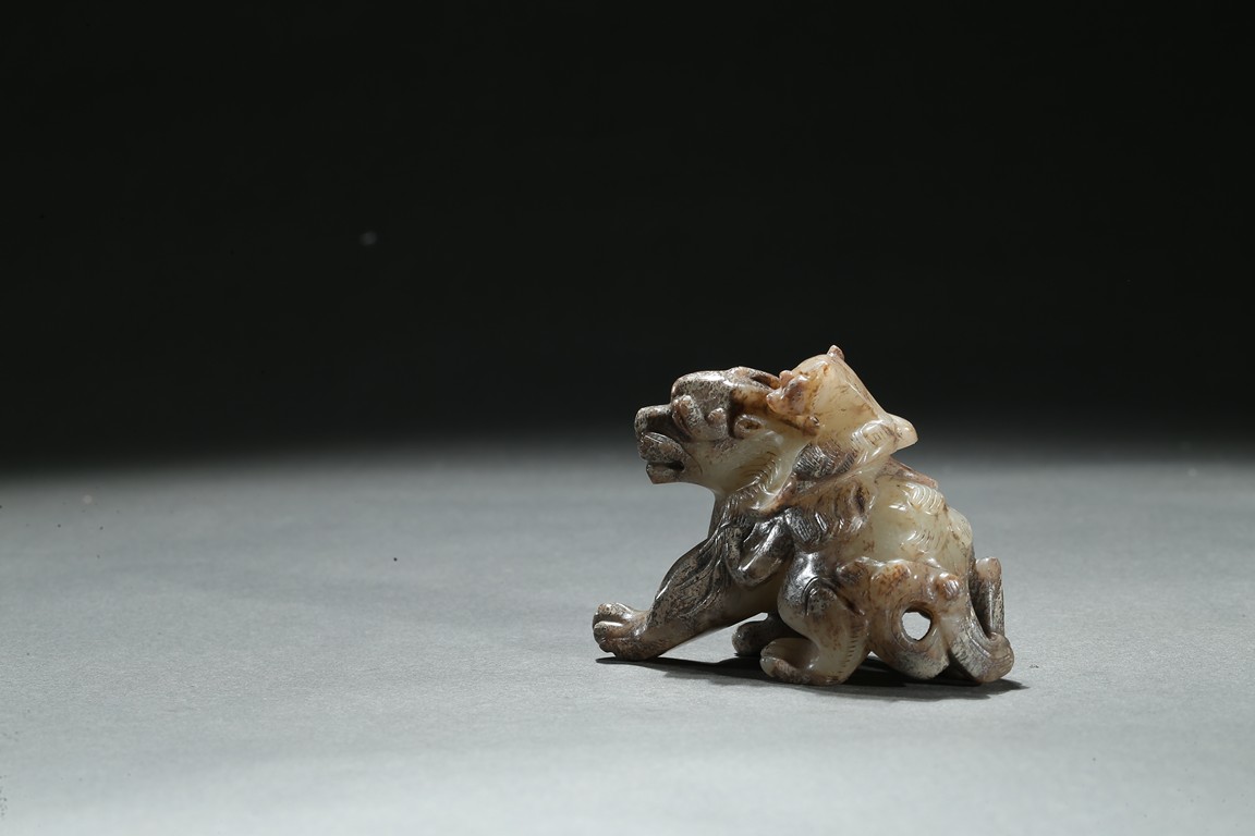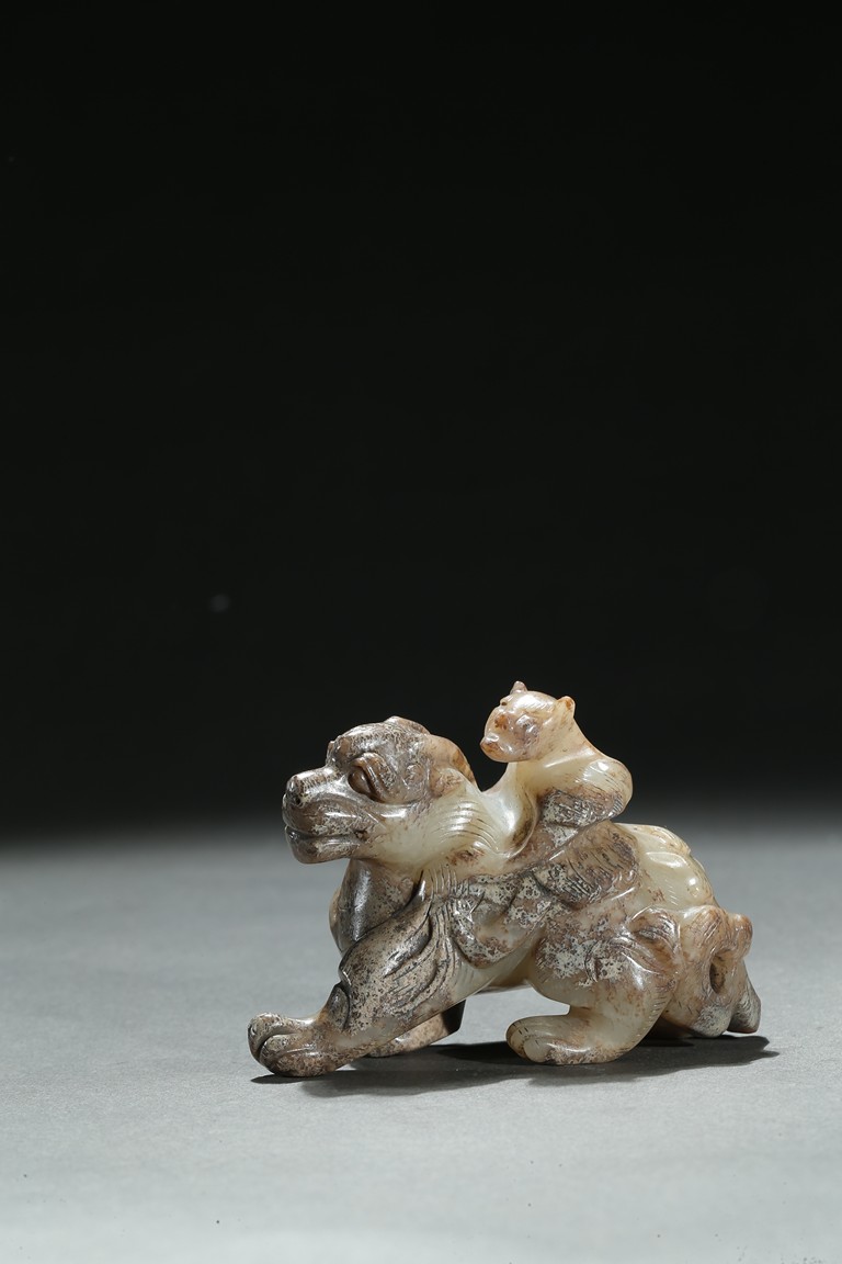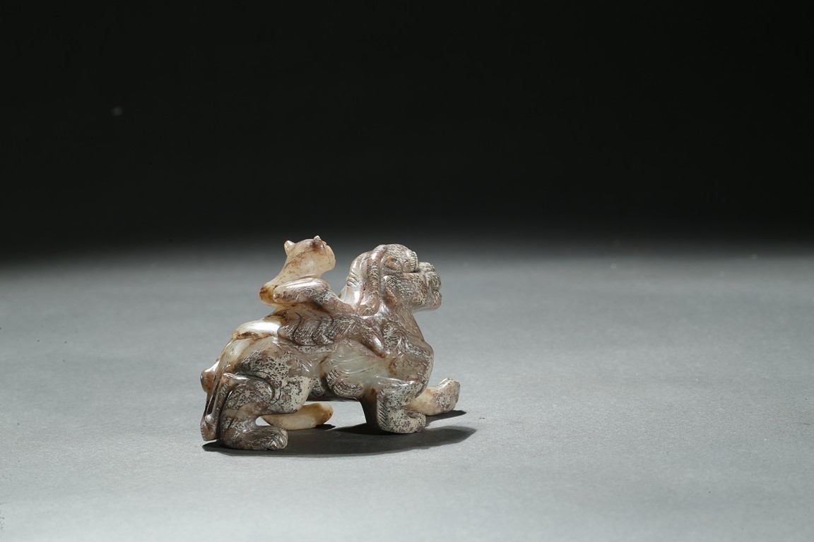 Finely carved depicting a mythical beast bixie issuing from muscular front legs, finely incised with lines, head slightly turned to left, with benigh expression, with bifurcated tail, supporting a baby bixie on the back, the pale celadon stone with calcified opaque grey inclusions. Han Dynasty period.