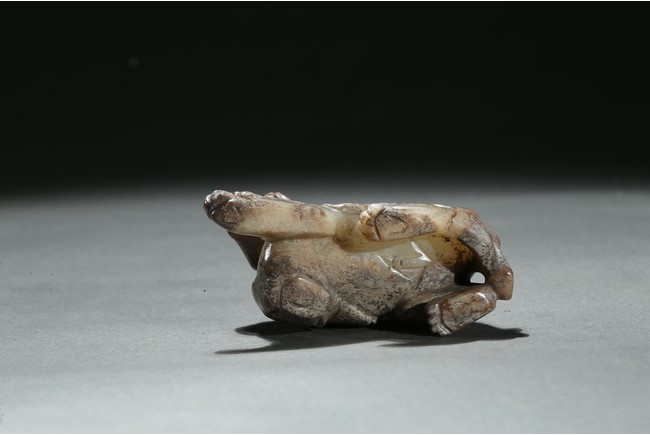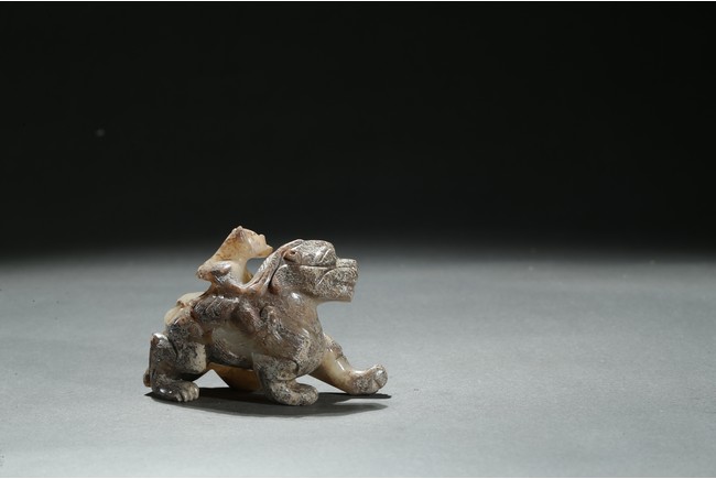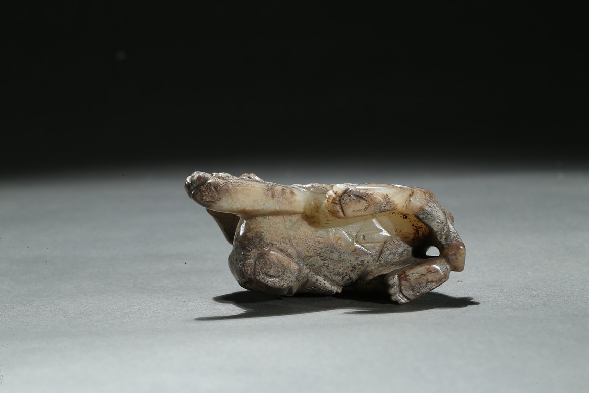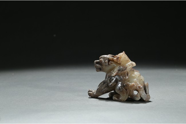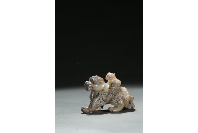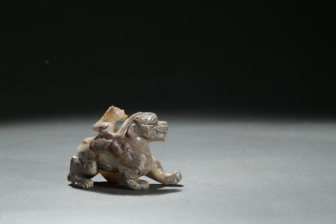 Finely carved depicting a mythical beast bixie issuing from muscular front legs, finely incised with lines, head slightly turned to left, with benigh expression, with bifurcated tail, supporting a baby bixie on the back, the pale celadon stone with calcified opaque grey inclusions. Han Dynasty period.