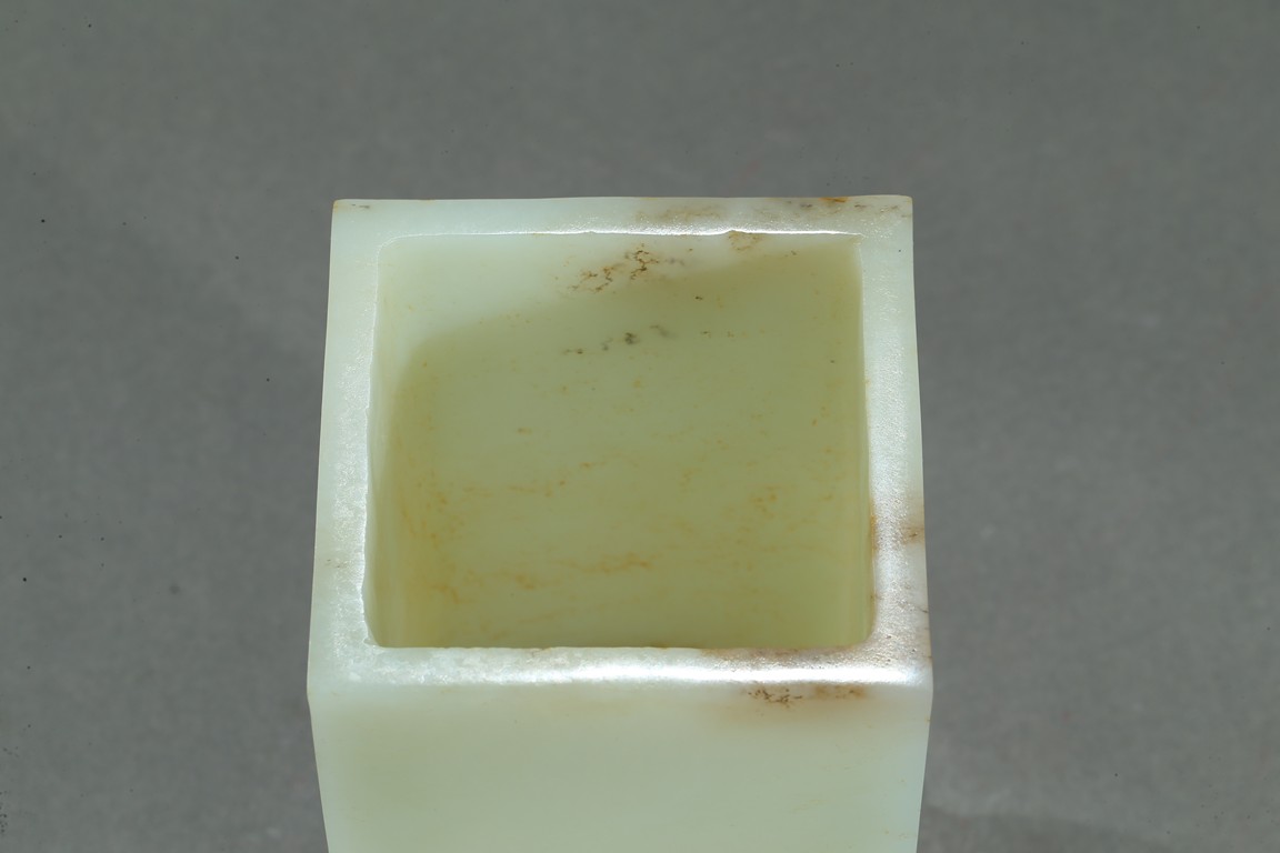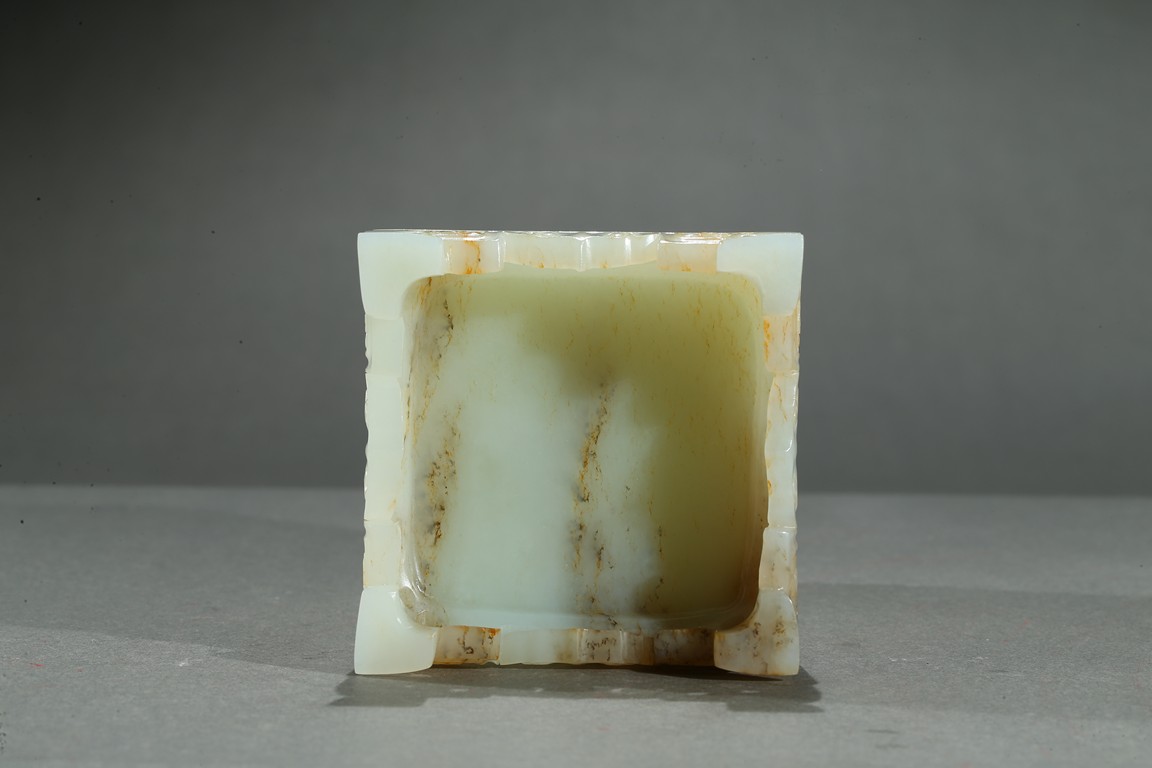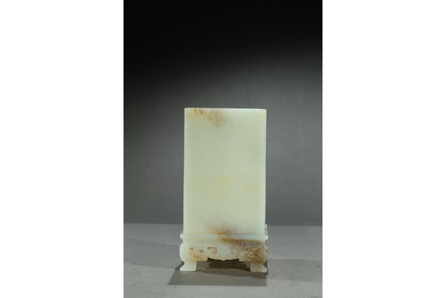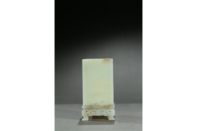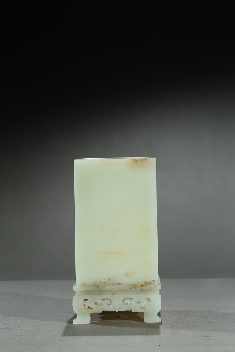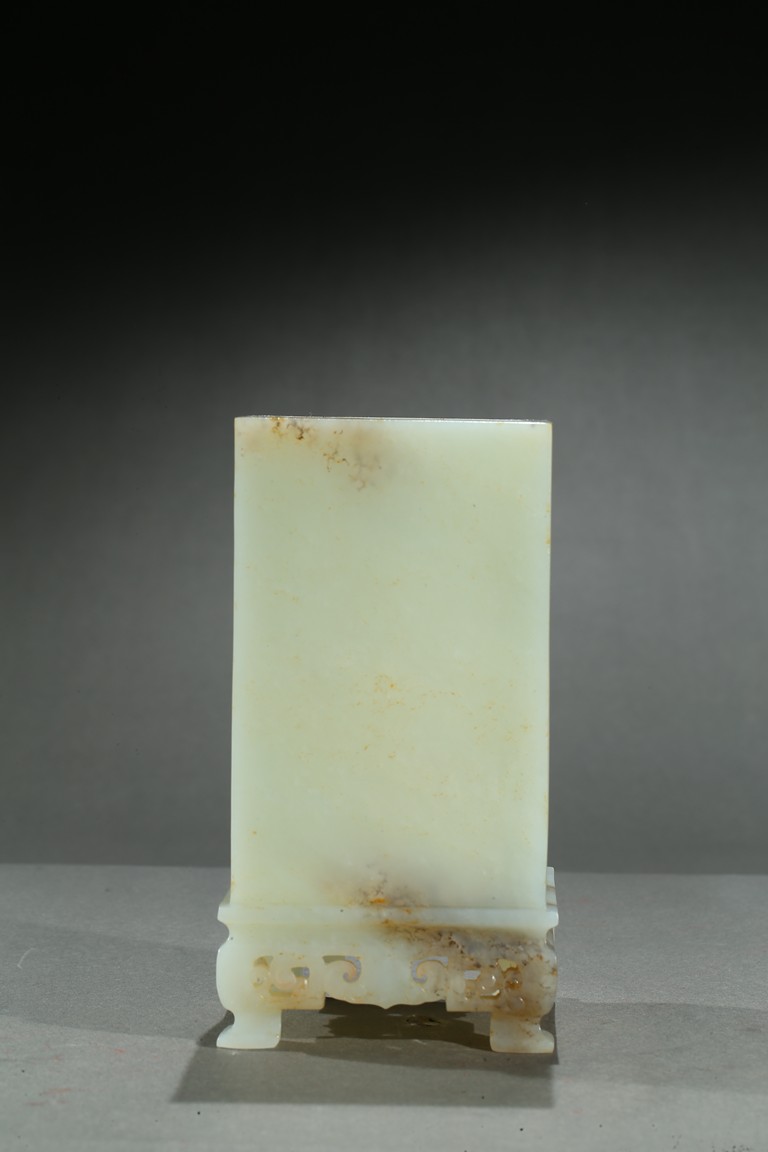 Of square section and supported on four foot, the linked stand carved in openwork with ruyi scroll and key-fret pattern, the stone is of greenish-white tone with minor russet inclusions. Qing Dynasty period.
