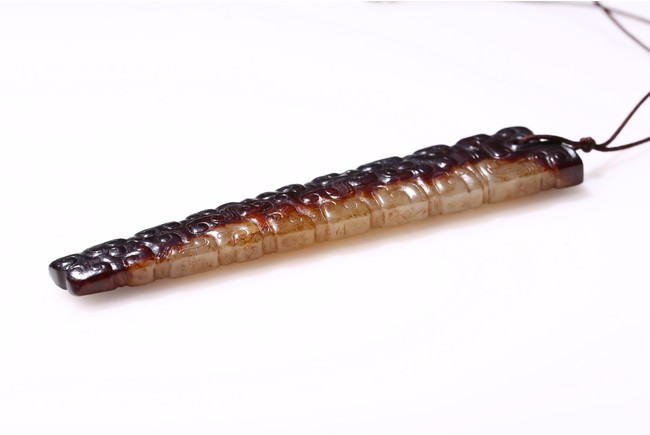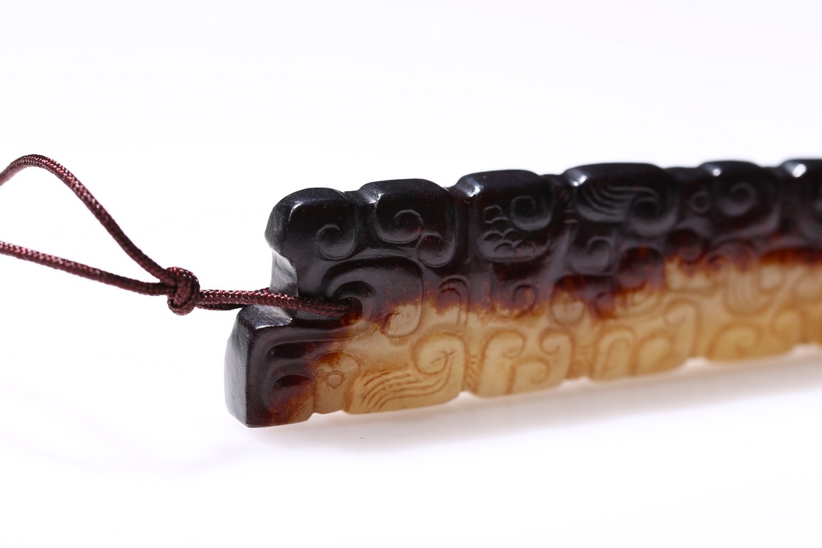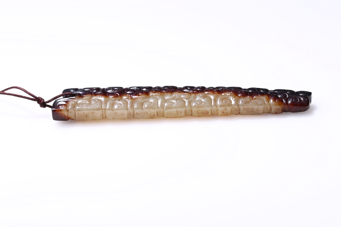 The straight form pendant is overall carved with scrolled pattern, with one end tapering as tail, the other end as the dragon head drilled with a hole for string attachment, the stone is of celadon tone with dark brown and black inclusion. Han Dynasty period.