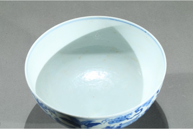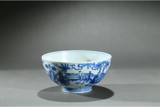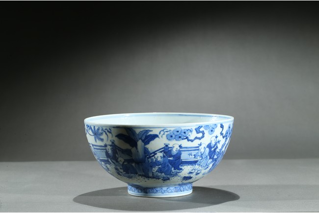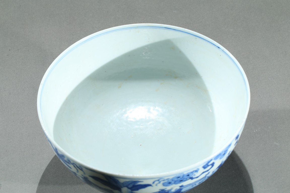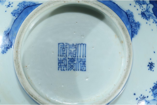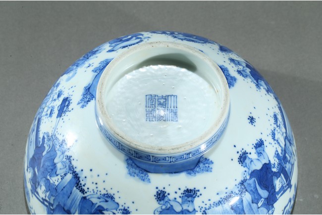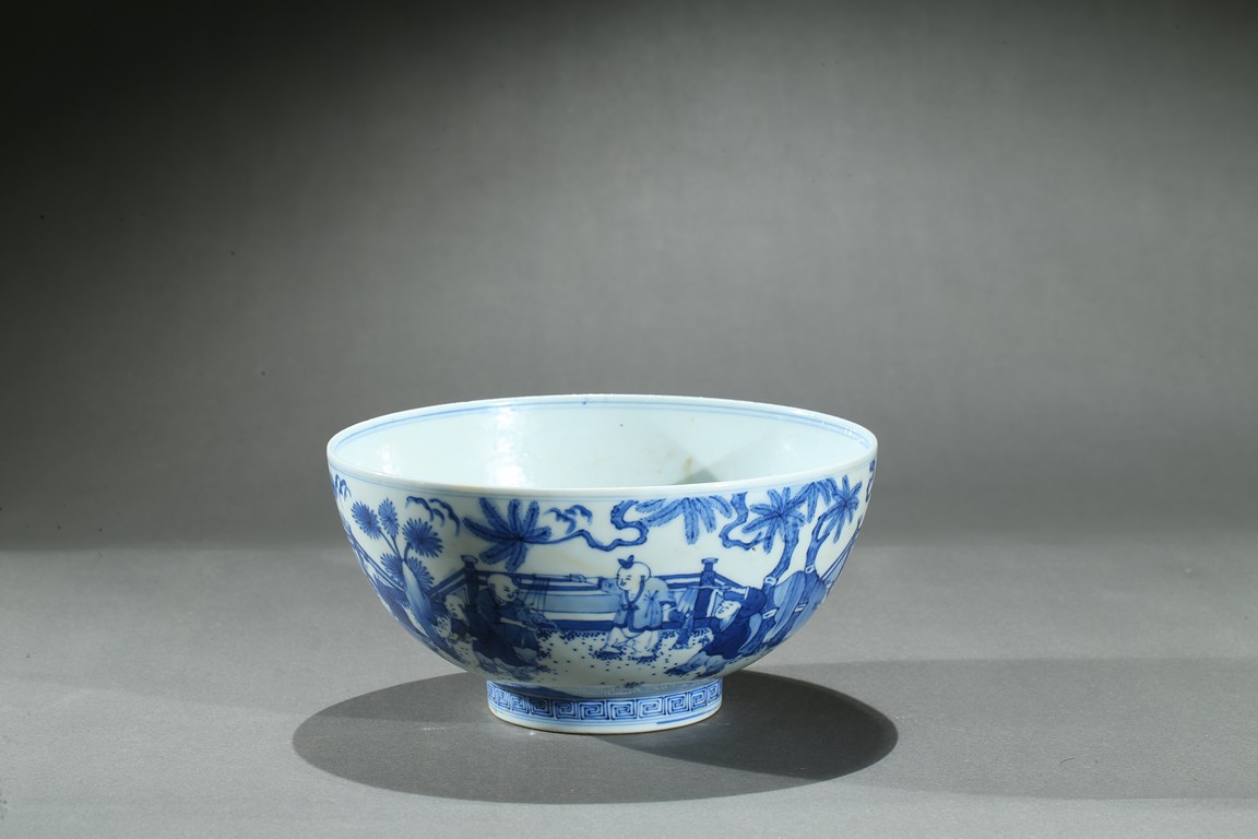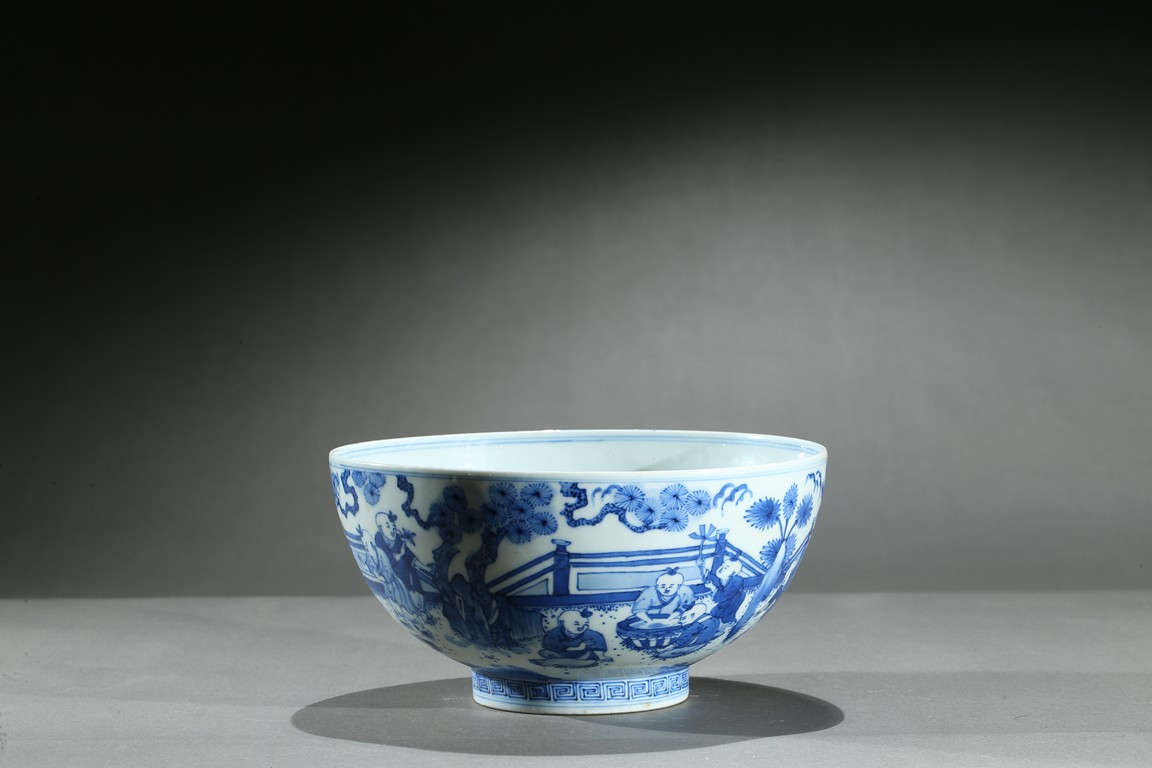 Of rounded sides, the exterior painted in underglaze cobalt blue with a continuous scene of boys playing in a garden. A double line encircles the mouth, while a key fret band encircles the foot. The base with six character JIAQING mark. Qing Dynasty period.
