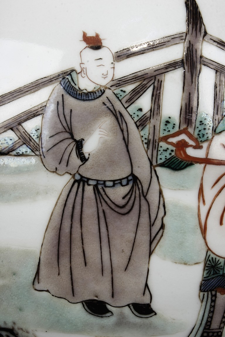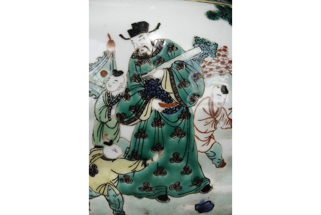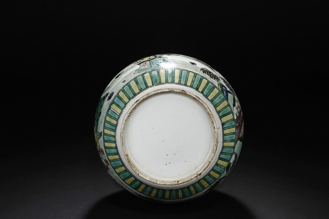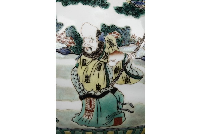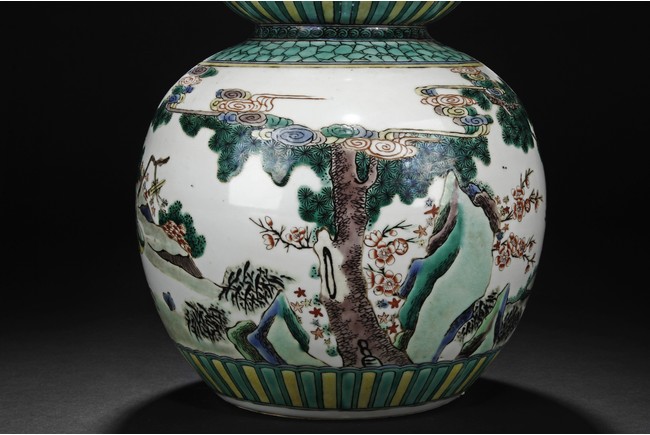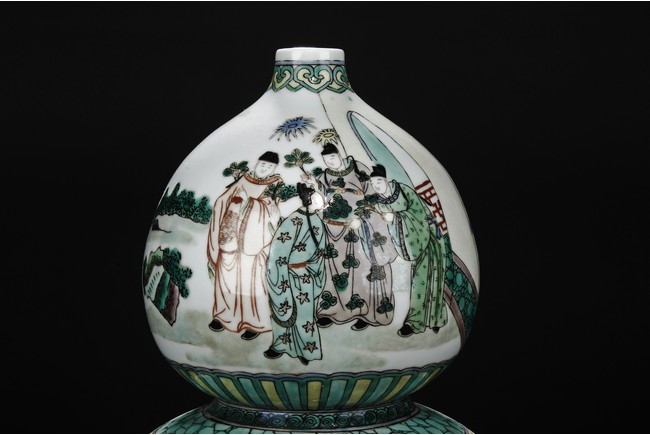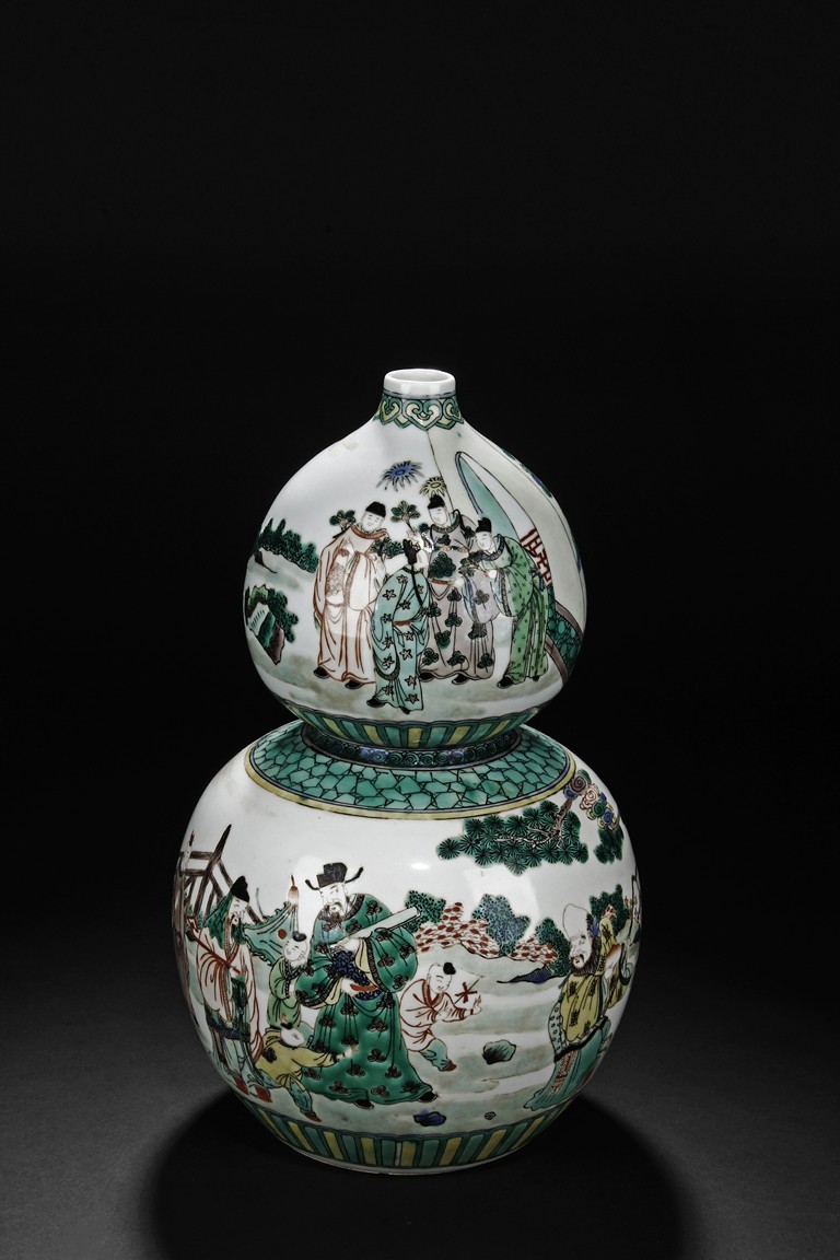 Of double gourd form, the wucai vase depicts garden and outdoor scenery, with Fu, Lu, and Shou Immortals and officials on the outside, surrounded by pine trees, plum flowers, and viewing stones on the lower gourd, and a group of scholars conversing in a garden on the upper gourd. Qing Dynasty period.