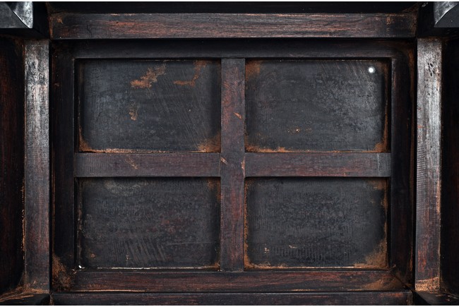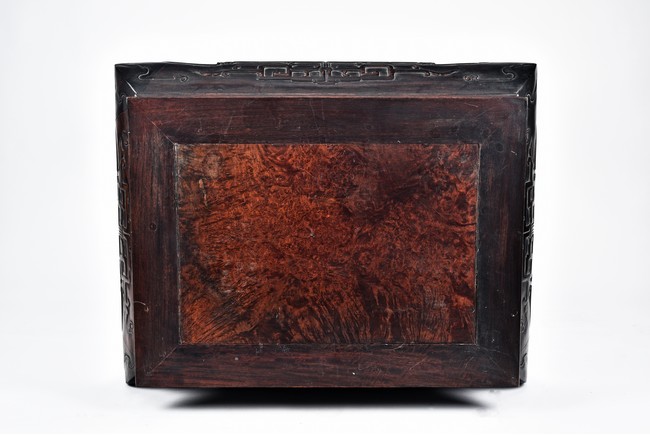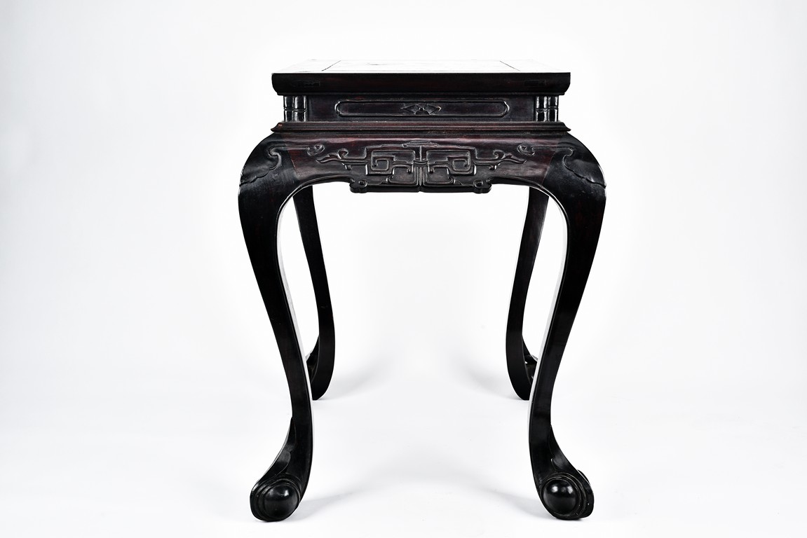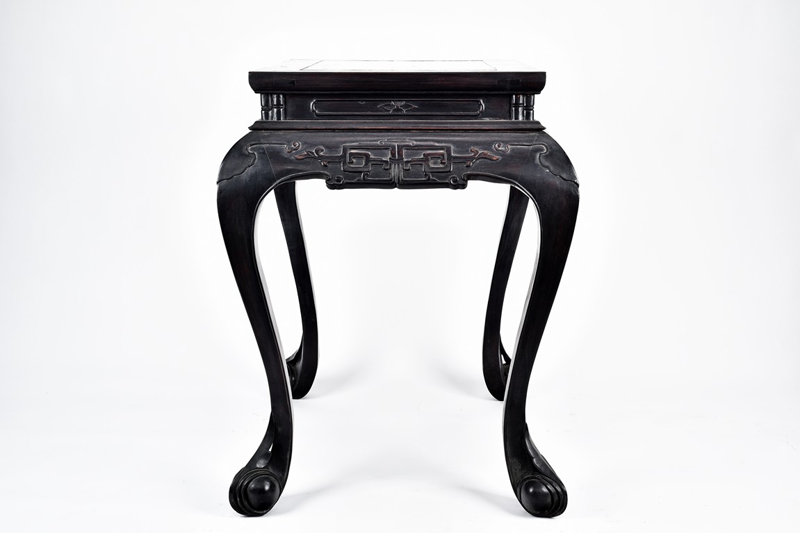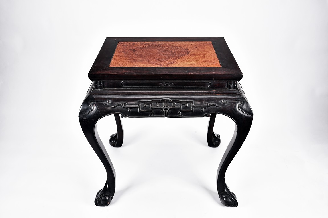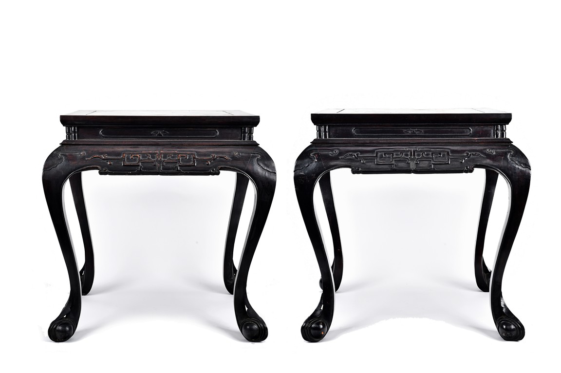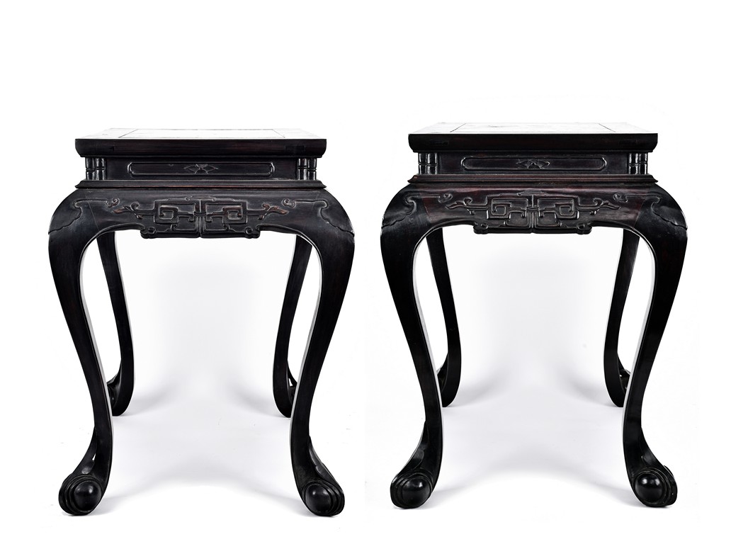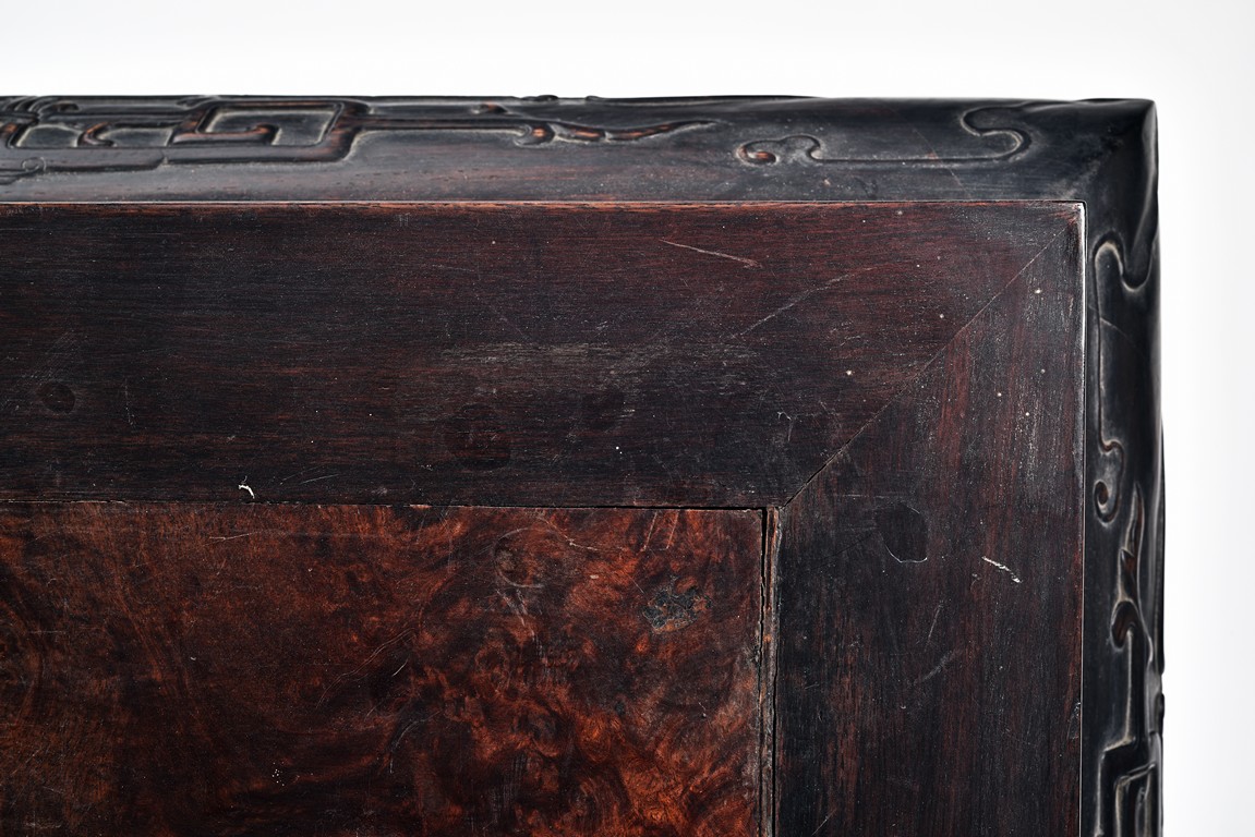 Each table top set with burl wood panel within square frame, above a recessed waist with decoration, the further apron and spandrels carved with stylized chilong in shallow relief. The table is raised on four three-curved legs terminating in mythical beast foot. The burl panel is of attractive spiralling grain. Late Qing Dynasty period.