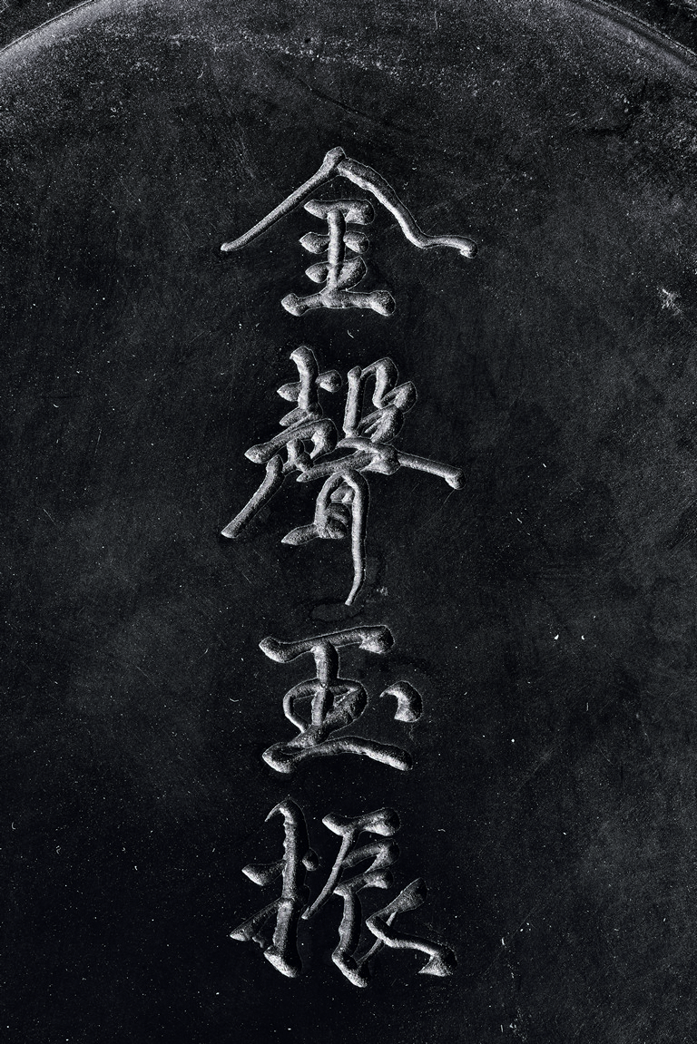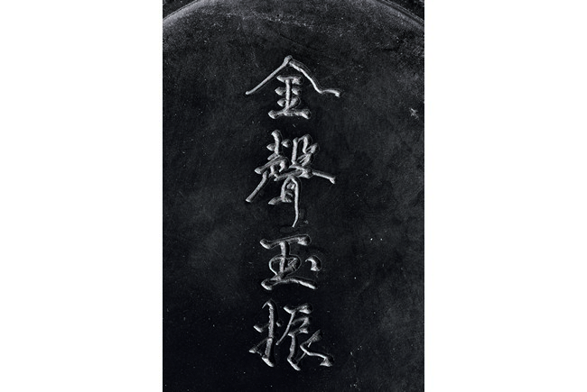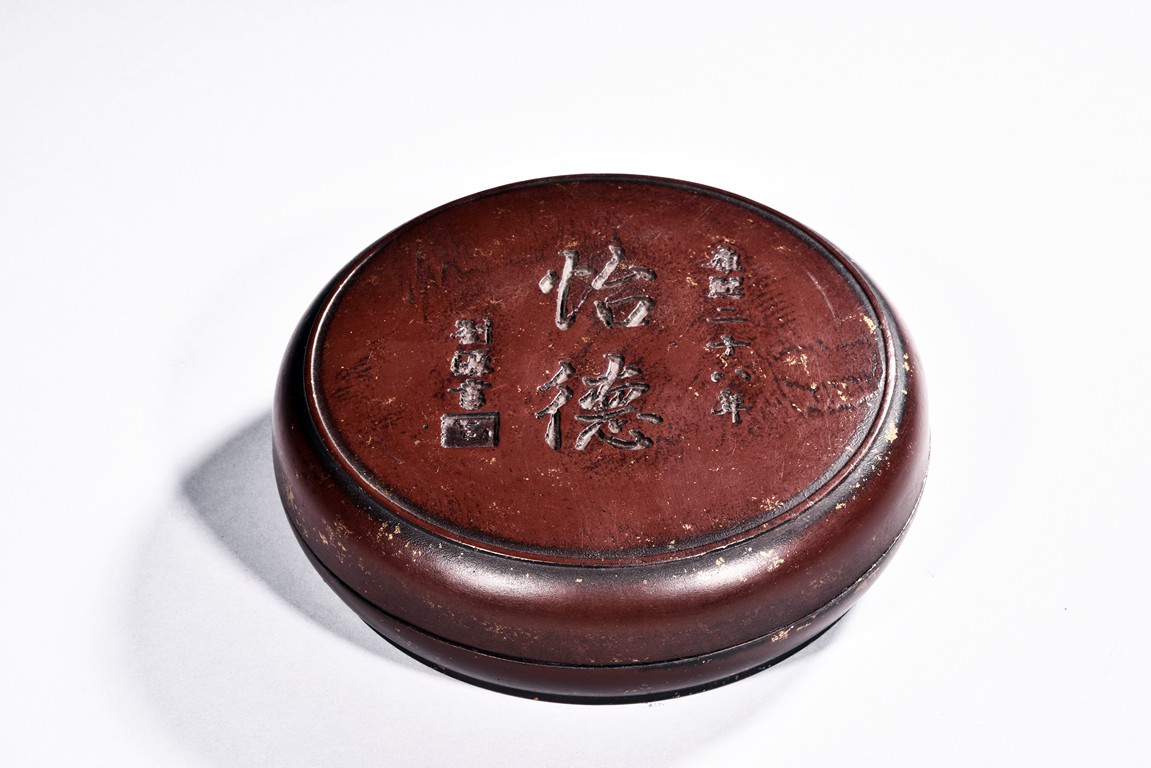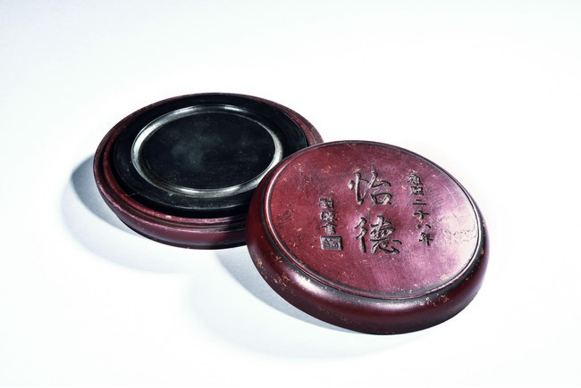 Of circular shape, the inkstone with four character inscription. Accompanied with a case with inscription.