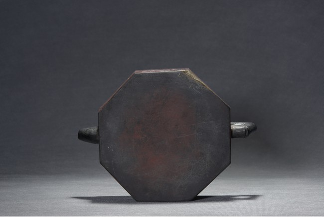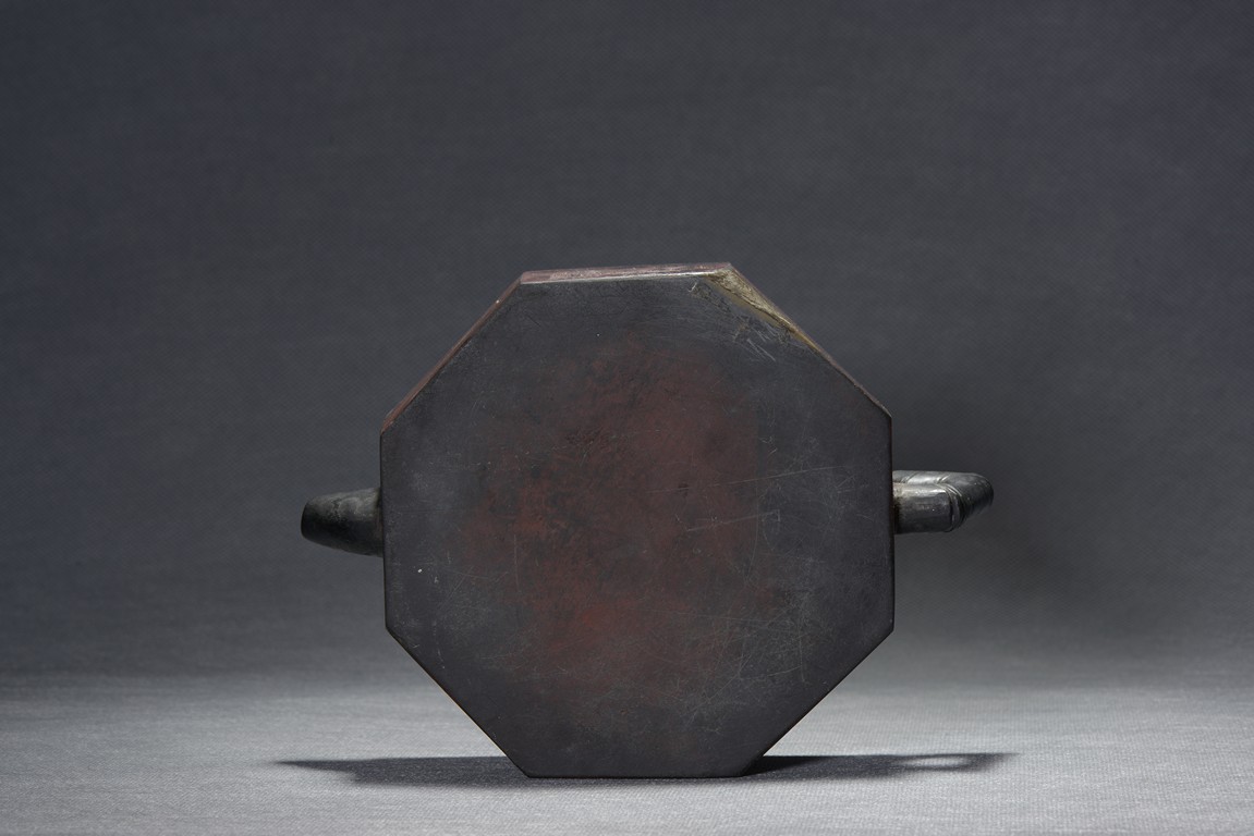 Of octagonal form, the teapot inkstone is carved with plum as finial, with short rectangular spout, bamboo formed handle, the body with fine patina. Qing Dynasty period.