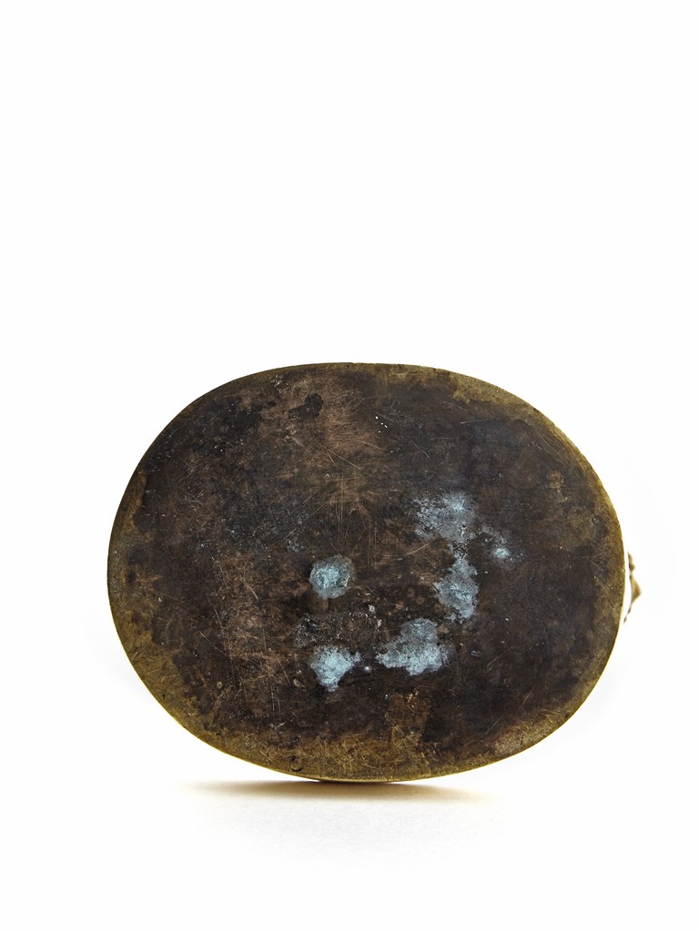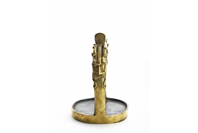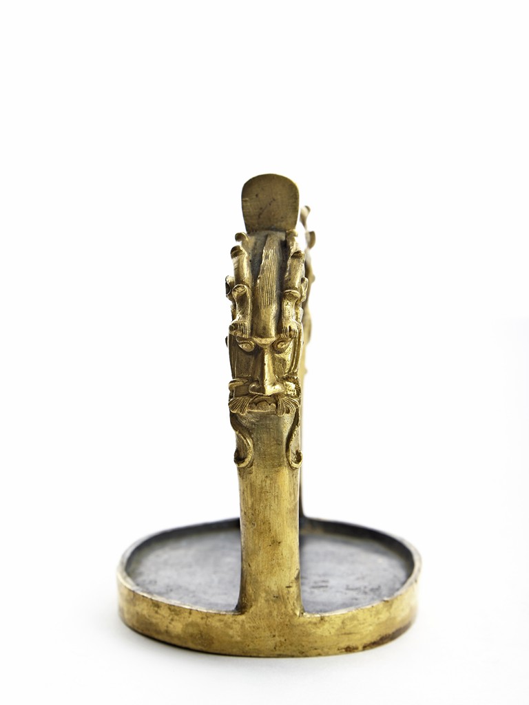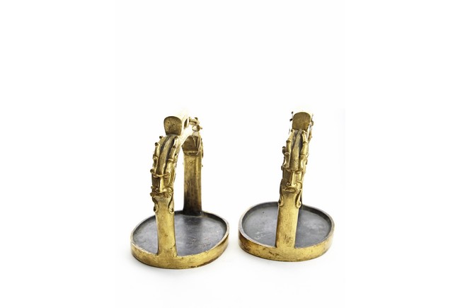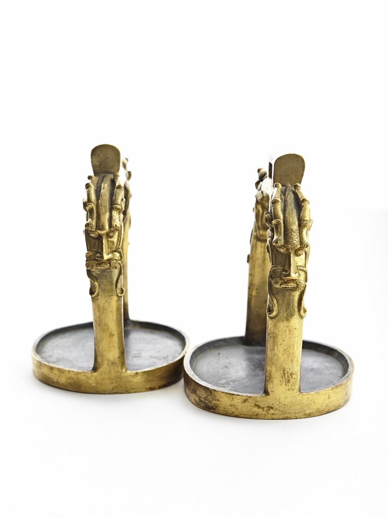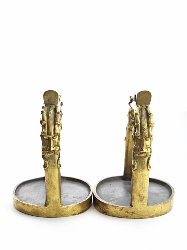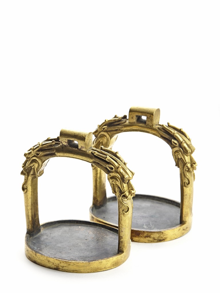 Each stirrup is cast in high relief with two ferocious dragon heads facing opposite sides, divided by a rectangular cartouche pierced for suspension. Qing Dynasty period.