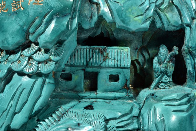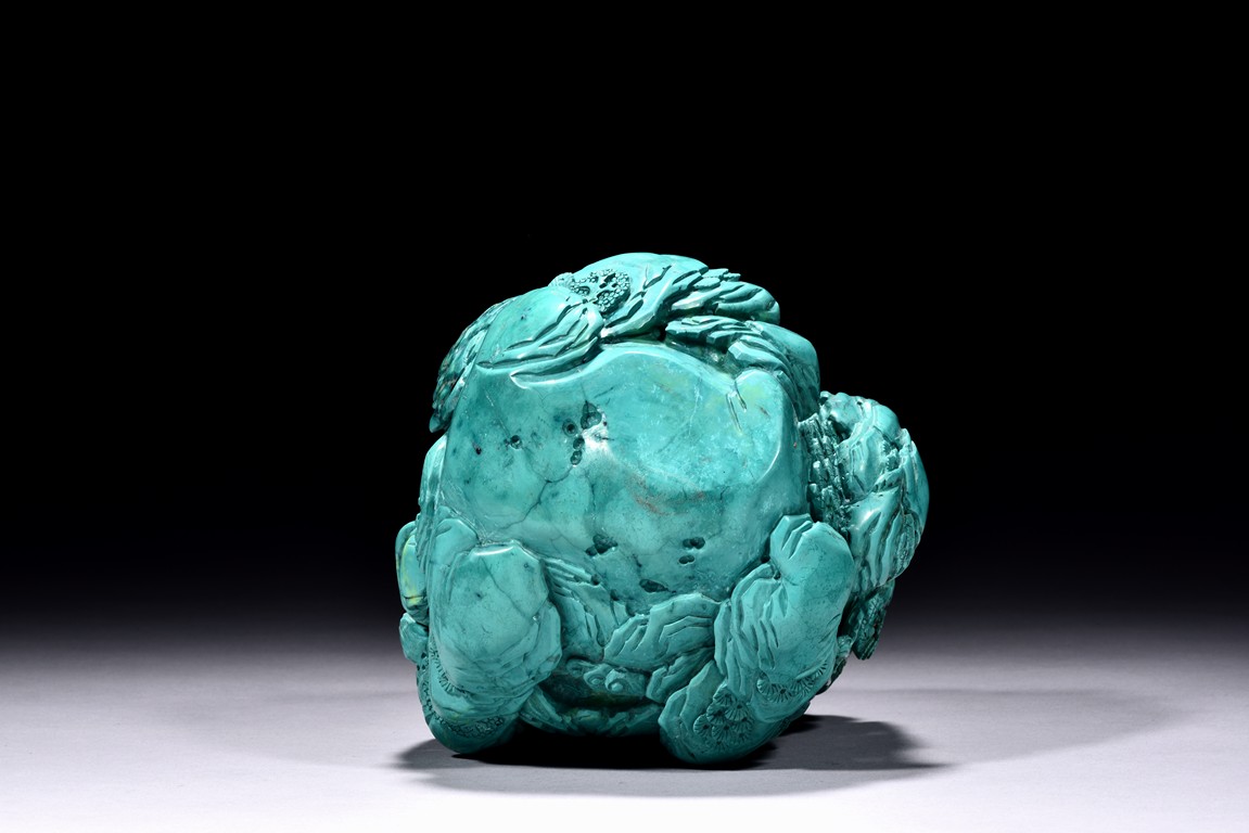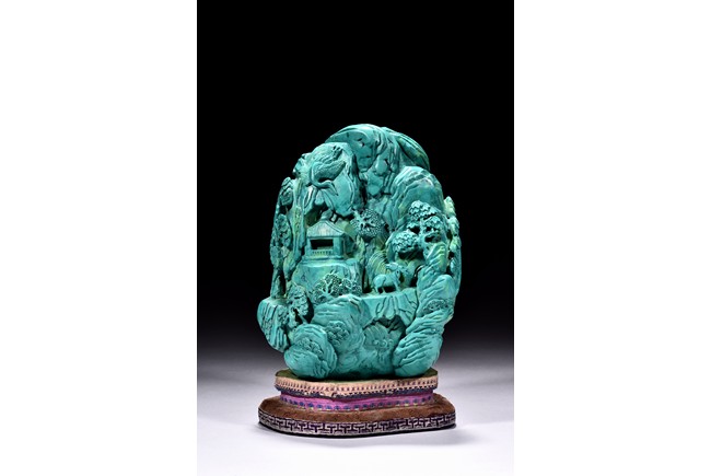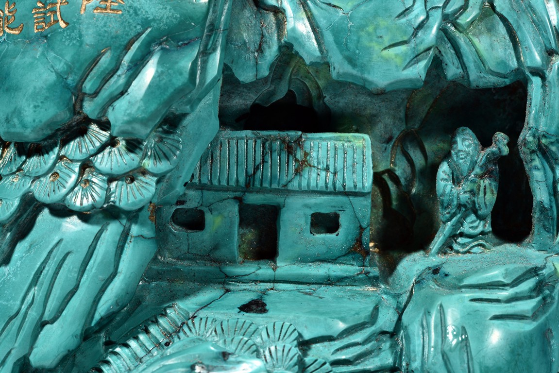 Modelled in the form of ovoid boulder, it is carved with a deep mountain setting with an elderly gentleman riding a donkey accompanied by an attendant walking along a rocky cliff pathway, above him with an ascending stair path leading to a residence, with an elderly figure holding a staff standing nearby. The top left is incised in gilt with an imperial poem on the rock surface. The reverse is carved with similar setting with a pavilion on cliff below a crane in flight, above a deer with head turned back looking over the crane.