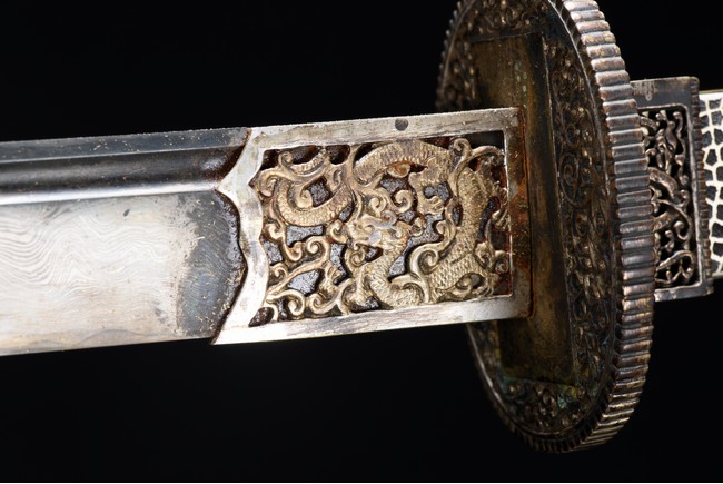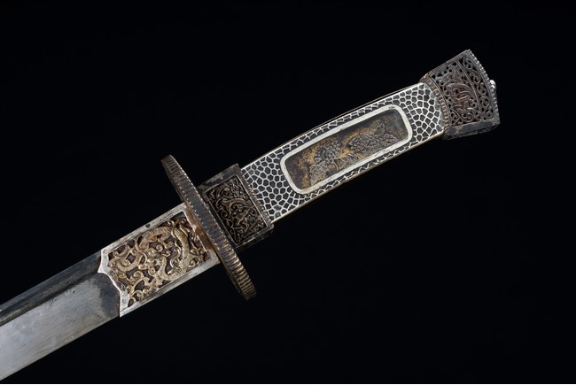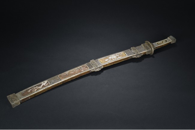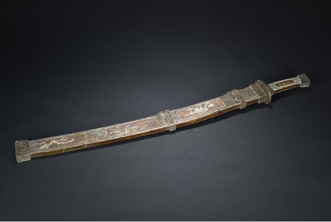 The metal blade slightly curved, its scabbard and handle wrapped in imitation of shagreen with and mounted with bronze reticulated with scroll pattern. Qing Dynasty period.