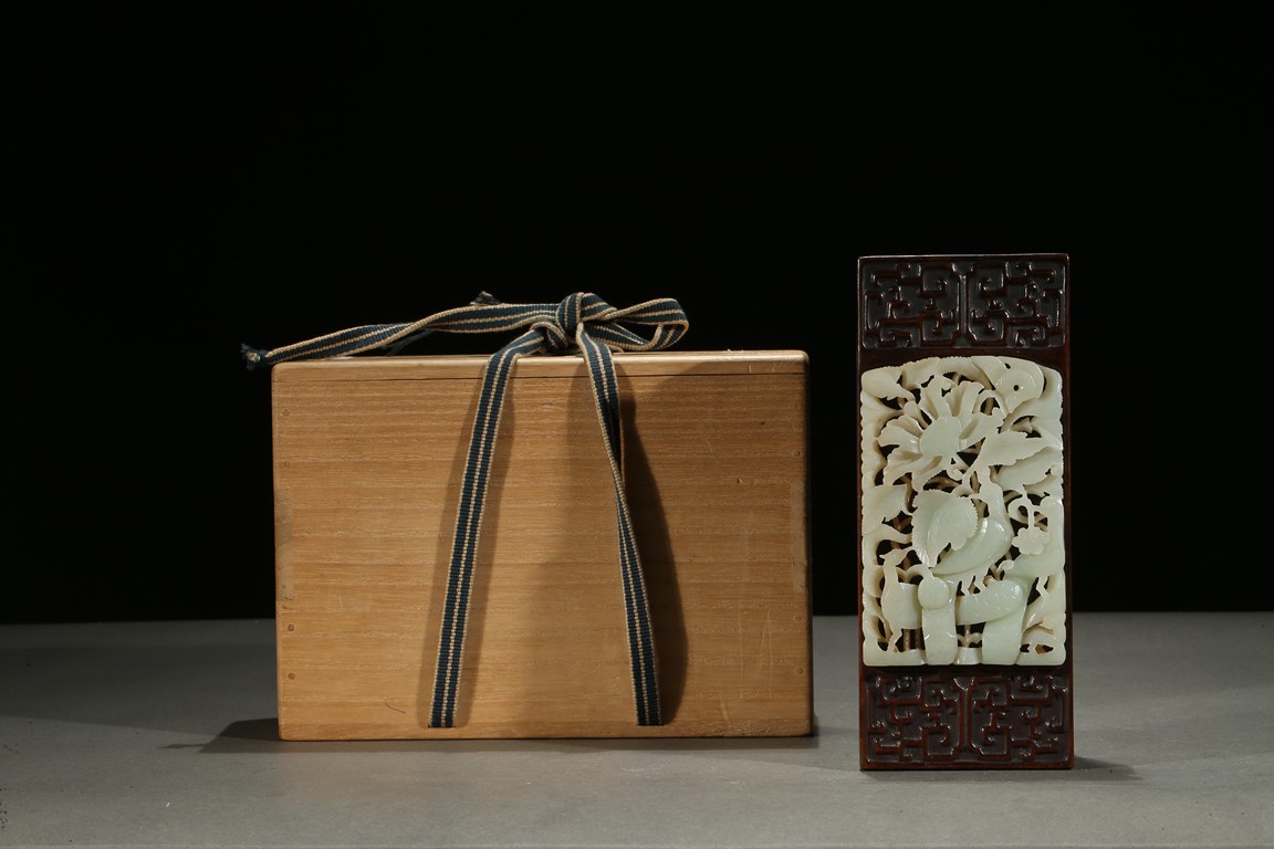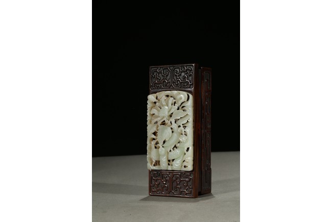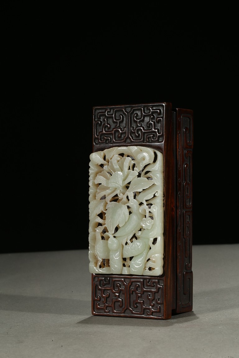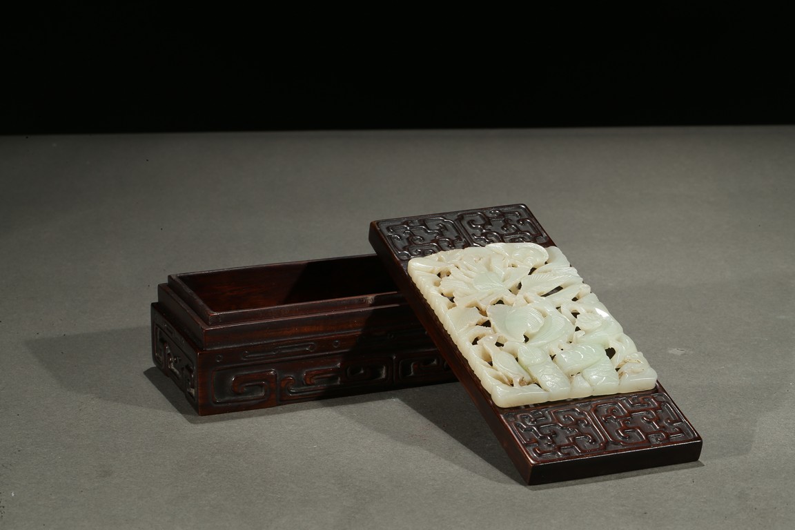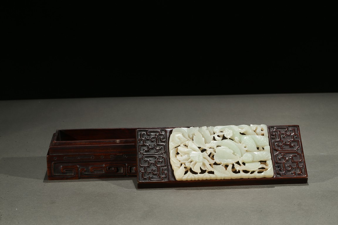 The rectangular box is embellished with a delicately reticulated white jade panel depicting birds and peonies, the wood cover and sides carved with stylized cloud design in relief. Qing Dynasty period.